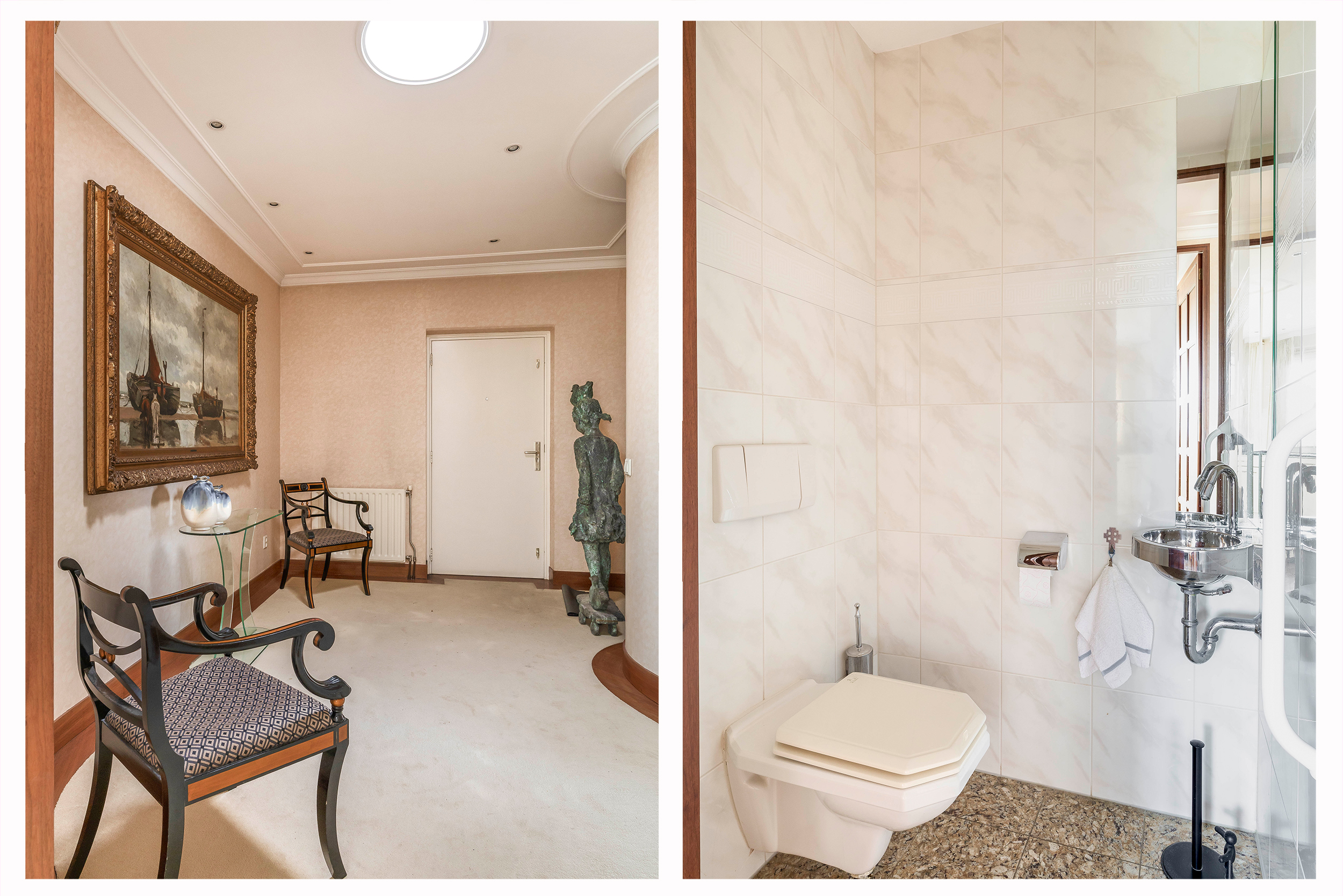 As you enter the penthouse, you are greeted by a spacious hallway that leads to a built-in storage closet, a chic guest toilet, the generous living room, and the kitchen. The kitchen, designed in an elegant U-shaped layout, is equipped with high-end built-in appliances and a practical internal pantry.