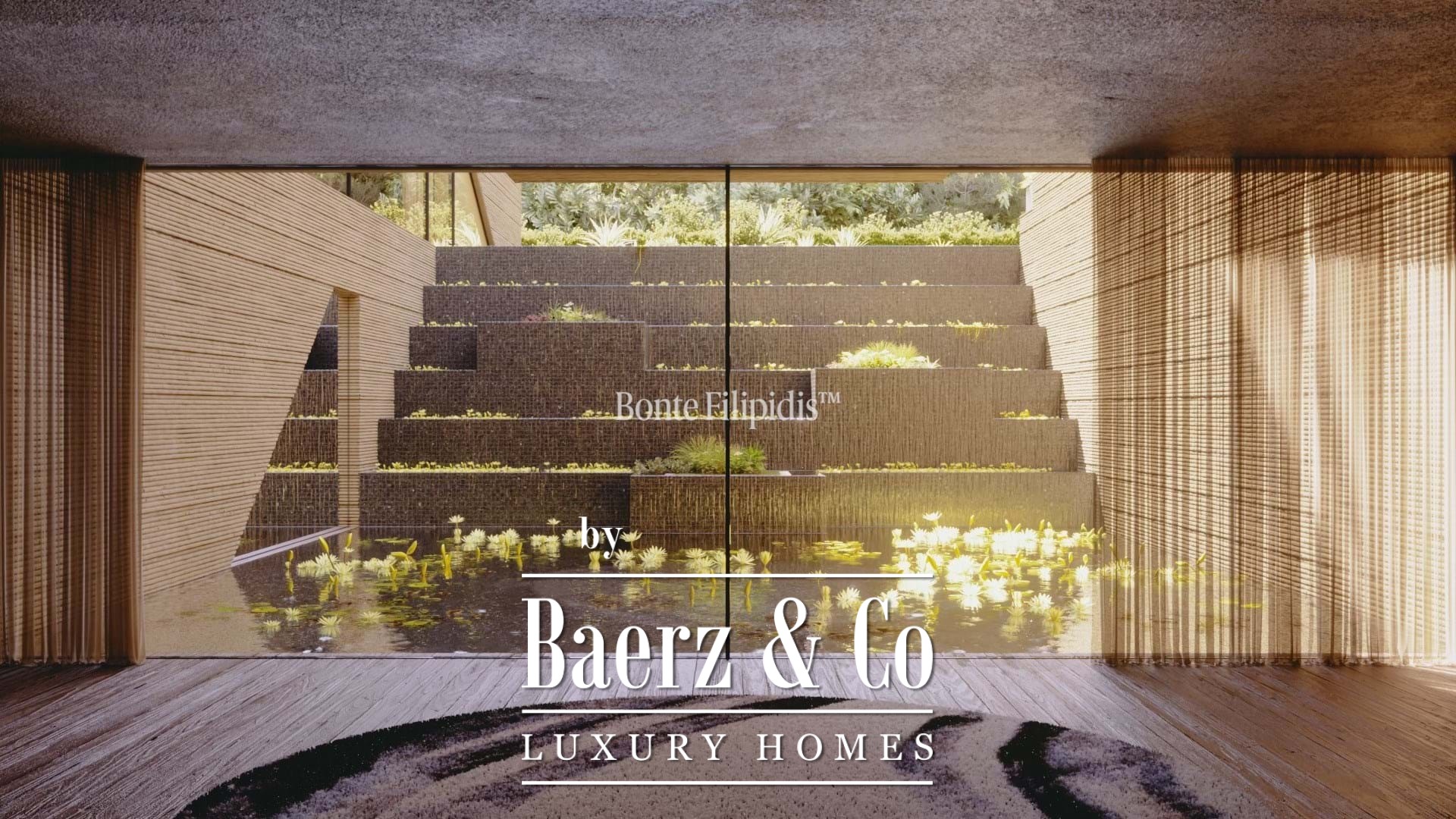 There are six en-suite bedrooms, including a master suite with private terrace and walk-in closet. The east and west-facing suites reveal serene views of landscaped gardens and water features. The lower level houses a gym, spa with sauna, laundry, technical areas, and a garage with electric gate for security.