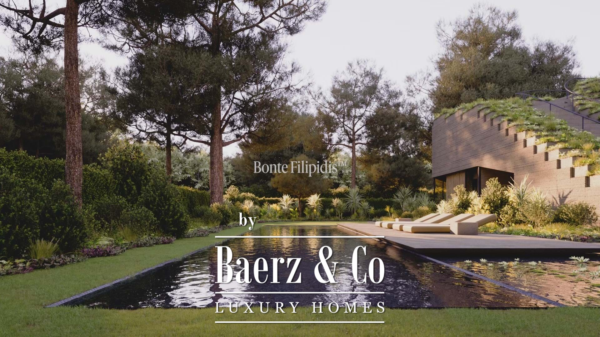 Multiple terraces frame a private black-tiled pool, outdoor lounges, and al fresco dining settings. Photovoltaic panels, recyclable steel, and certified wood signal a commitment to sustainable living, while home automation ensures comfort and peace of mind.