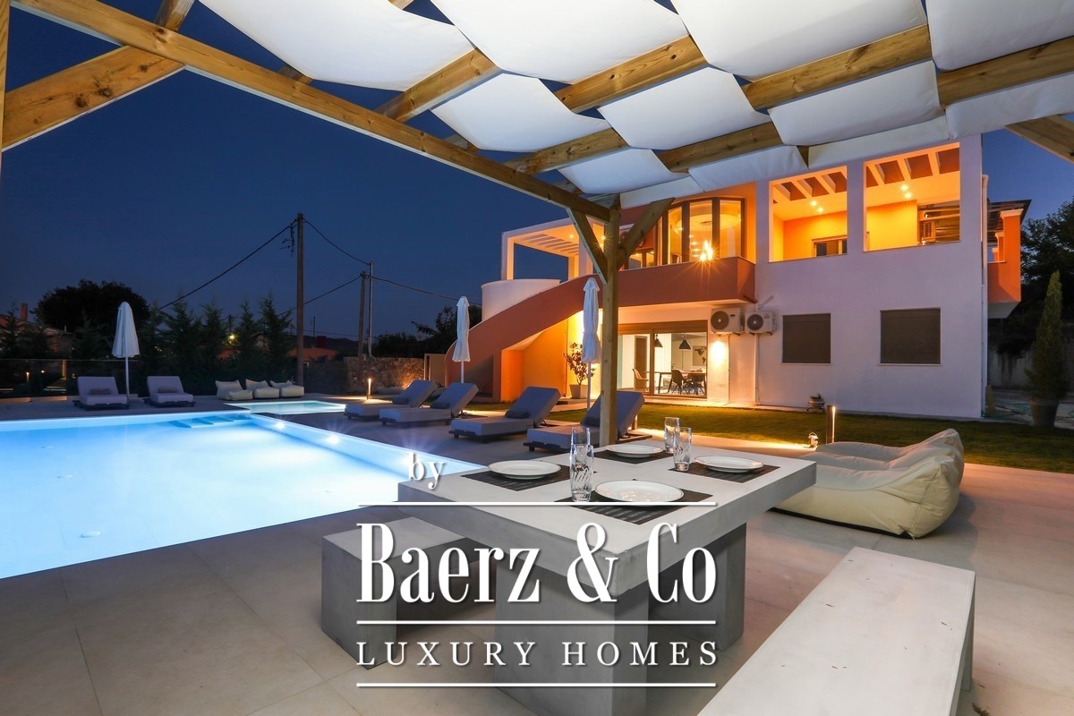 Villa Corfu offers a refined, contemporary statement in the northeast of the island, combining 497 m² of sophisticated living space with panoramic Ionian Sea views. This villa occupies a privileged plot of 1,073.59 m² in Alykes Potamou, less than four kilometers from Corfu town, the port, and international airport. The villa’s setting on a gentle hill assures privacy, with seamless access to renowned beaches including Kommeno and Paleokastritsa.