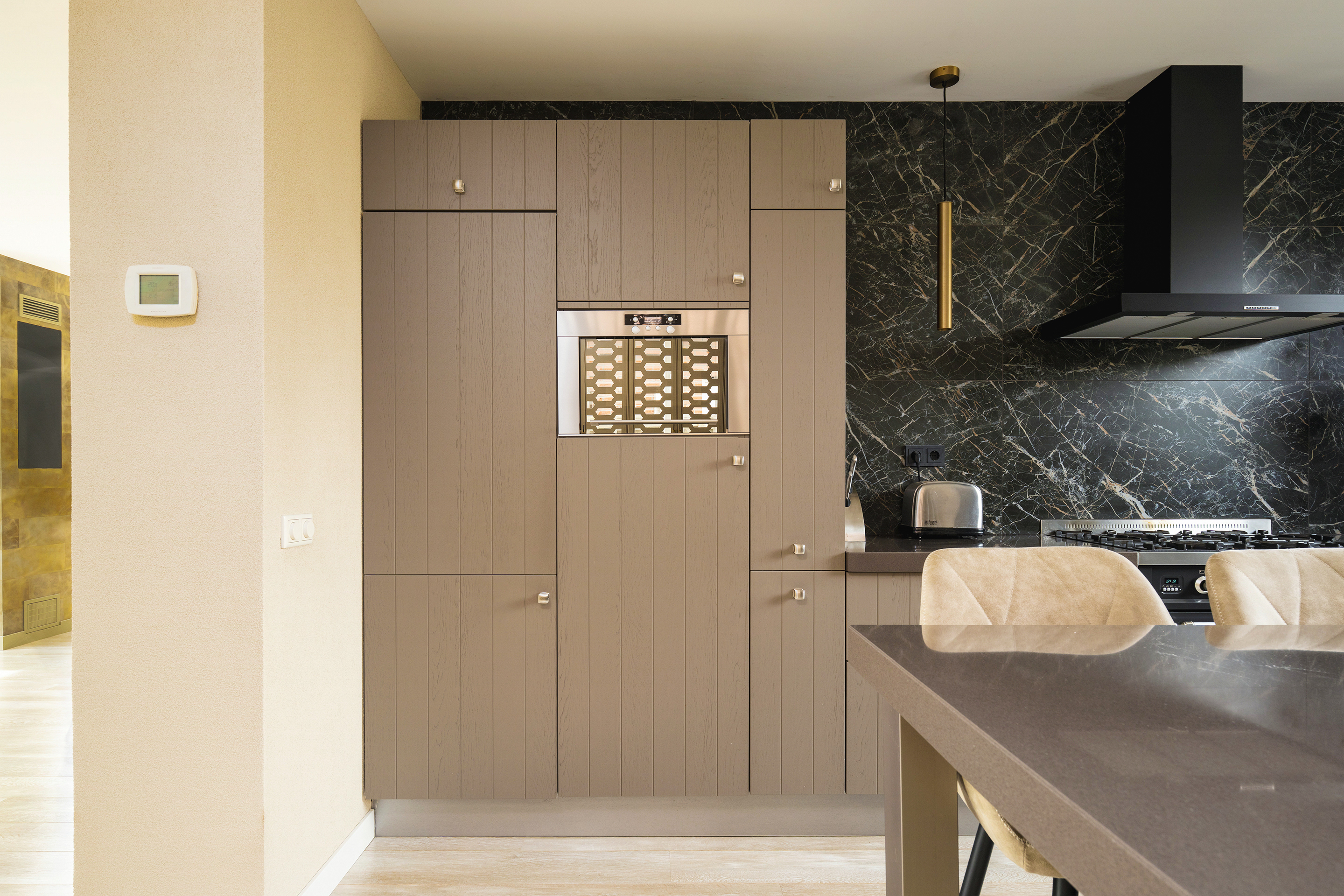 Entrance via the hall with meter cupboard, wardrobe, toilet, and staircase. From the hall you reach the spacious and bright living room at the rear, with a beautiful view of the garden and the water. The living room is connected to the dining room and the open kitchen at the front. The kitchen is luxuriously equipped with an extra-large refrigerator and freezer and a Boretti stove with a large oven – a dream for cooking enthusiasts. The bar with 4 stools is ideal for breakfast or for use with guests while cooking.