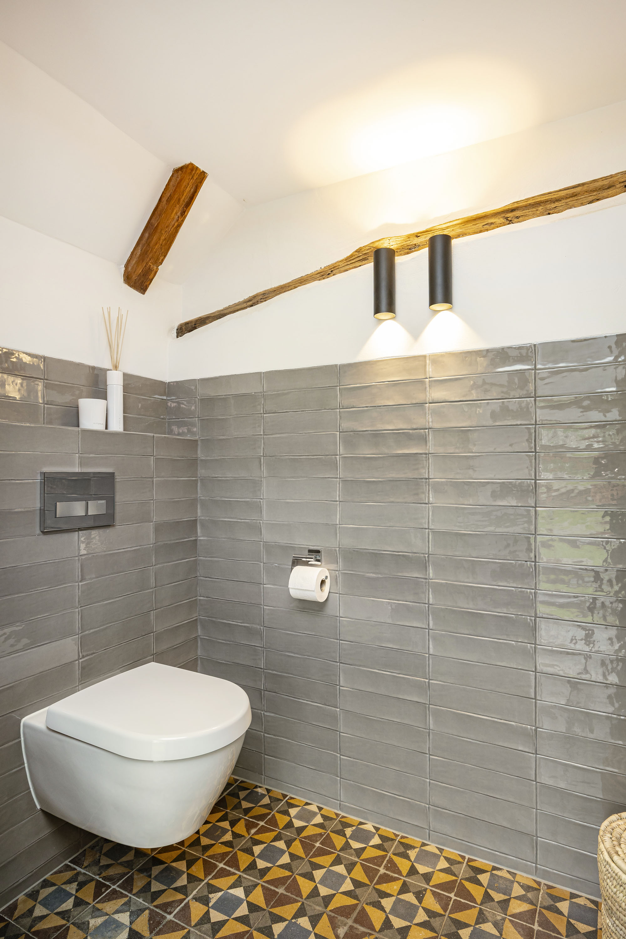 The ground floor includes a spacious modern kitchen, a living room divided into a dining and sitting area by a gas fireplace, a children’s play corner, a fitness room, a utility room, several storage rooms and—last but not least—a beautiful bedroom with a luxurious ensuite bathroom. At the front of the farmhouse, you will find the traditional “onderschoer”, a small covered and intimate terrace.