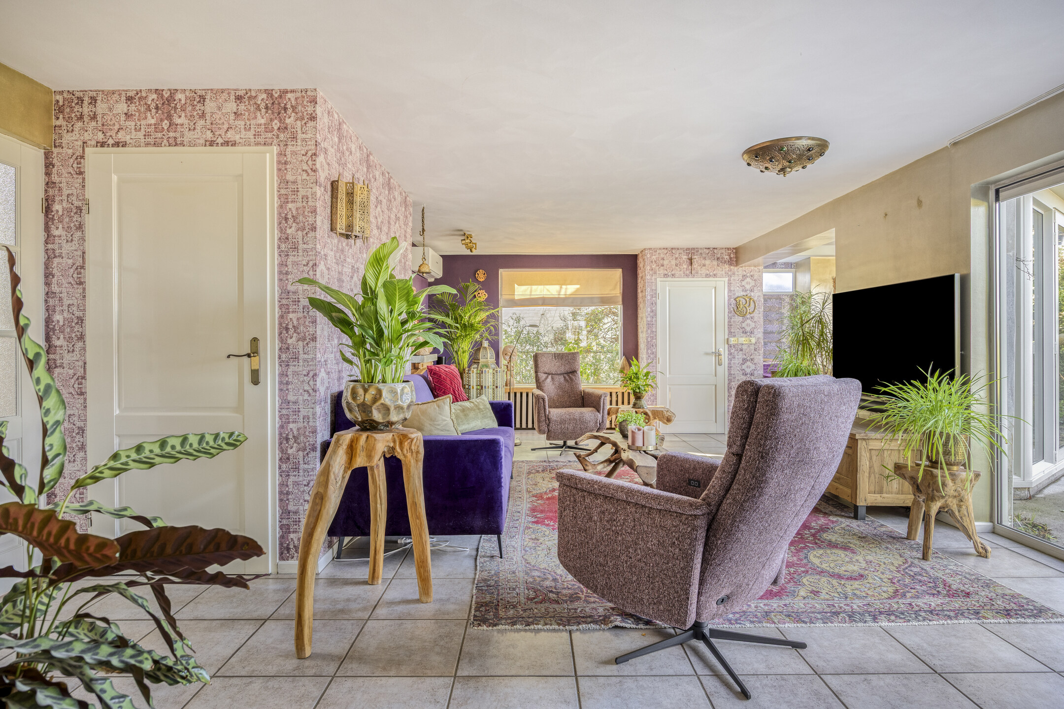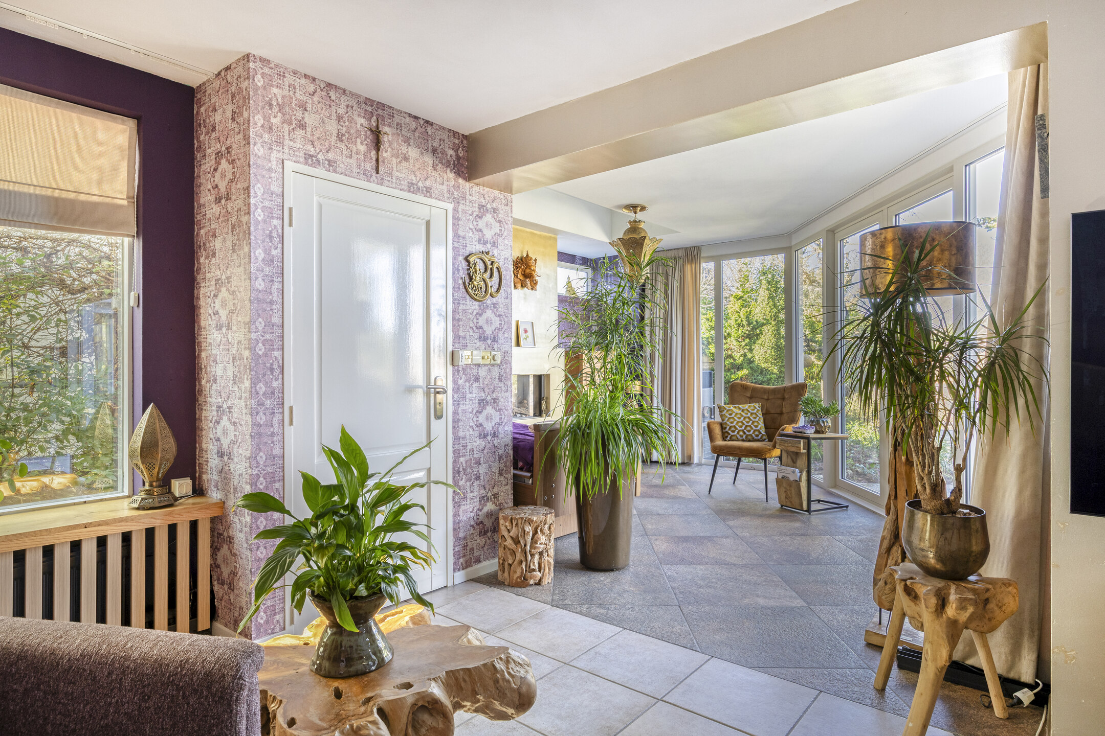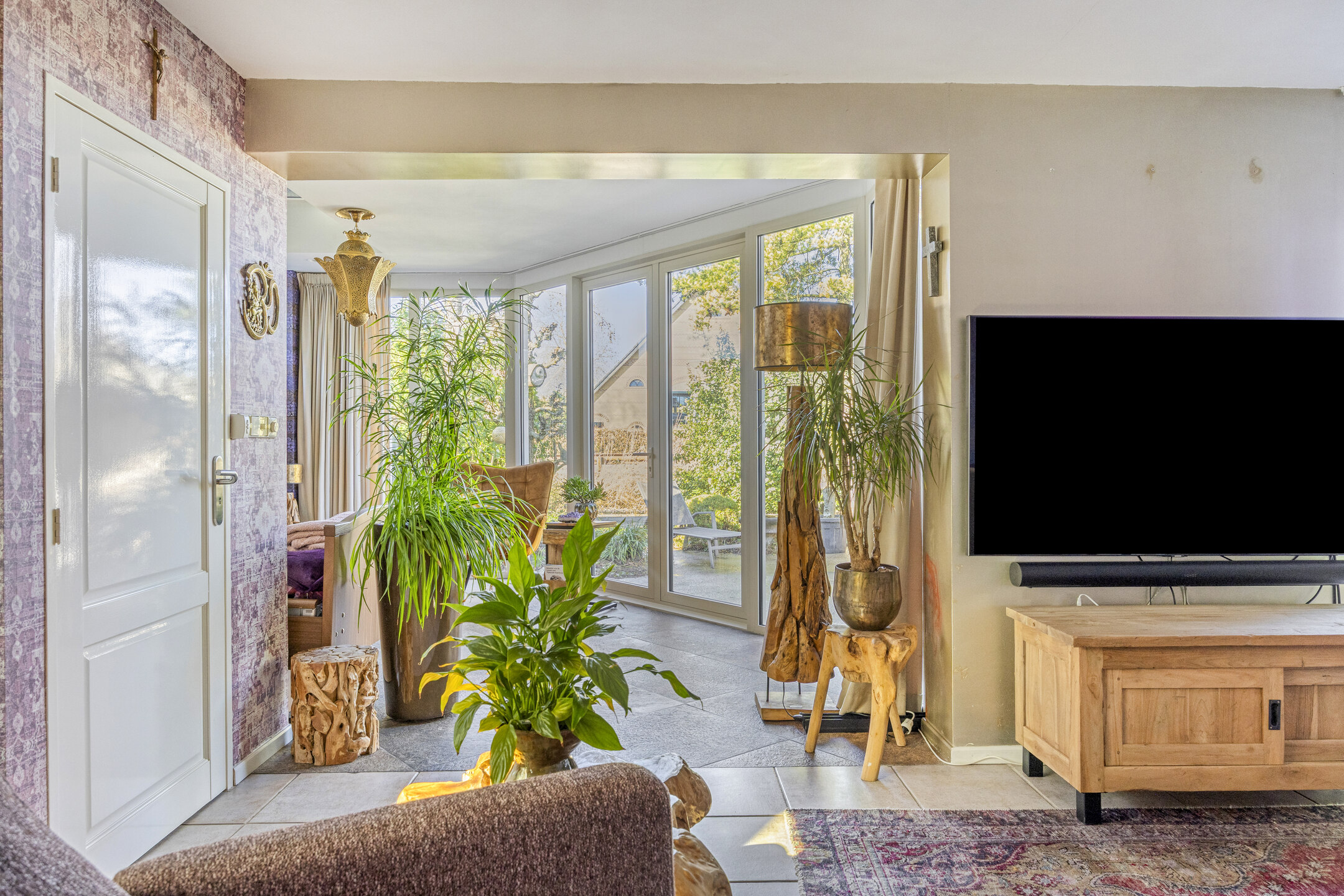 living room with air conditioning, staircase cupboard with hatch to the tiled cellar and open access to the conservatory with gas fireplace, skylight and glass façade with garden doors overlooking the garden and waterway;