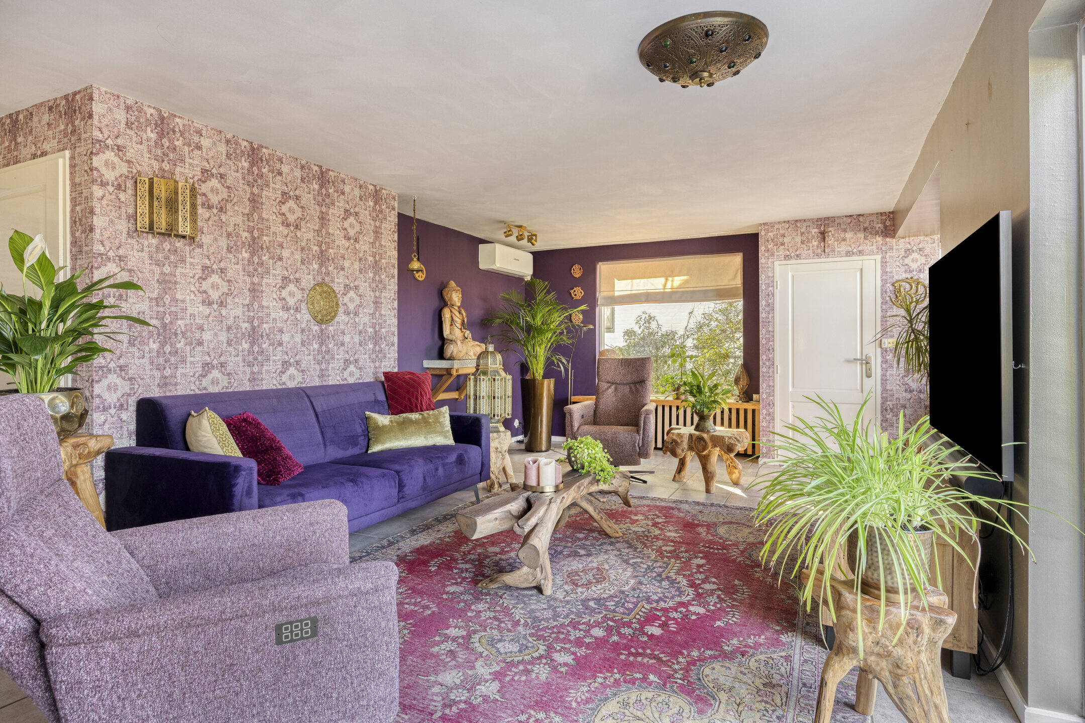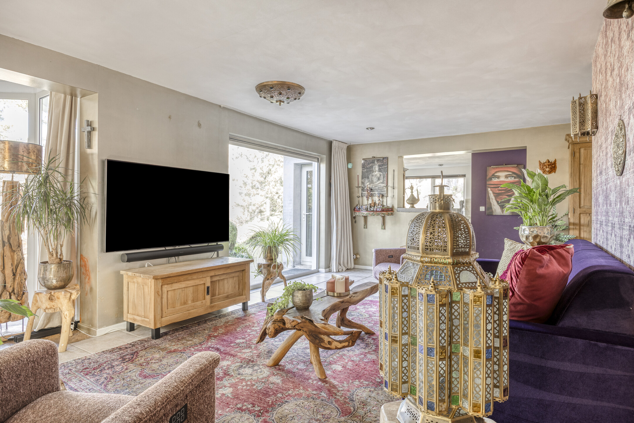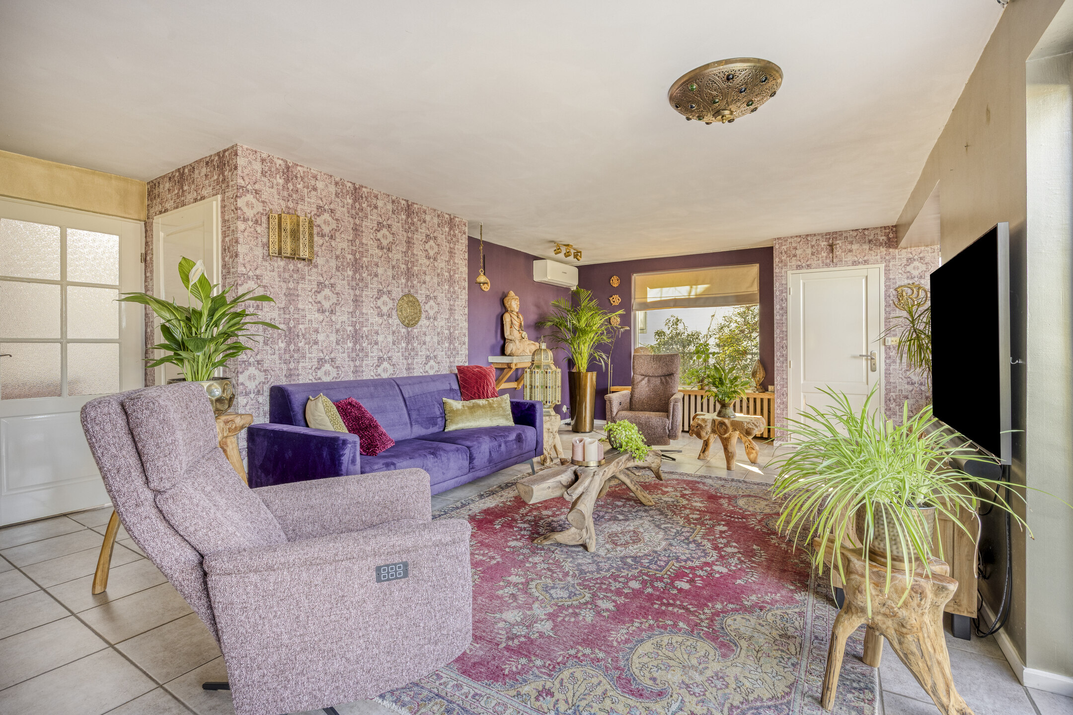 living room with air conditioning, staircase cupboard with hatch to the tiled cellar and open access to the conservatory with gas fireplace, skylight and glass façade with garden doors overlooking the garden and waterway;