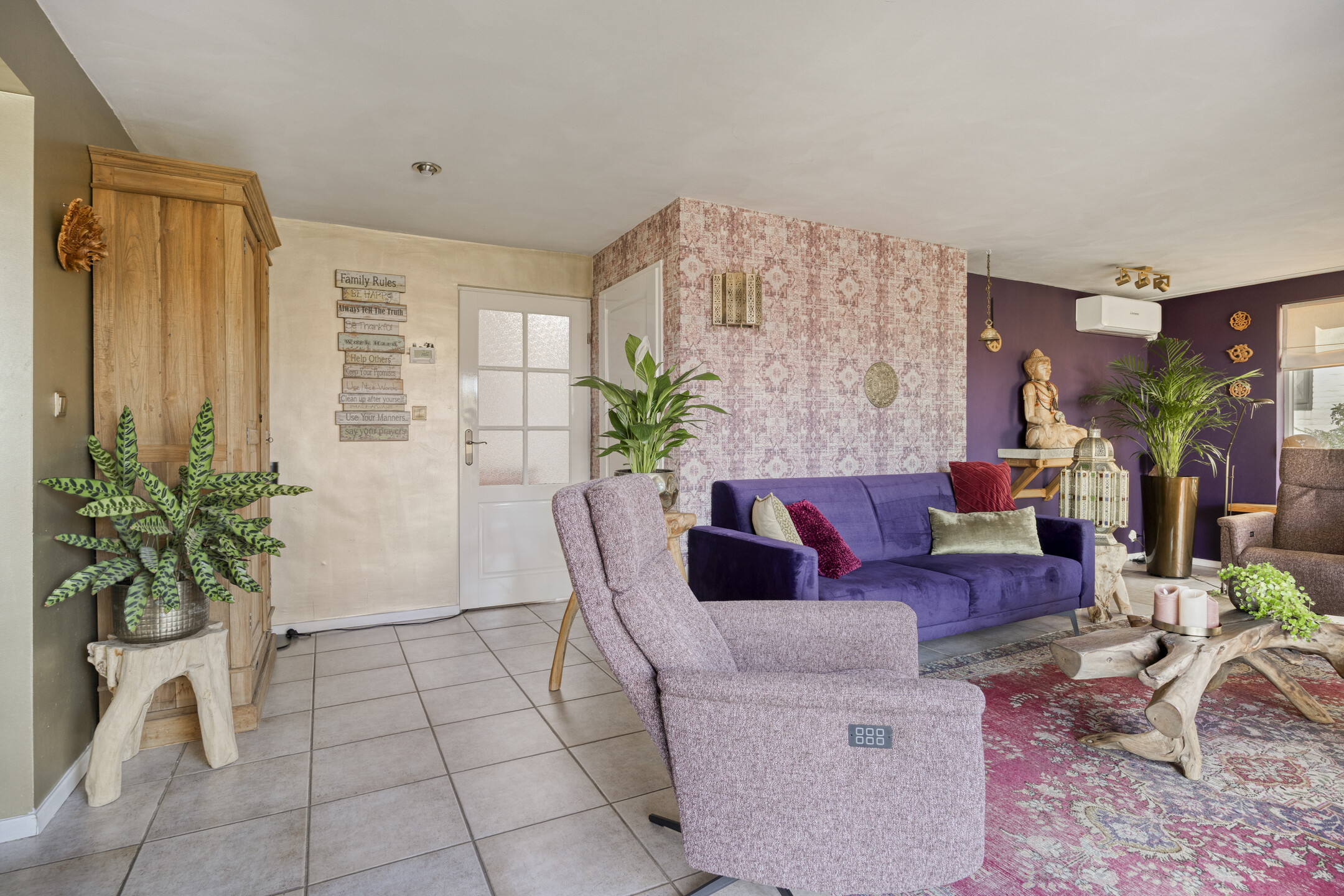 master bedroom with air conditioning and wardrobe wall, tiled floor, insulated stud walls for extra comfort, sprayed ceiling.
