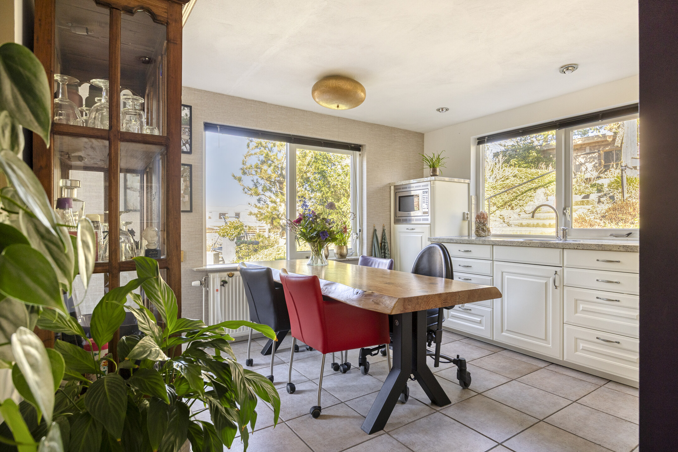 open space / living room / group area / workspace with garden doors to garden/terrace, underfloor heating, camera system, air conditioning, side door and separate front entrance from the street side, open kitchen with all desired amenities (including gas hob, dishwasher, refrigerator, combi oven/microwave, extractor hood), fixed staircase to the first floor;