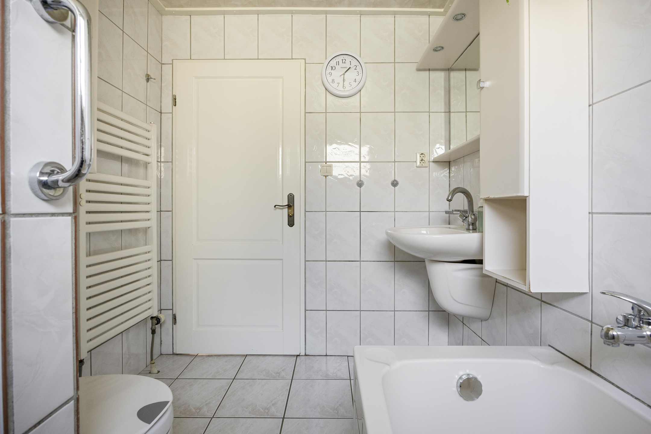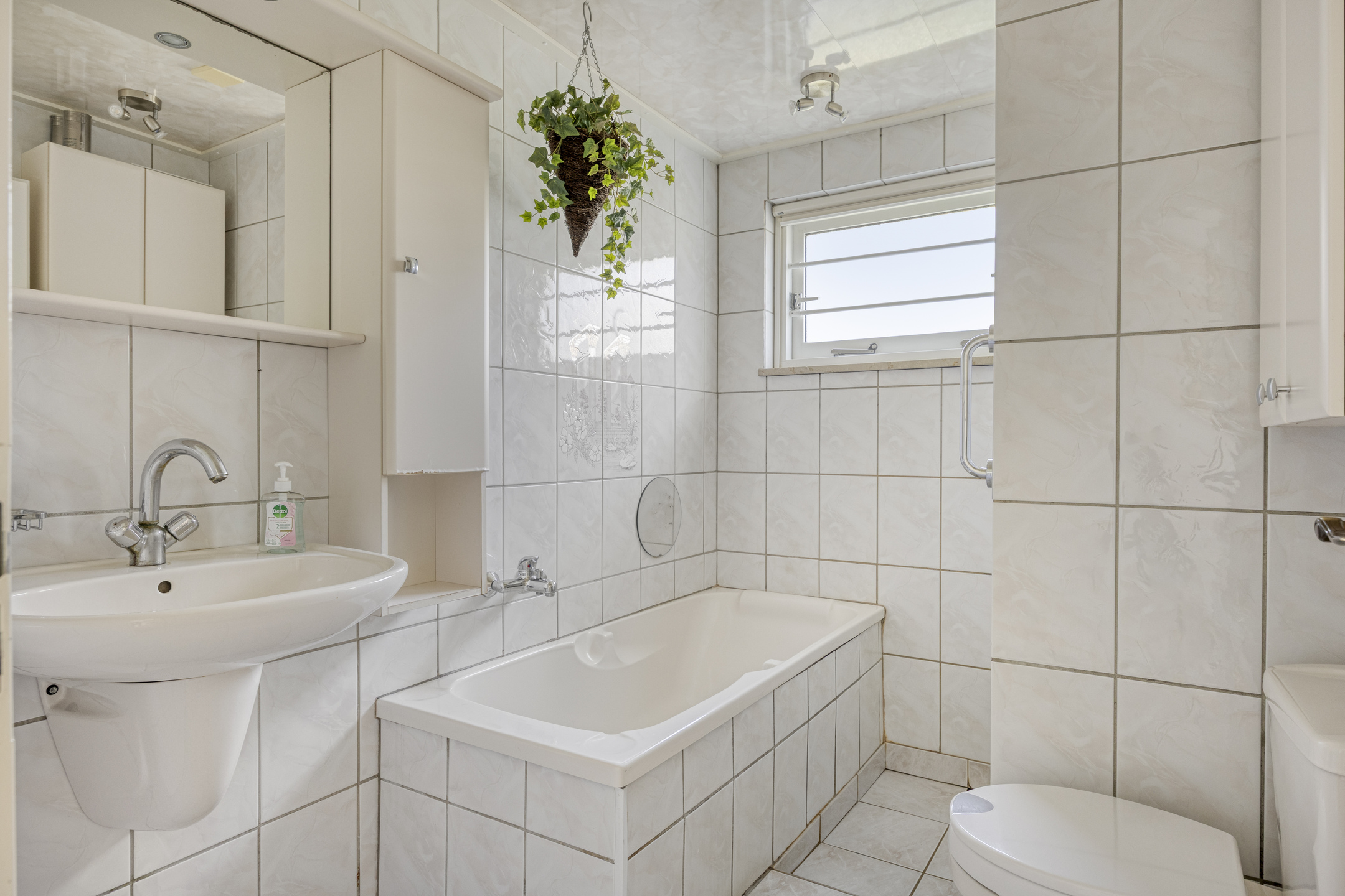 tiled bathroom with bathtub, shower, washbasin and toilet;