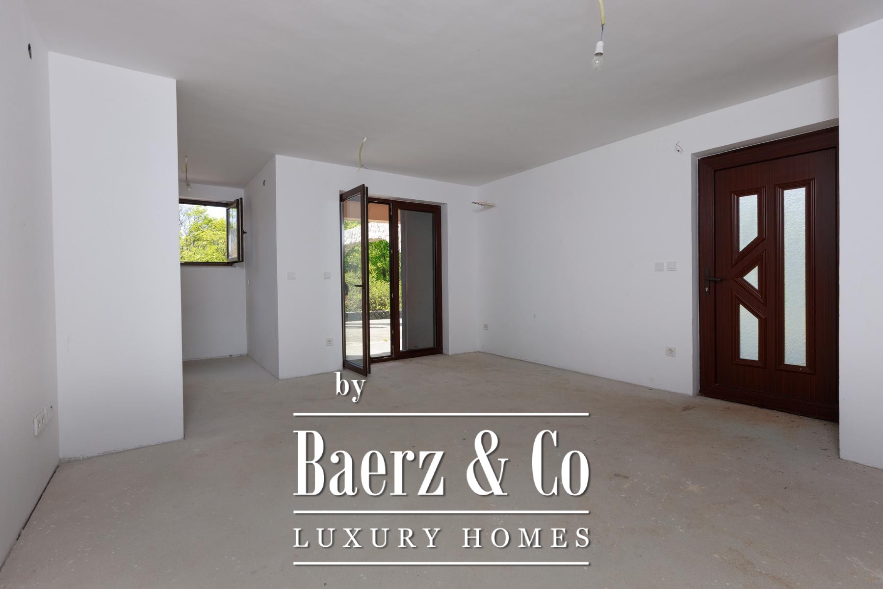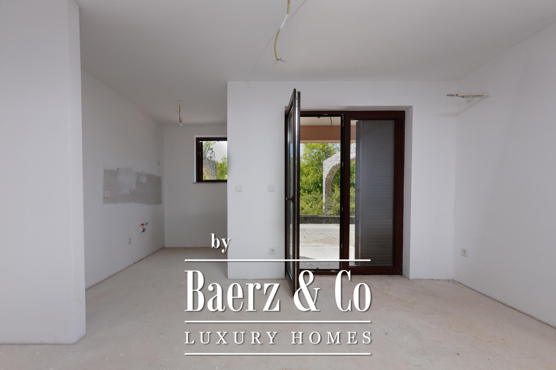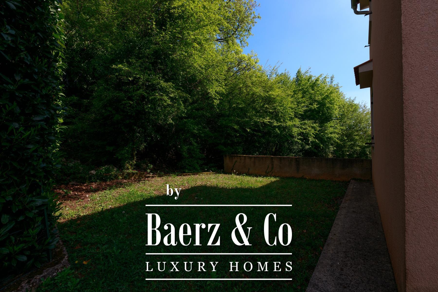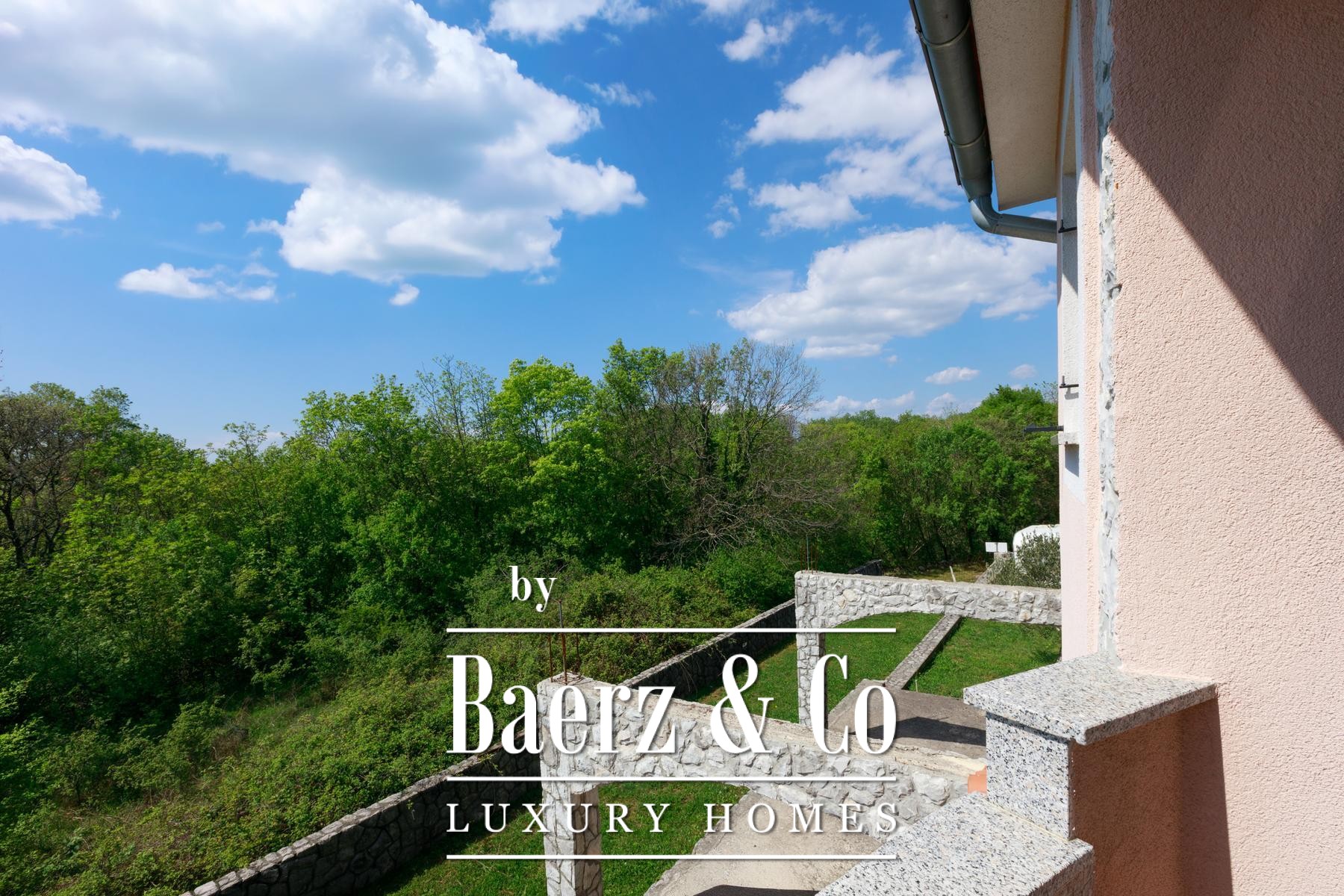 Each half of the property enjoys its own garden, offering ample room for individual pools. Ground floor apartments open onto private terraces, while the first-floor units include balconies that overlook lush greenery. A dedicated dining area sits in natural shade for outdoor gatherings. The tranquility of Kras, removed from city bustle but only a short drive from the sea and amenities, shapes a refined yet peaceful pace of life.