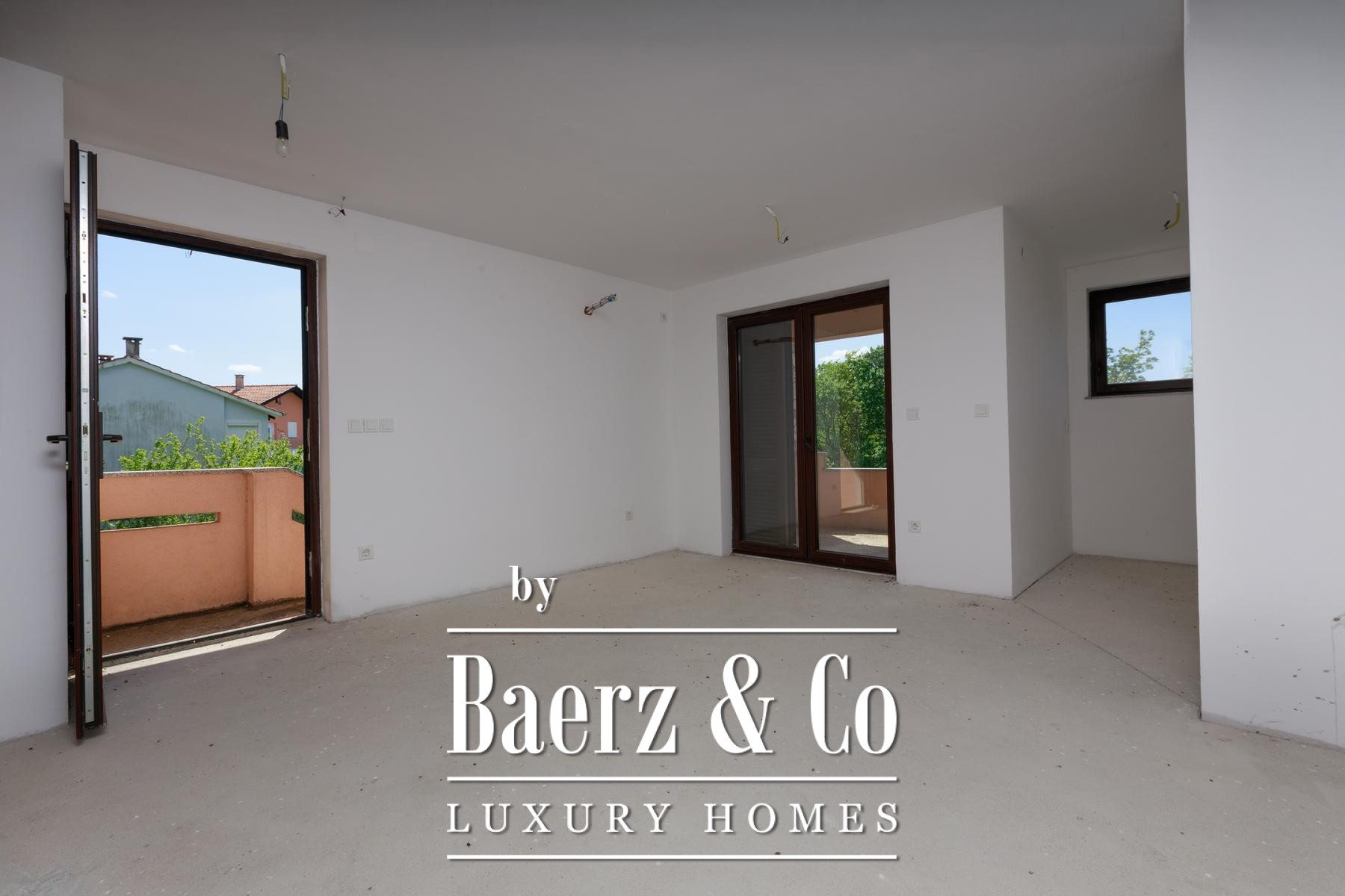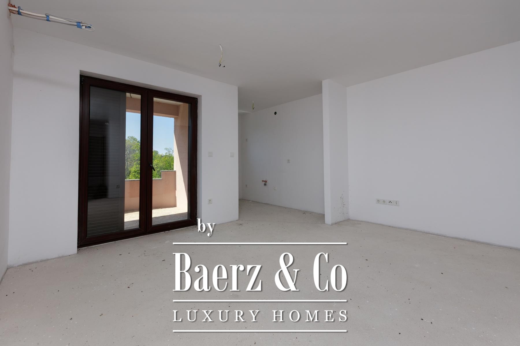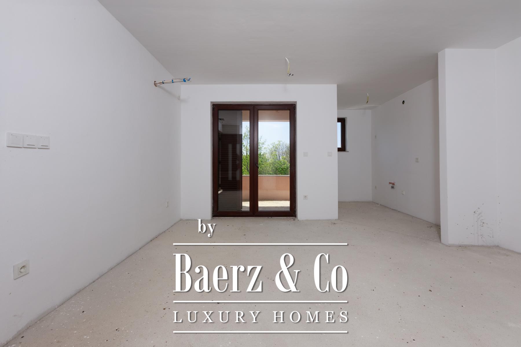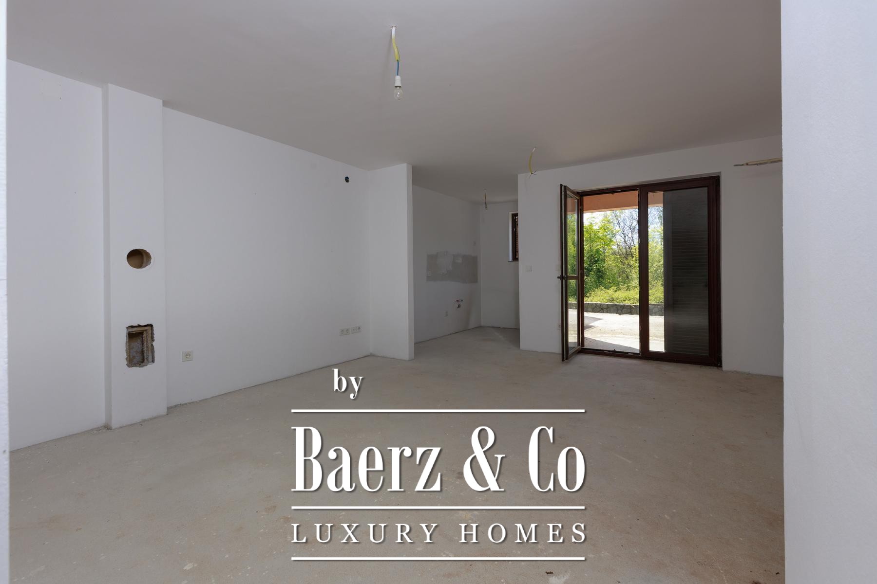 Each half of the property enjoys its own garden, offering ample room for individual pools. Ground floor apartments open onto private terraces, while the first-floor units include balconies that overlook lush greenery. A dedicated dining area sits in natural shade for outdoor gatherings. The tranquility of Kras, removed from city bustle but only a short drive from the sea and amenities, shapes a refined yet peaceful pace of life.