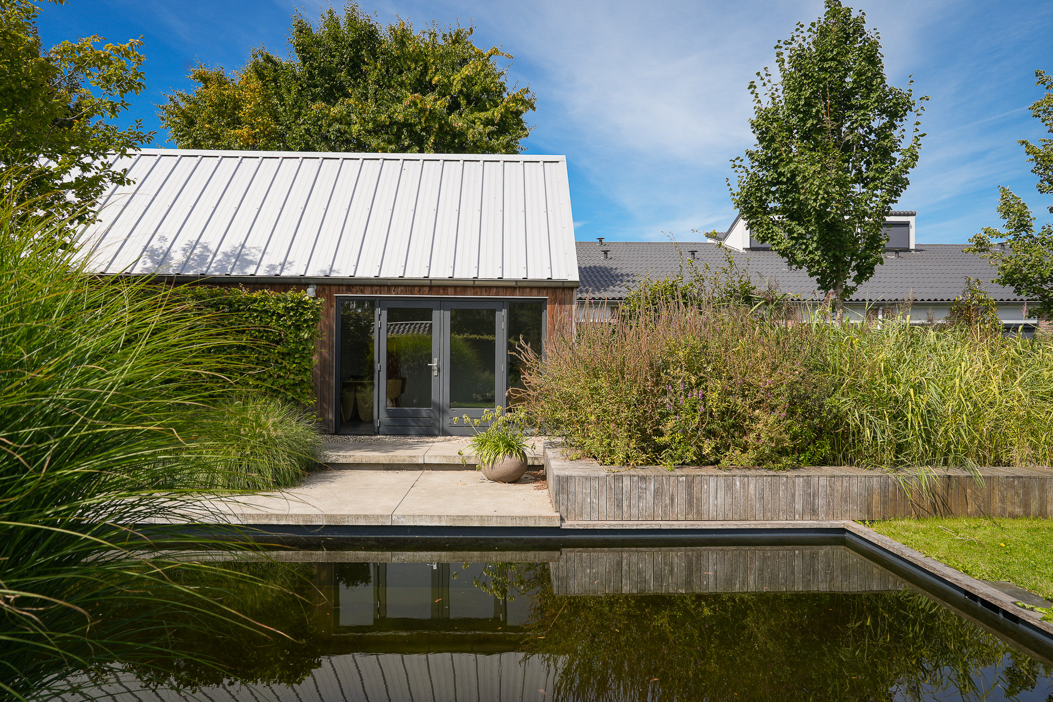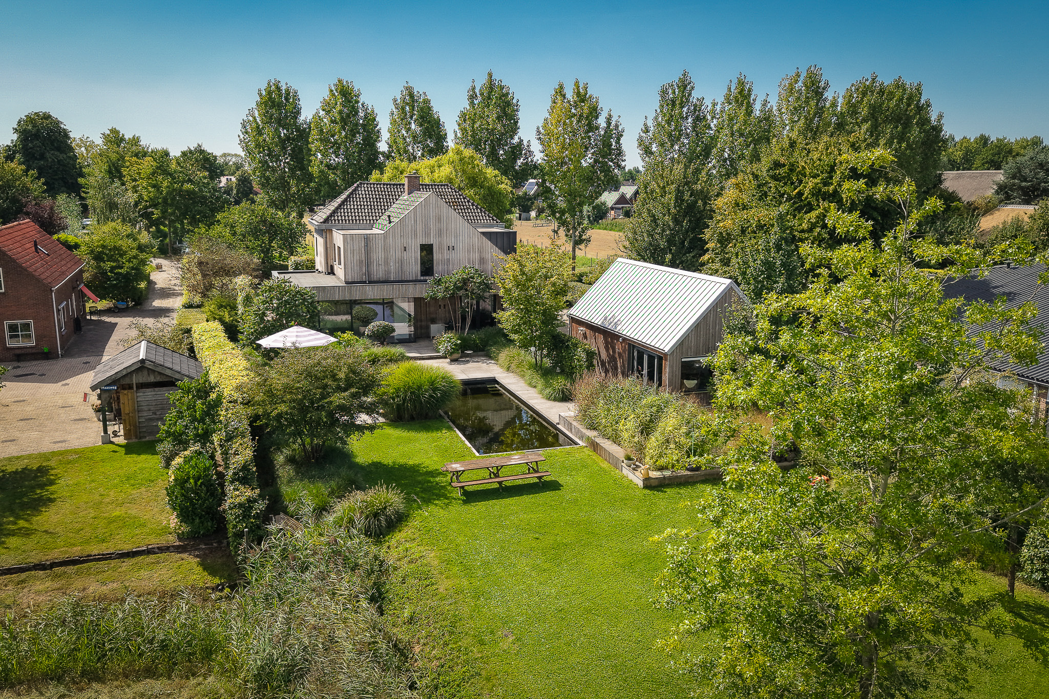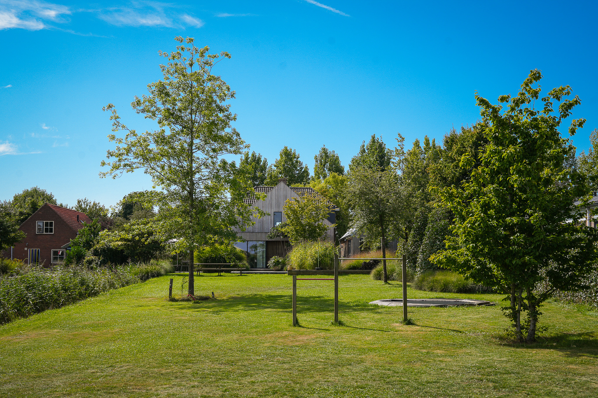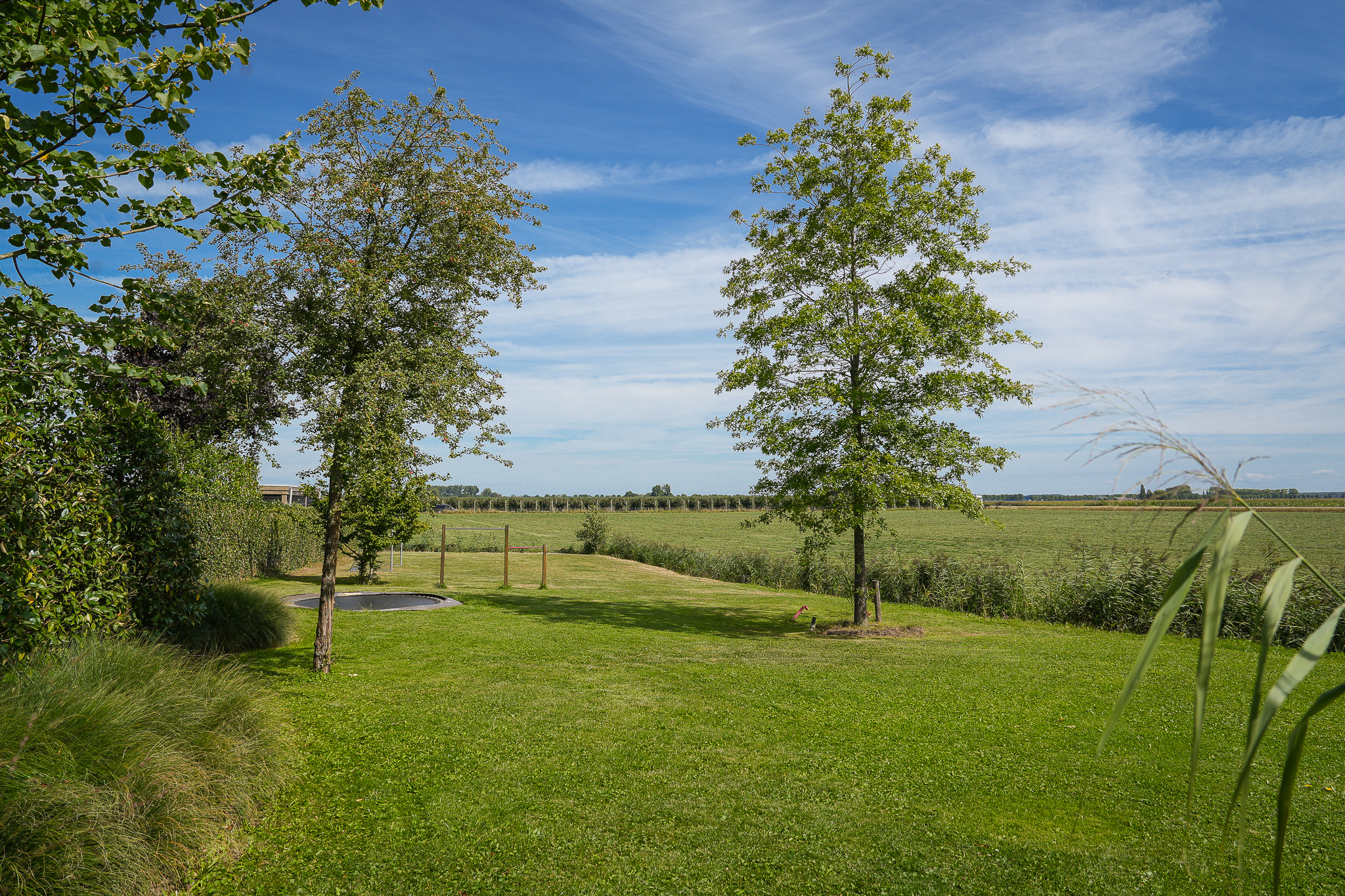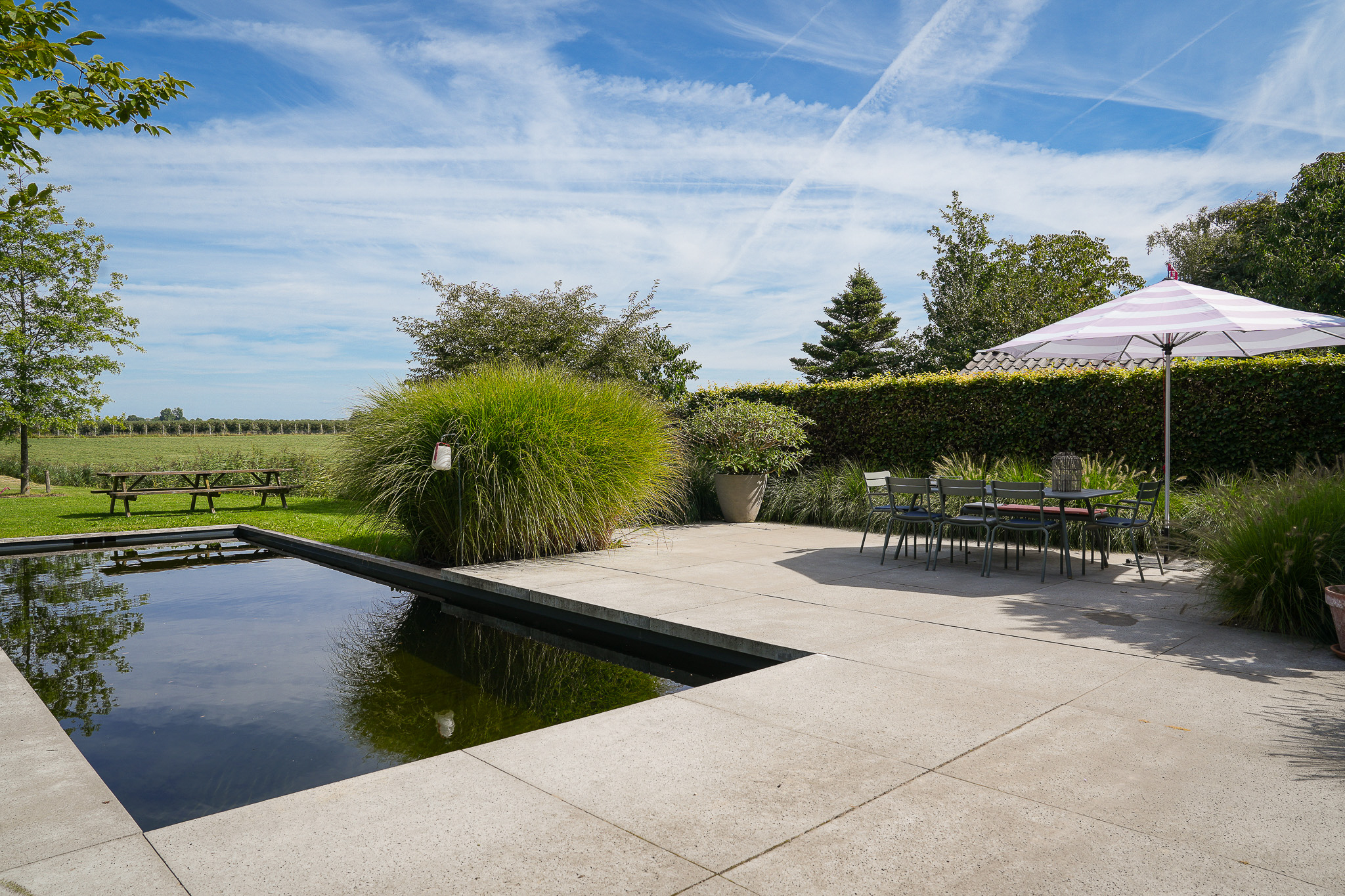 The garden fully embraces outdoor living. At the rear, the natural swimming pond forms a captivating centrepiece, surrounded by terraces, a natural filtration system and mature planting that ensures privacy and seclusion. It is a garden designed for relaxation: cooling summer swims, long evenings dining on one of the Schellevis terraces, or simply enjoying the views across the meadows. The garden is equipped with an irrigation system.