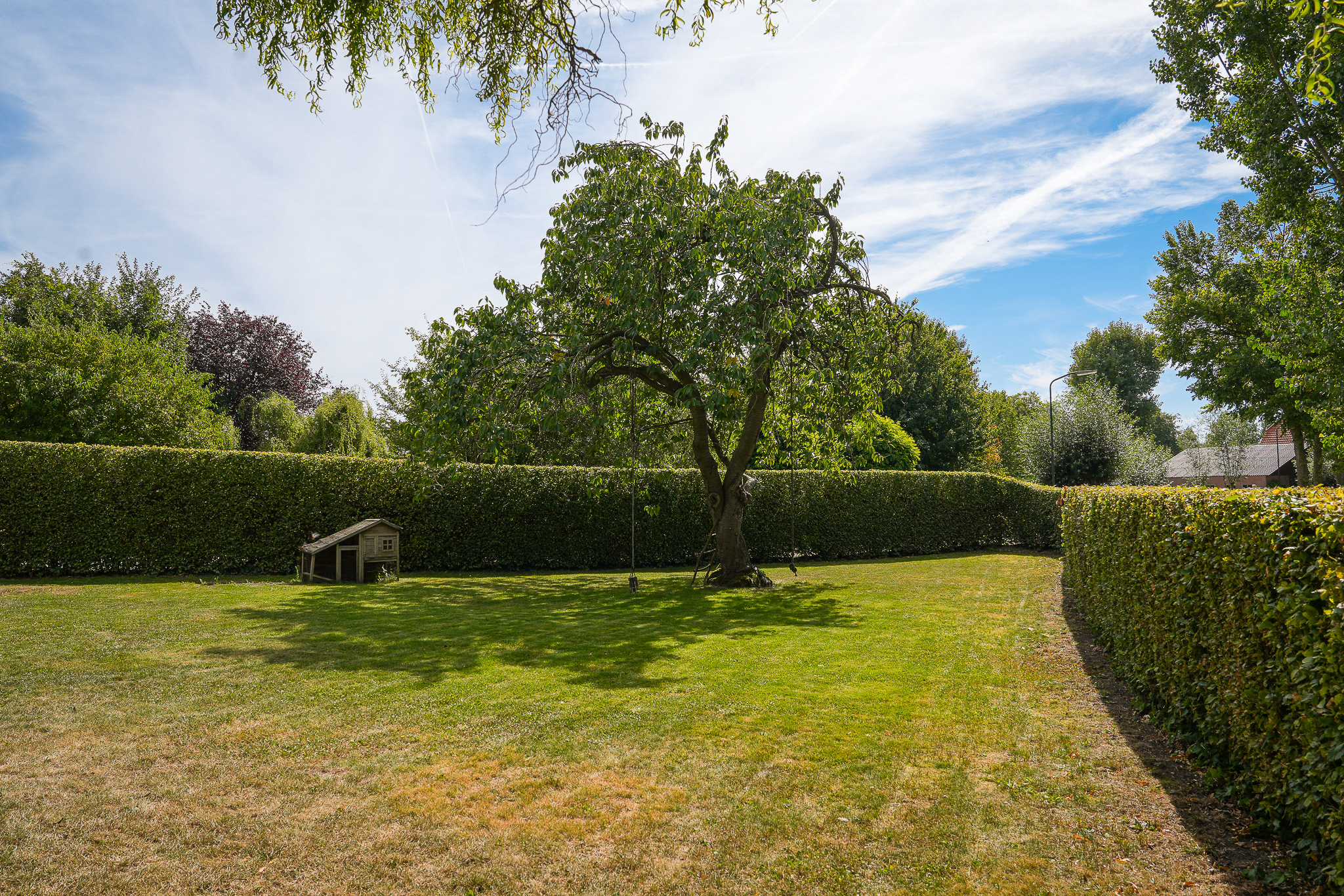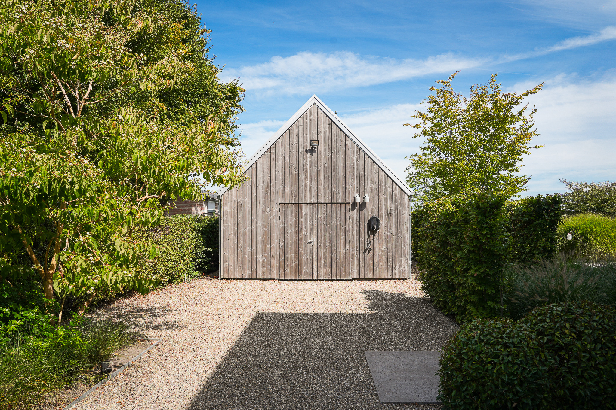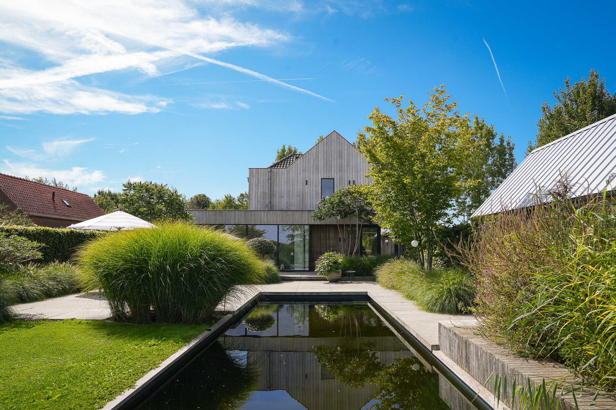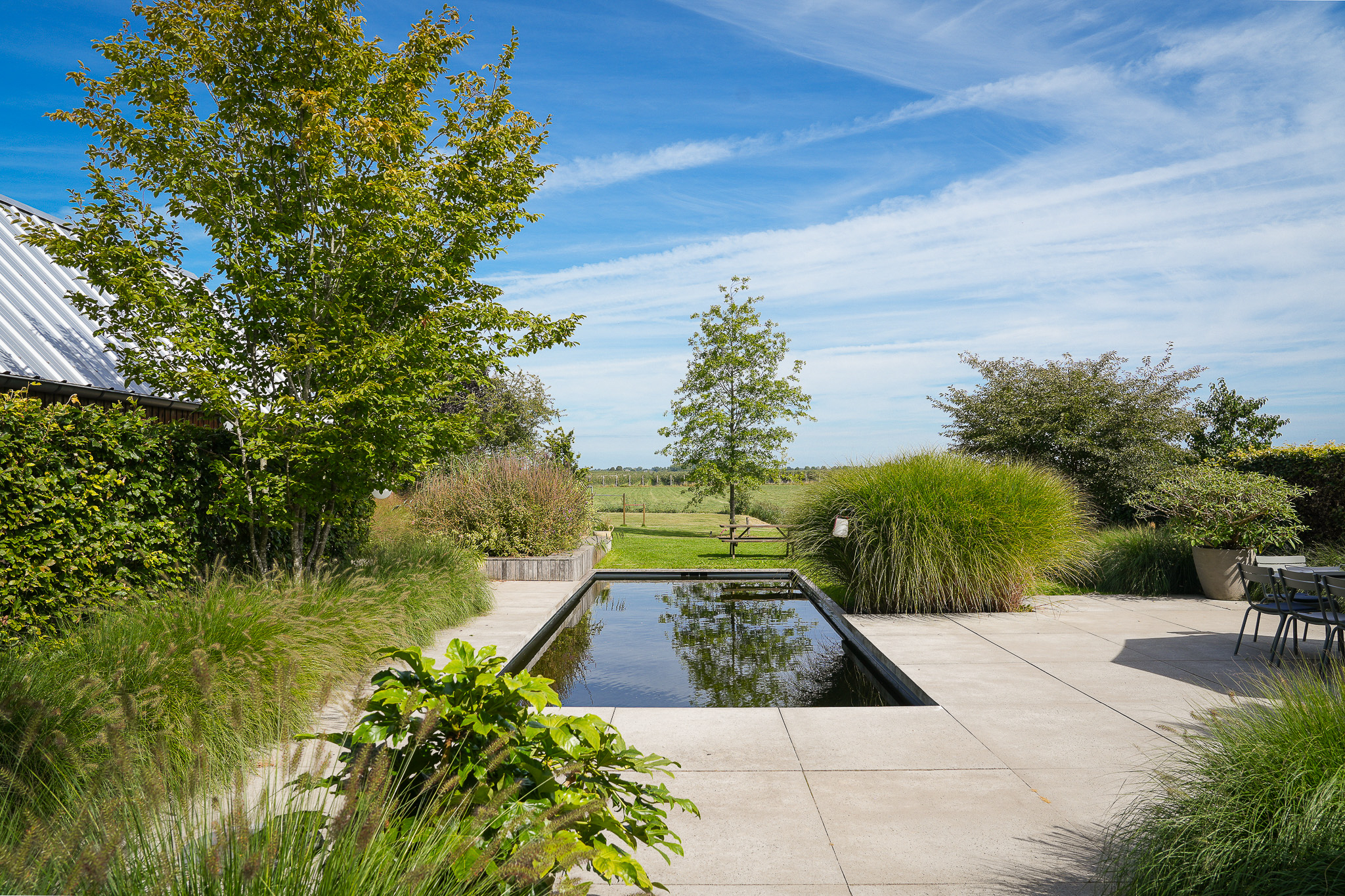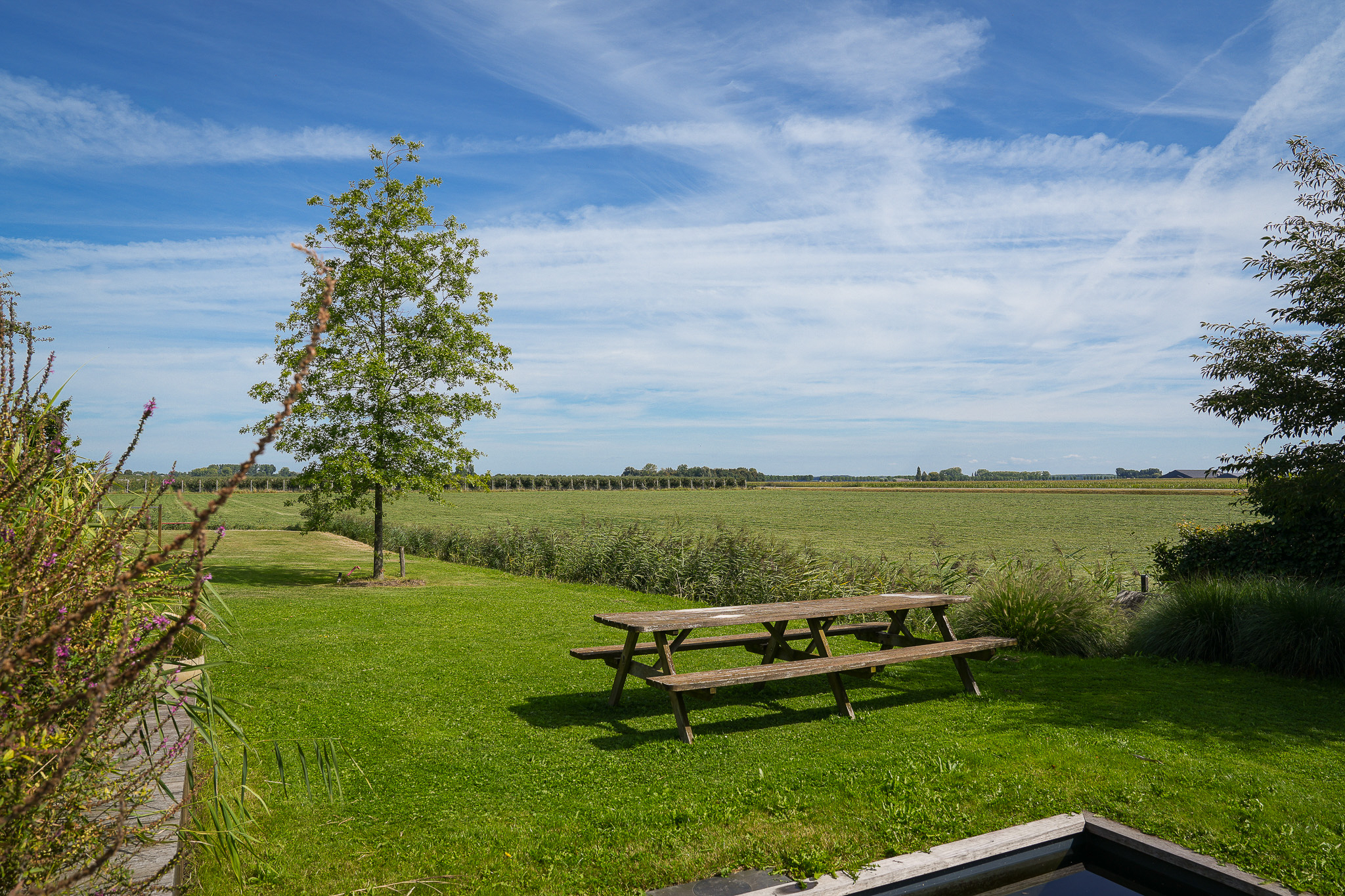The garden fully embraces outdoor living. At the rear, the natural swimming pond forms a captivating centrepiece, surrounded by terraces, a natural filtration system and mature planting that ensures privacy and seclusion. It is a garden designed for relaxation: cooling summer swims, long evenings dining on one of the Schellevis terraces, or simply enjoying the views across the meadows. The garden is equipped with an irrigation system.