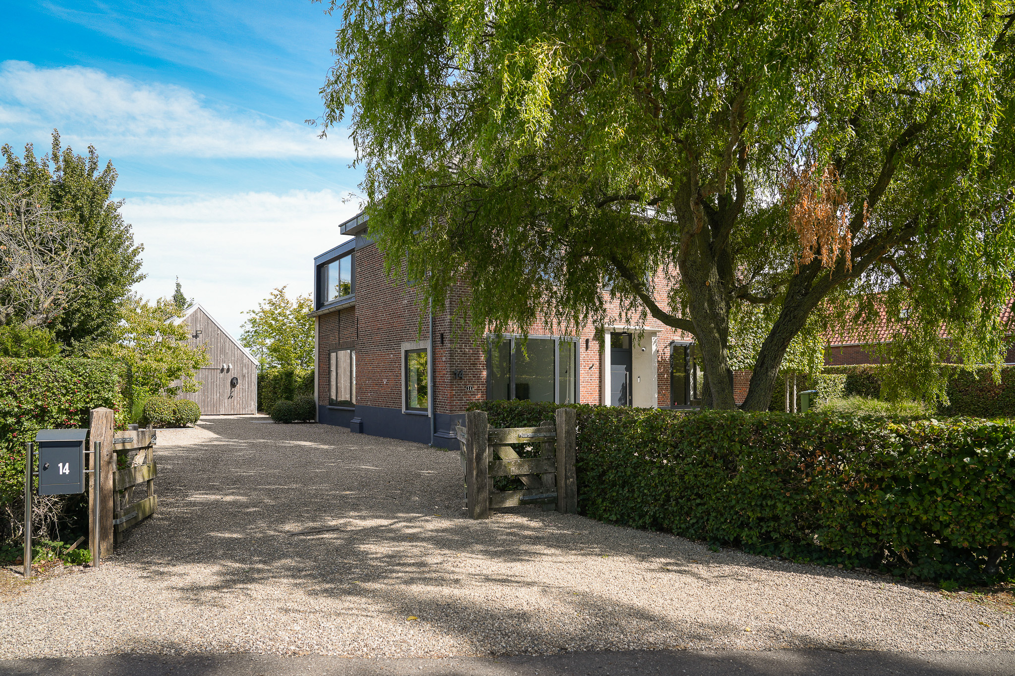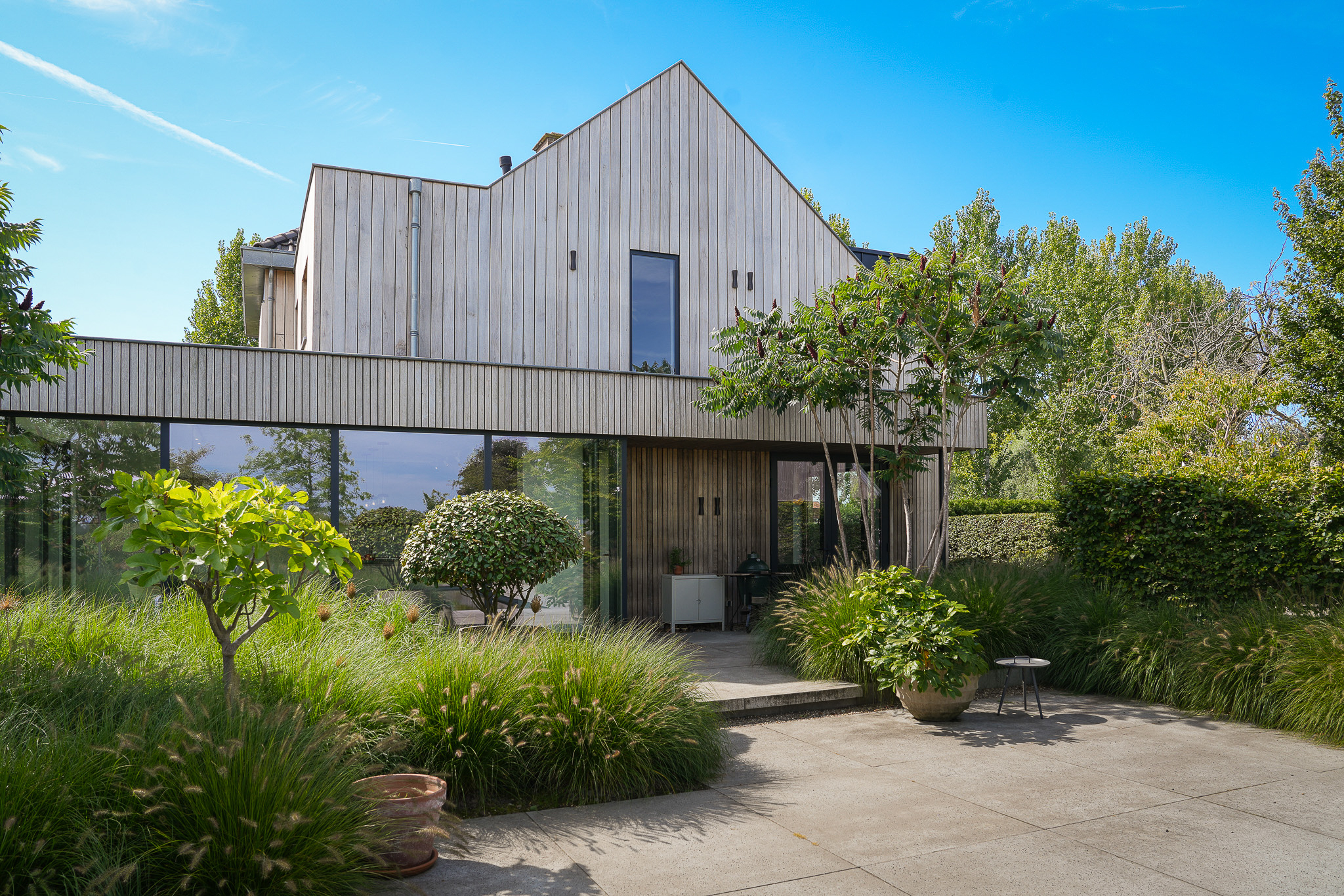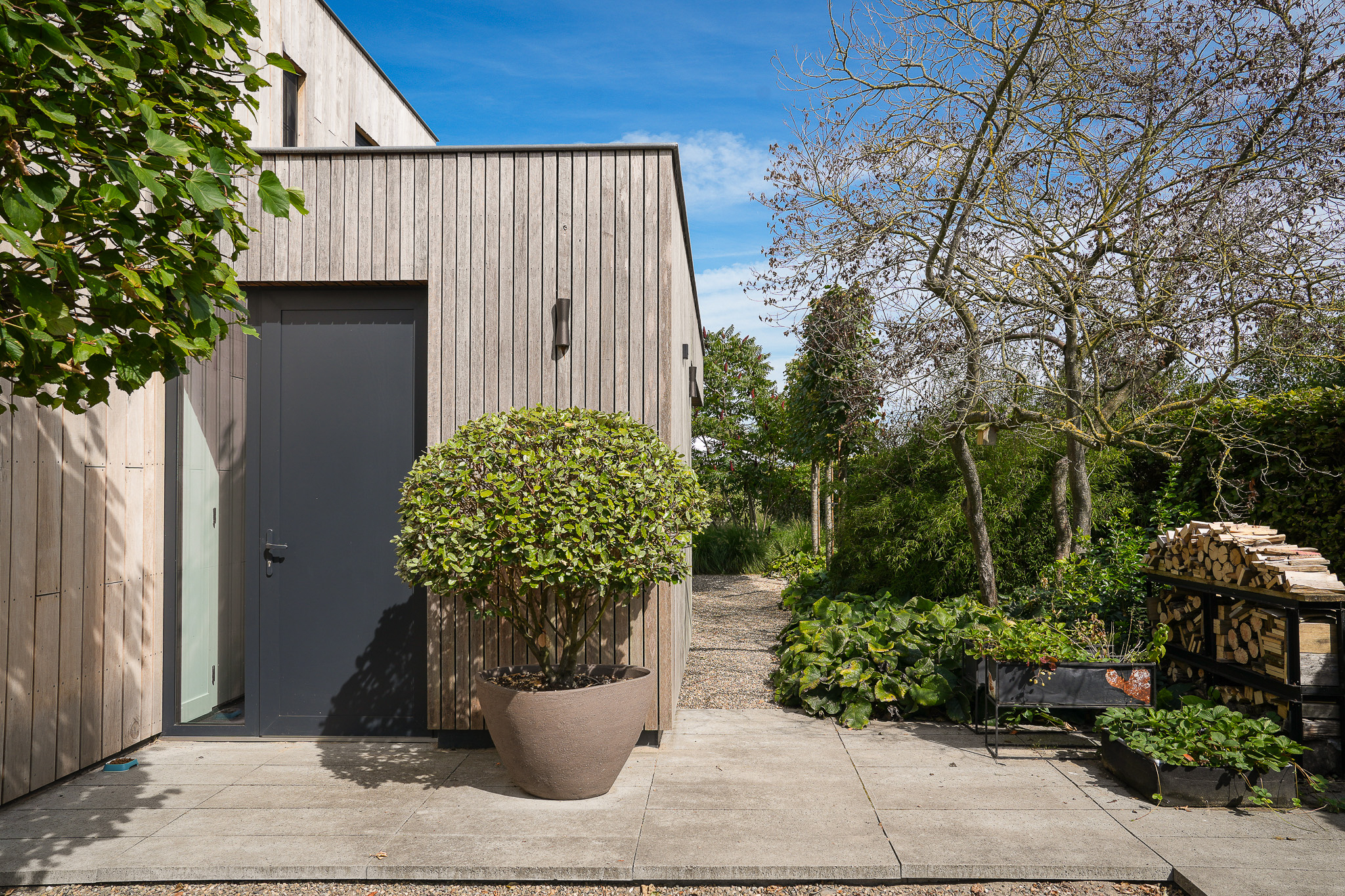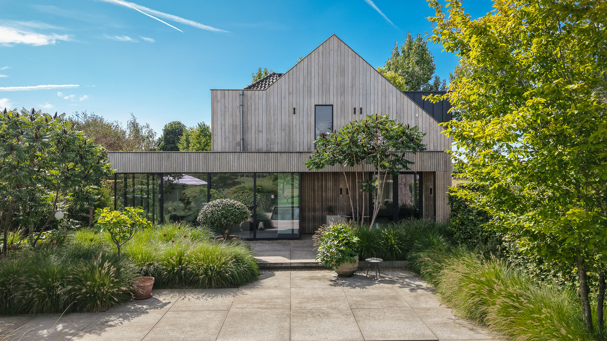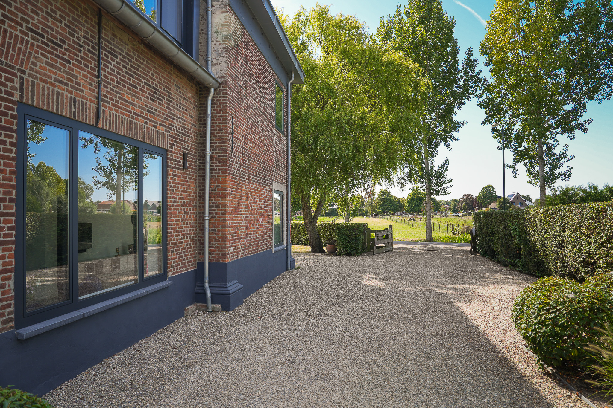 The garden fully embraces outdoor living. At the rear, the natural swimming pond forms a captivating centrepiece, surrounded by terraces, a natural filtration system and mature planting that ensures privacy and seclusion. It is a garden designed for relaxation: cooling summer swims, long evenings dining on one of the Schellevis terraces, or simply enjoying the views across the meadows. The garden is equipped with an irrigation system.