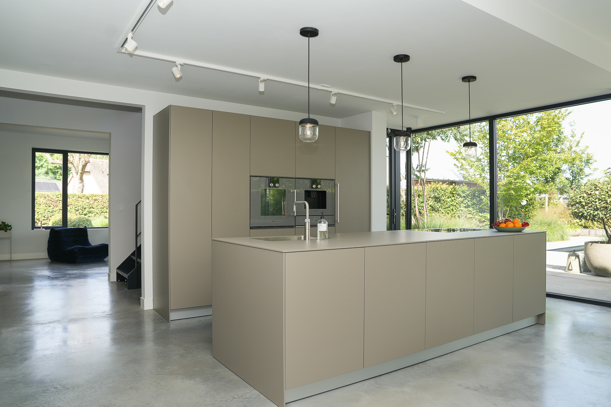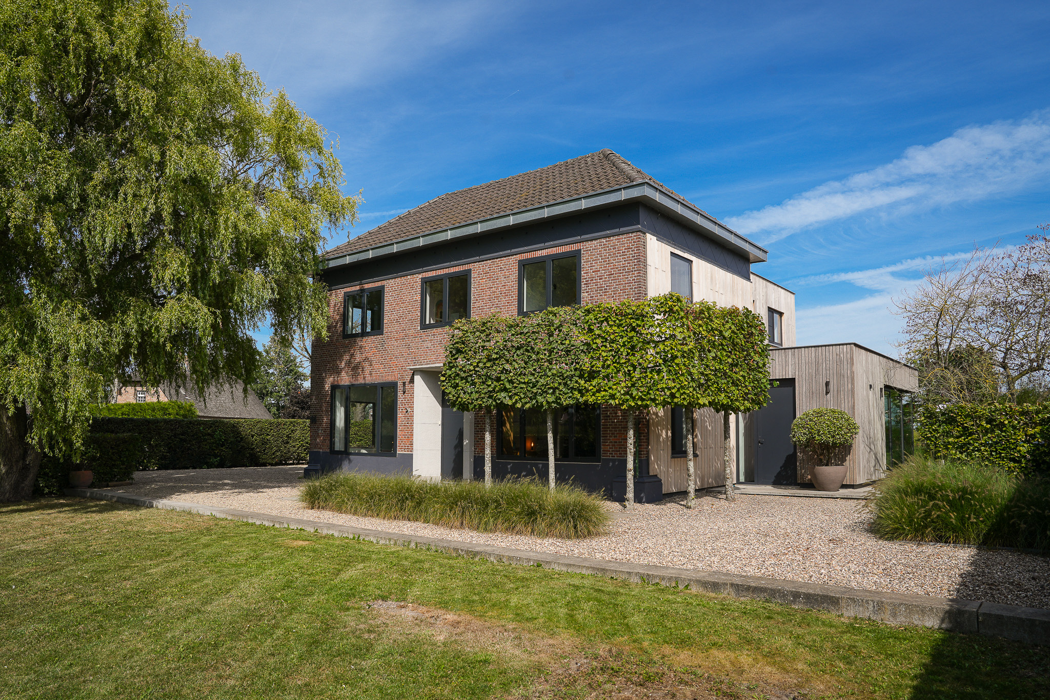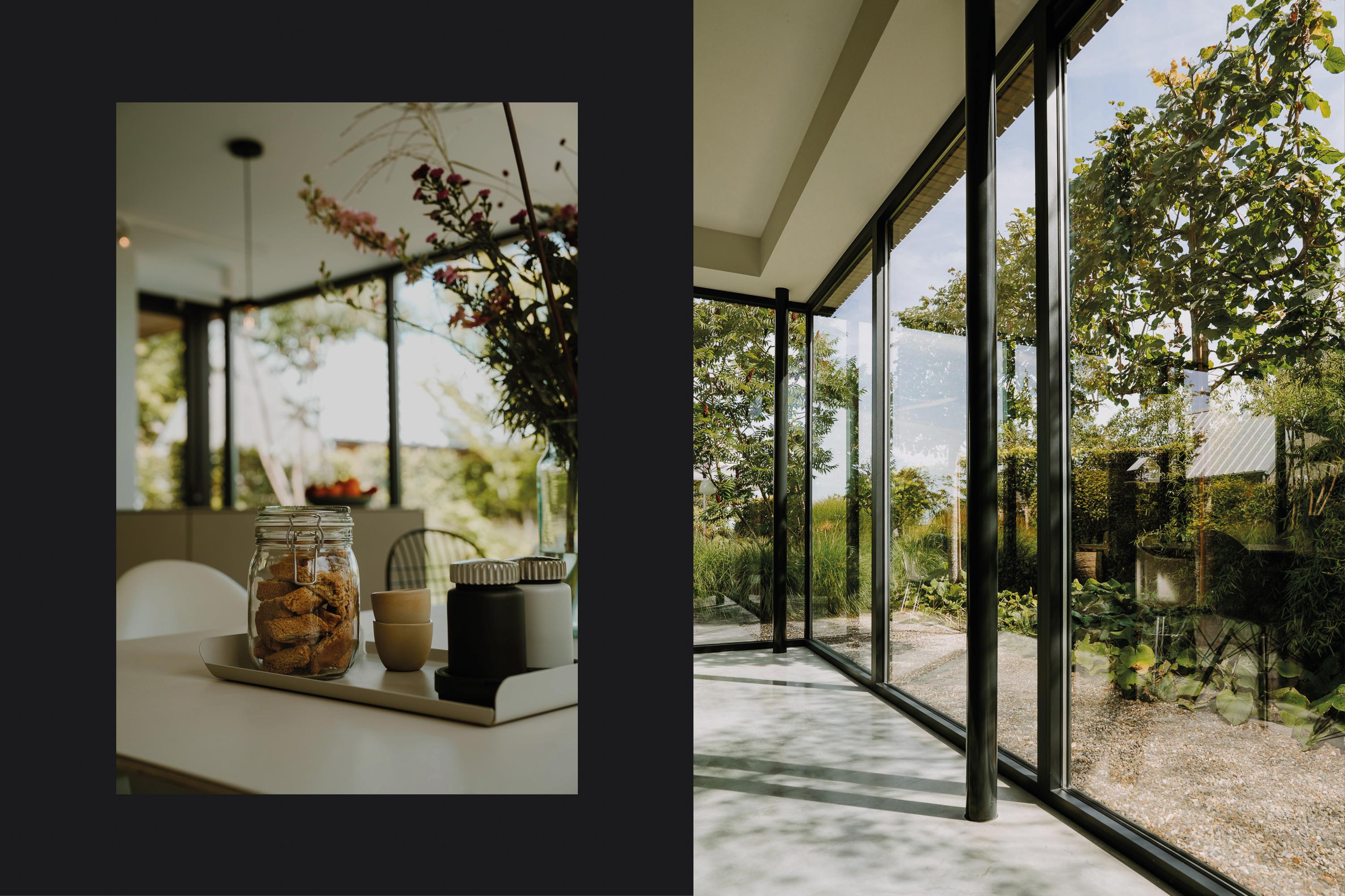 The kitchen extension is a true showpiece, with its glass walls creating a seamless connection to the garden. Indoors you enjoy light and space, outdoors awaits a landscaped green oasis with terraces and a swimming pond. Here, style, comfort and outdoor living come together.