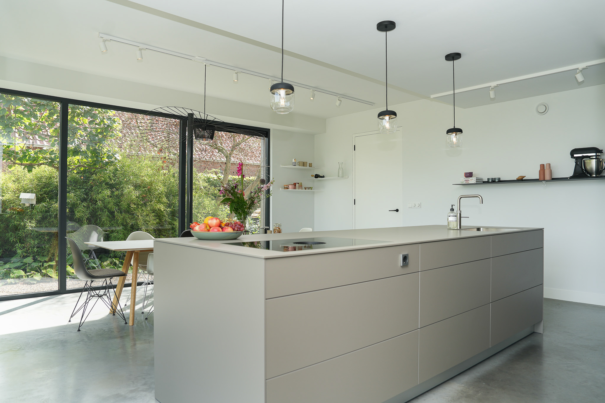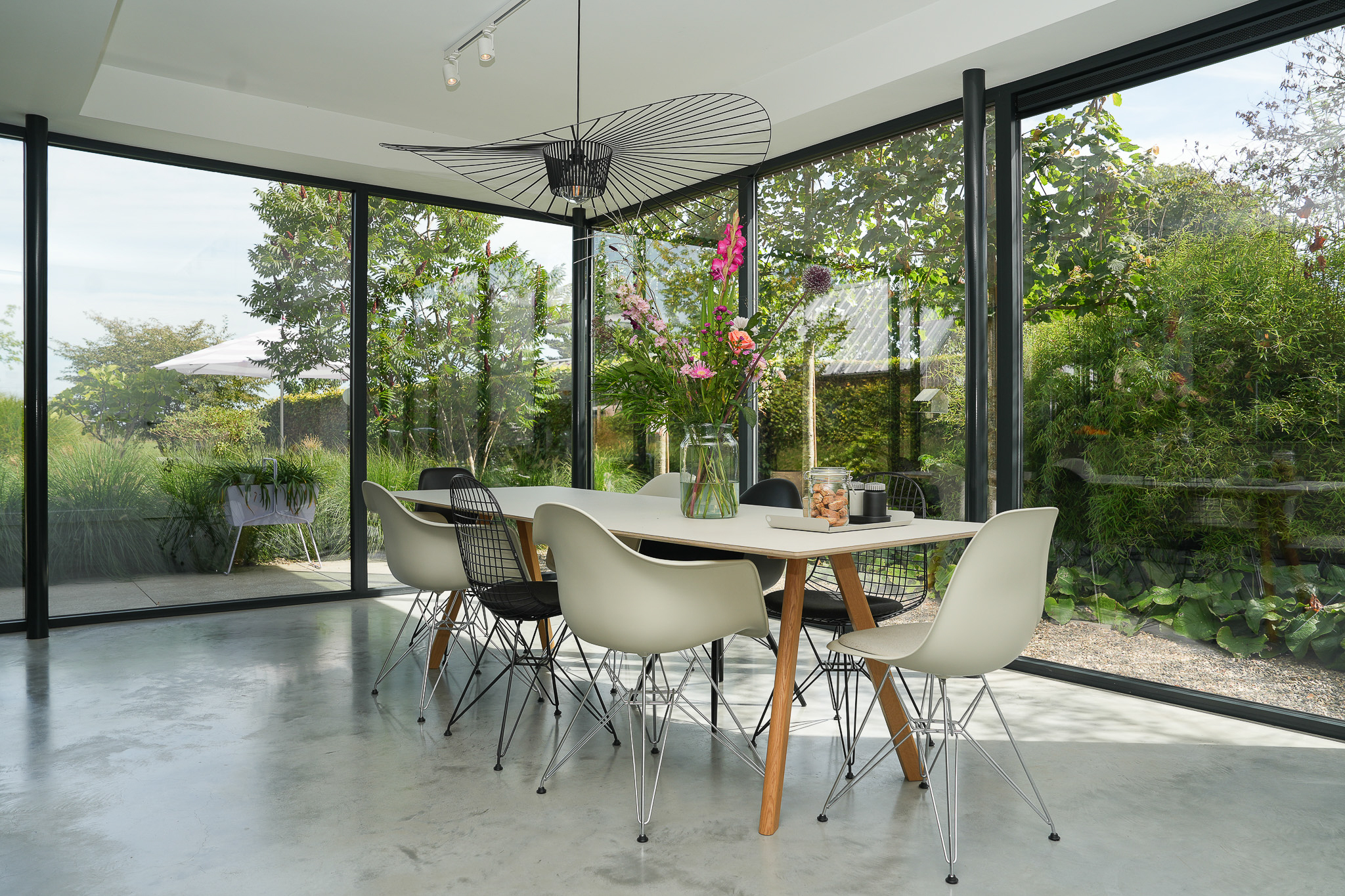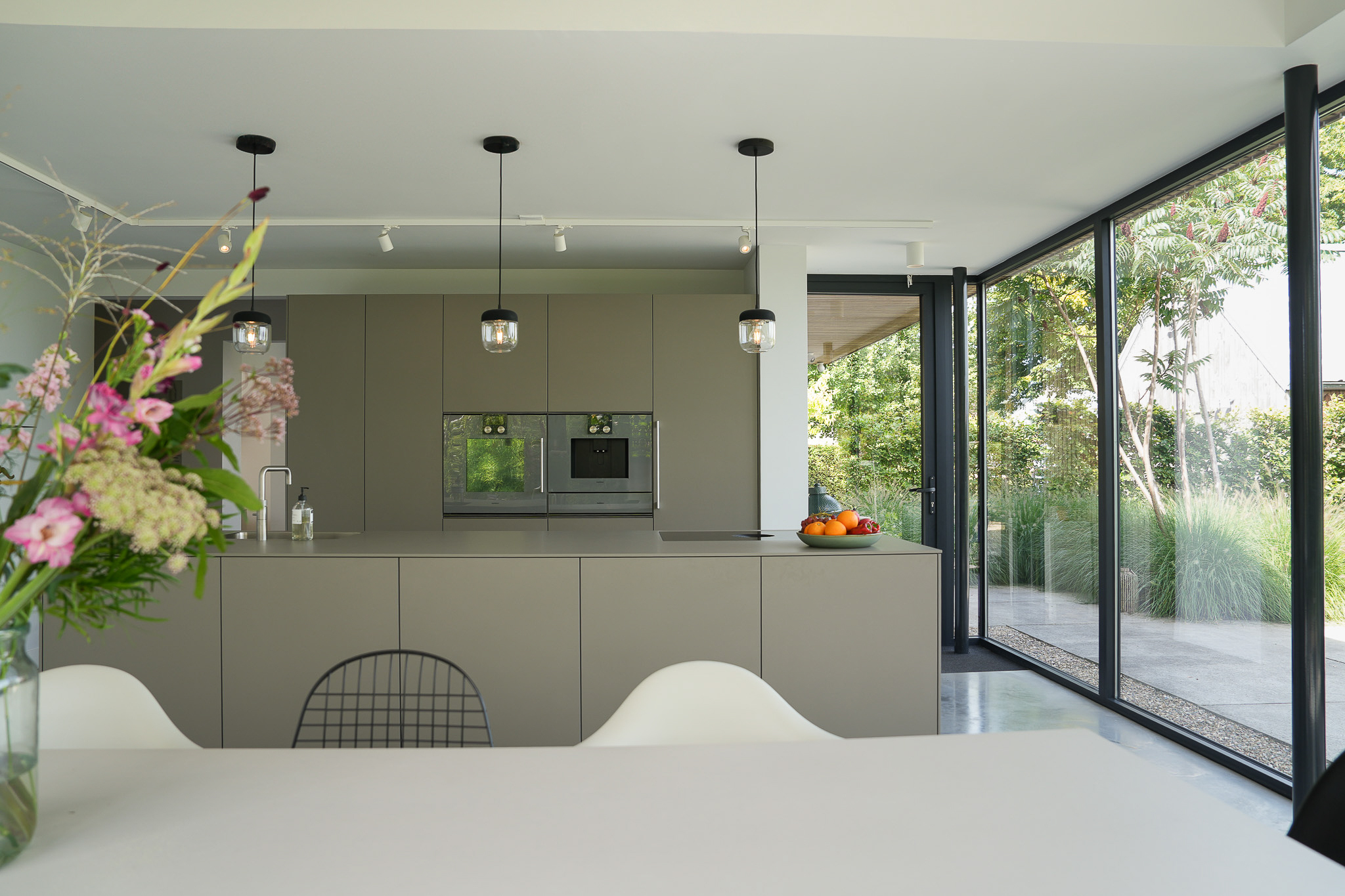 The kitchen extension is a true showpiece, with its glass walls creating a seamless connection to the garden. Indoors you enjoy light and space, outdoors awaits a landscaped green oasis with terraces and a swimming pond. Here, style, comfort and outdoor living come together.