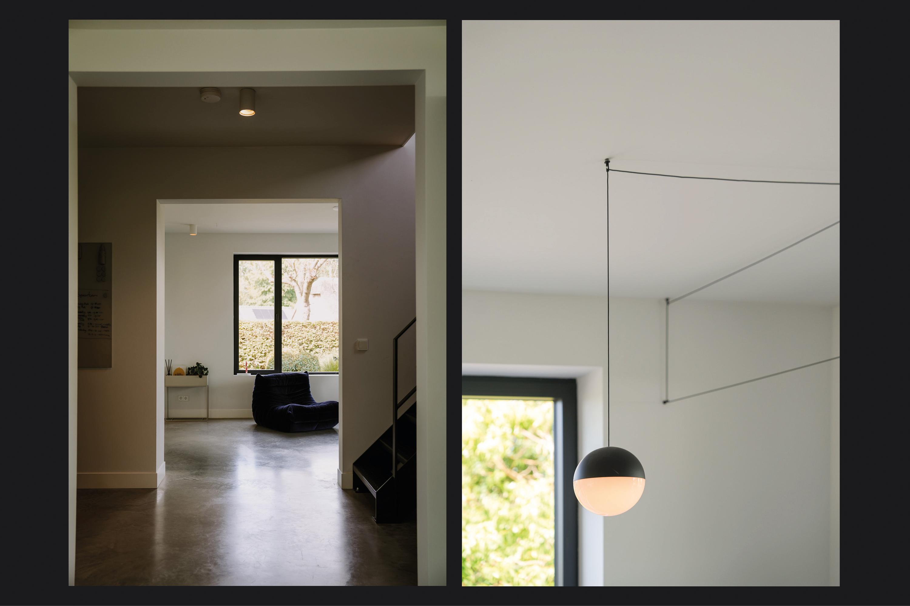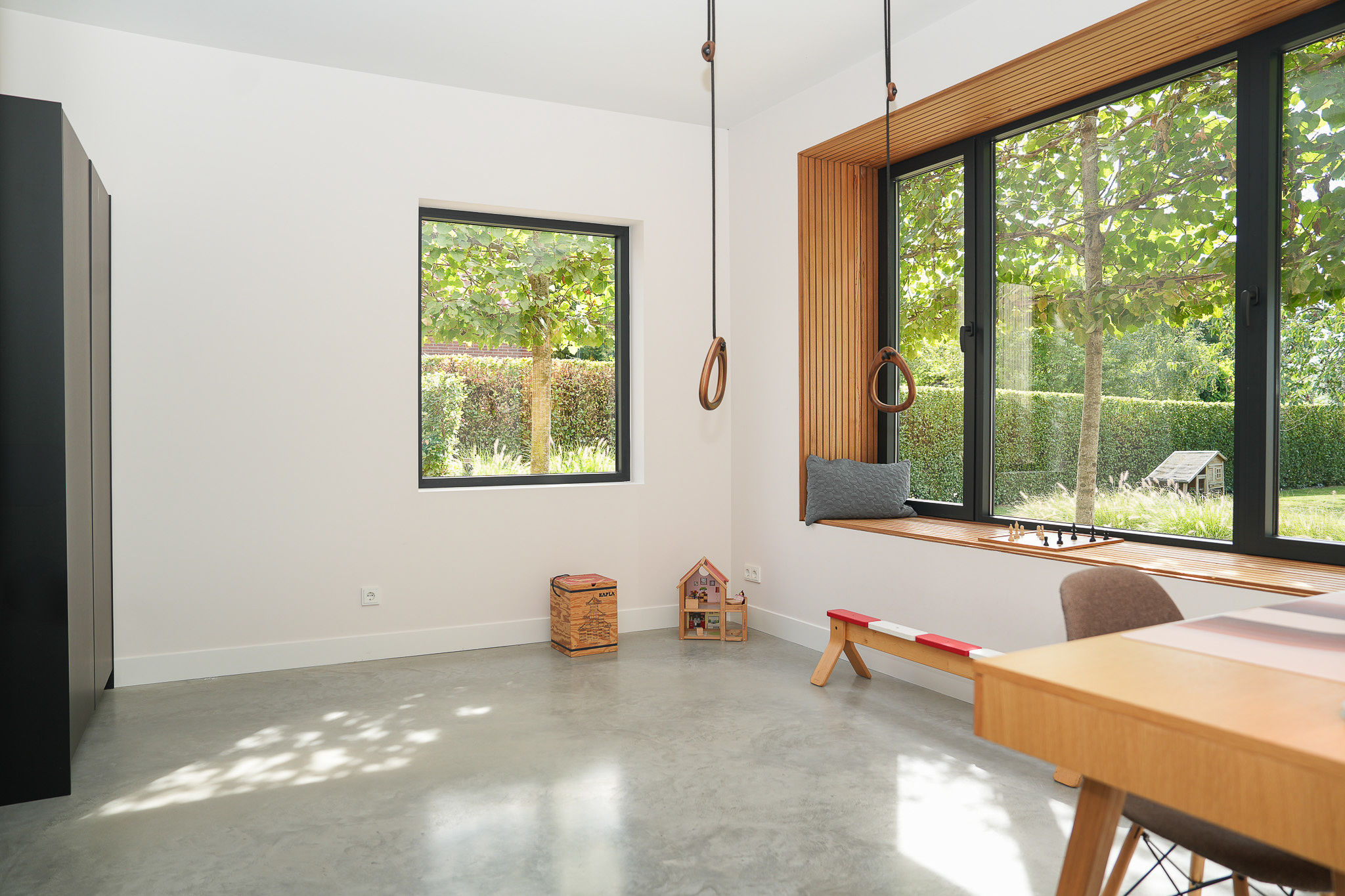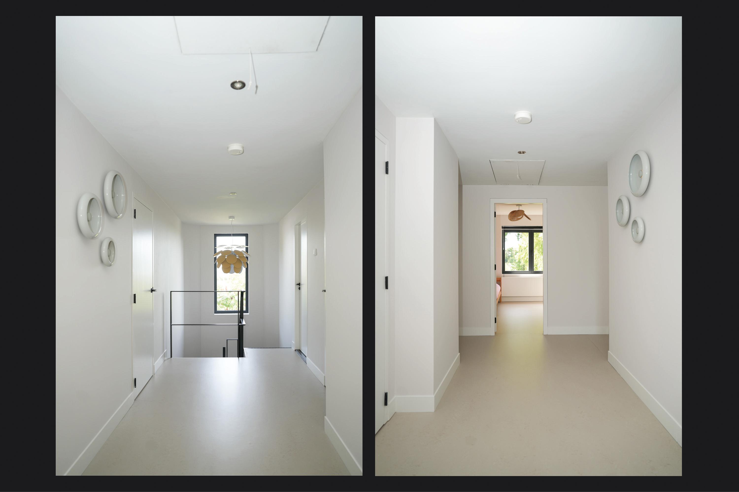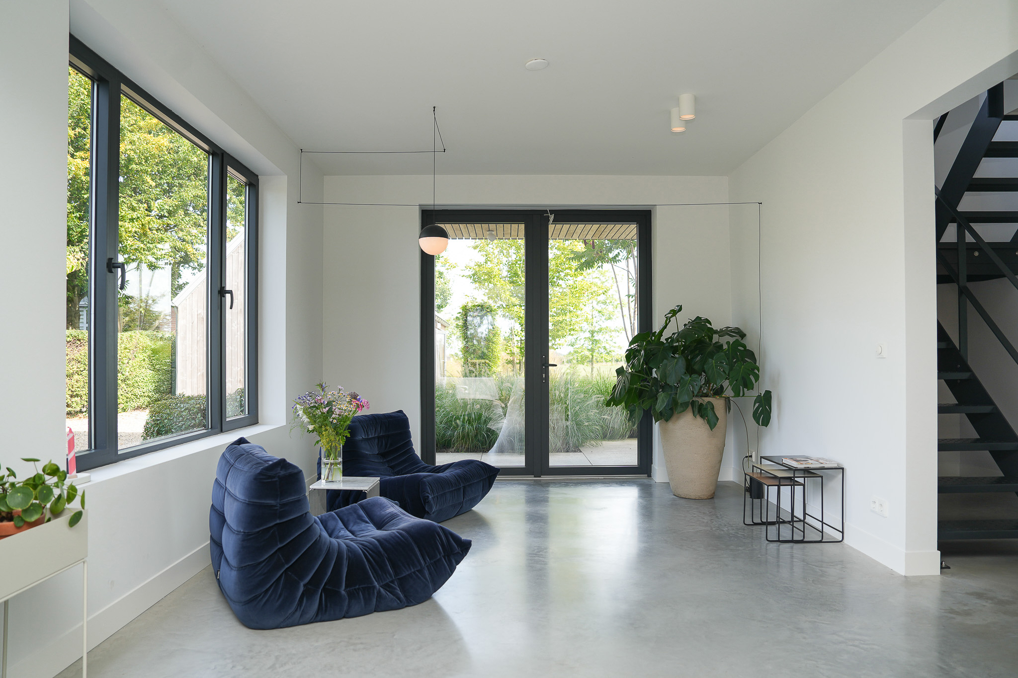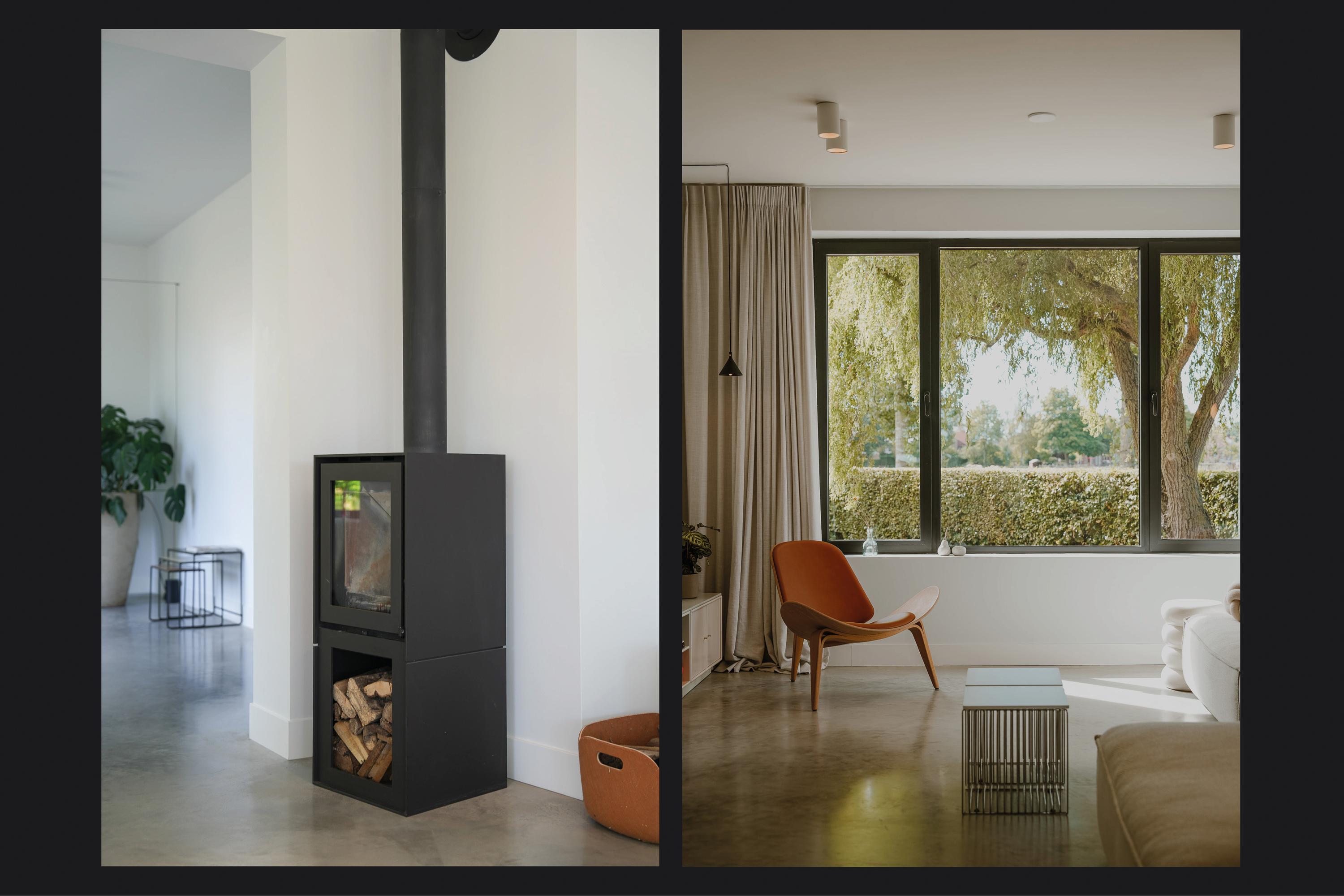 The entrance is centrally located behind the stately front door. The hallway, with its striking metal staircase, links the various rooms. To the left is the bright and atmospheric living room, with large windows, a modern poured floor and aluminium frames with HR++ glazing overlooking the driveway. A contemporary wood stove adds extra comfort on winter days. To the right is a second room, currently used as a playroom, but equally suitable as a study or fifth bedroom.