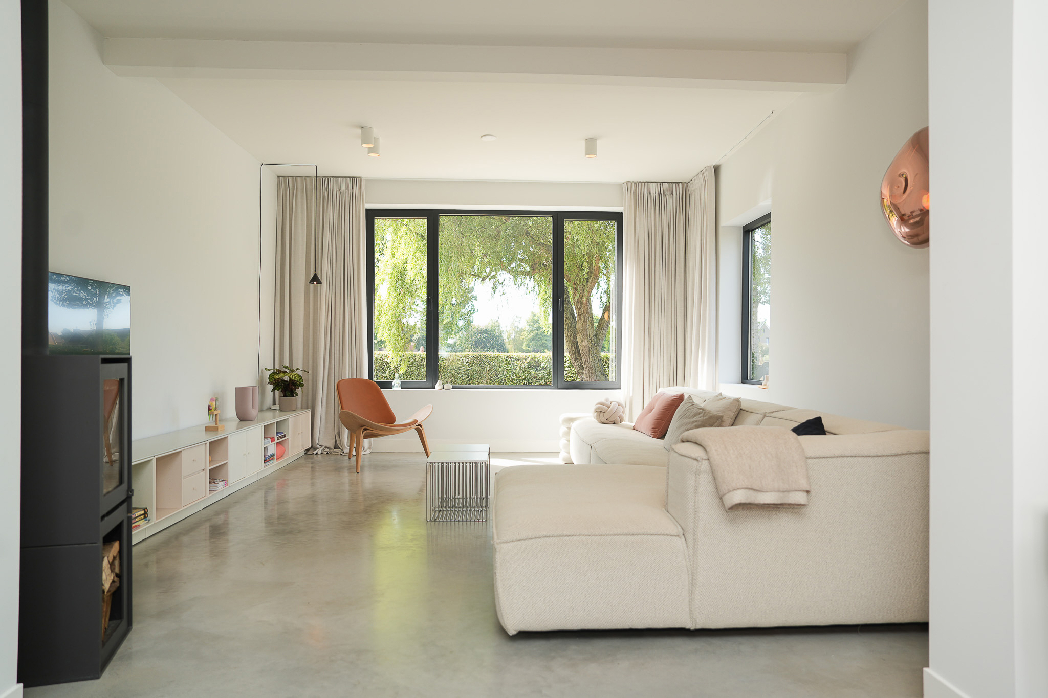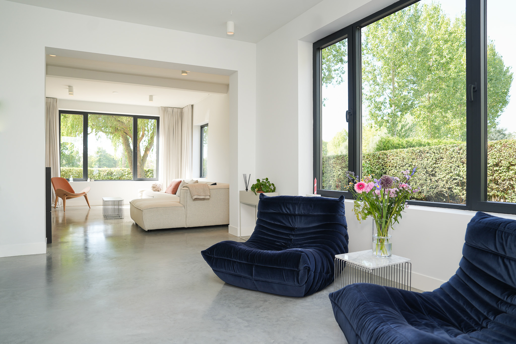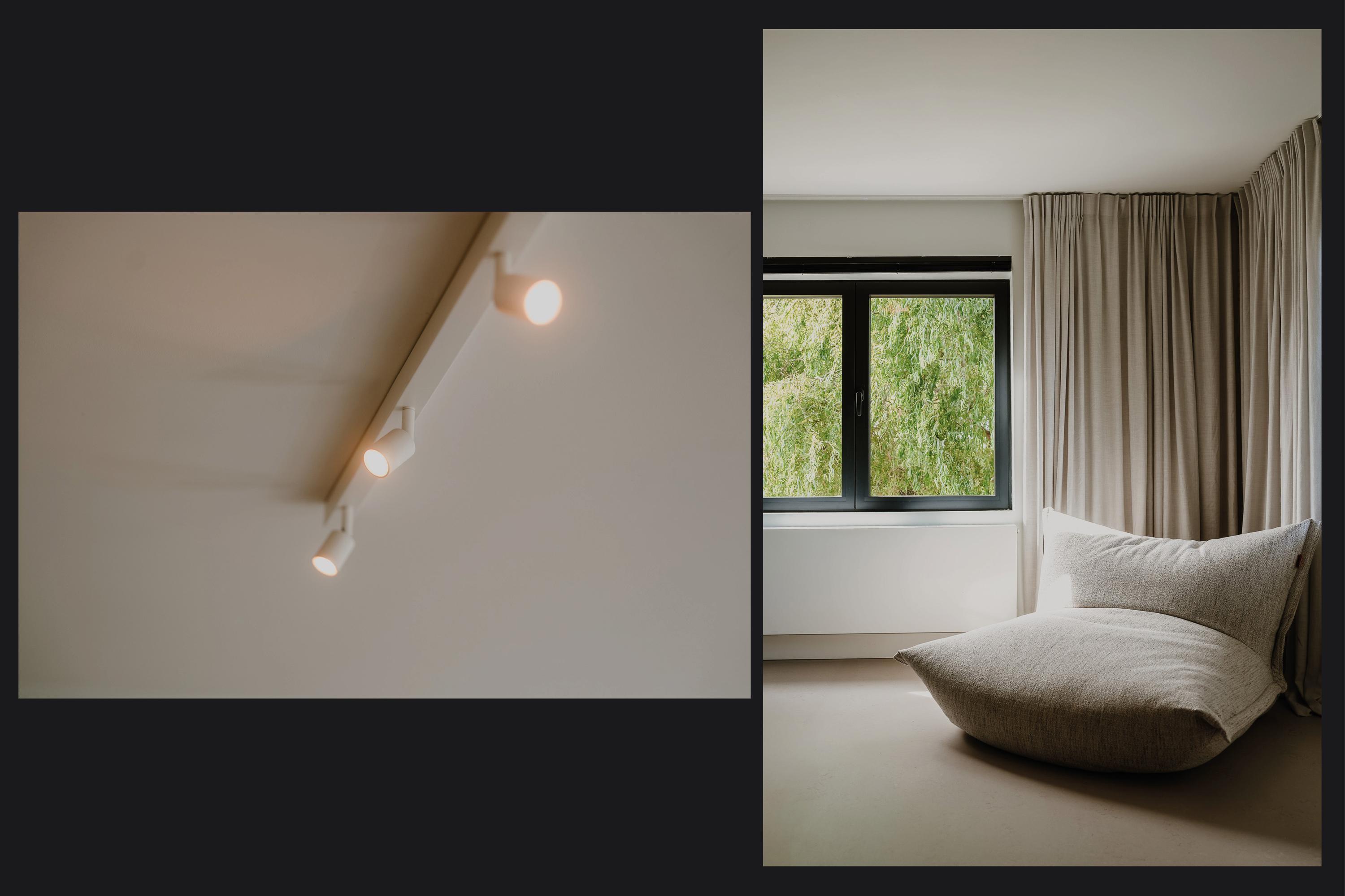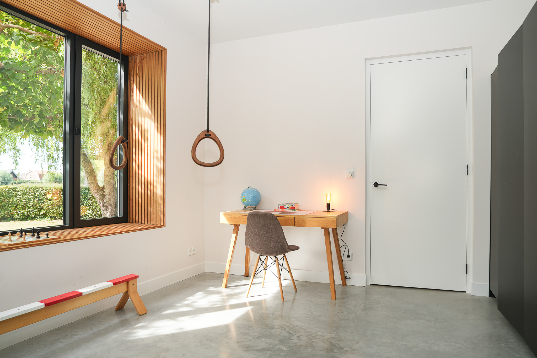 The entrance is centrally located behind the stately front door. The hallway, with its striking metal staircase, links the various rooms. To the left is the bright and atmospheric living room, with large windows, a modern poured floor and aluminium frames with HR++ glazing overlooking the driveway. A contemporary wood stove adds extra comfort on winter days. To the right is a second room, currently used as a playroom, but equally suitable as a study or fifth bedroom.