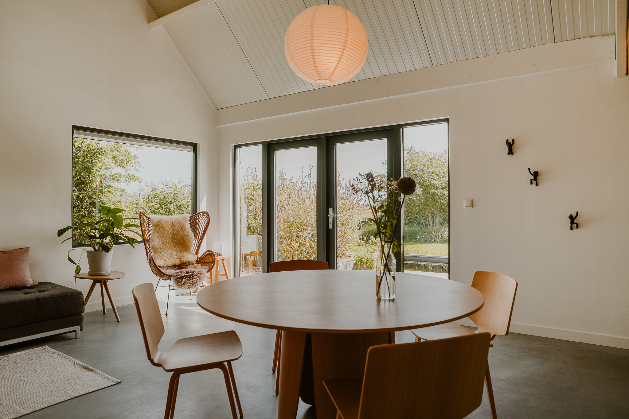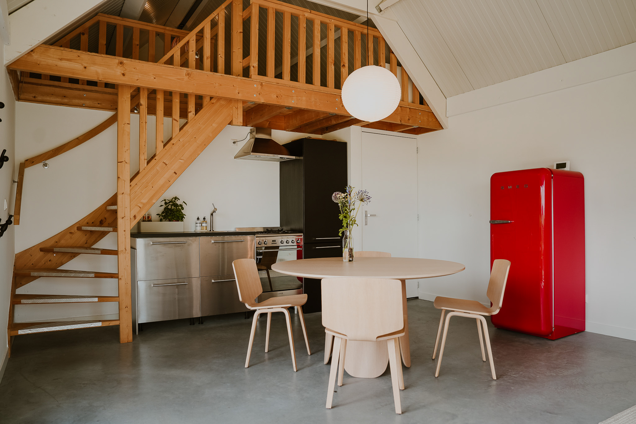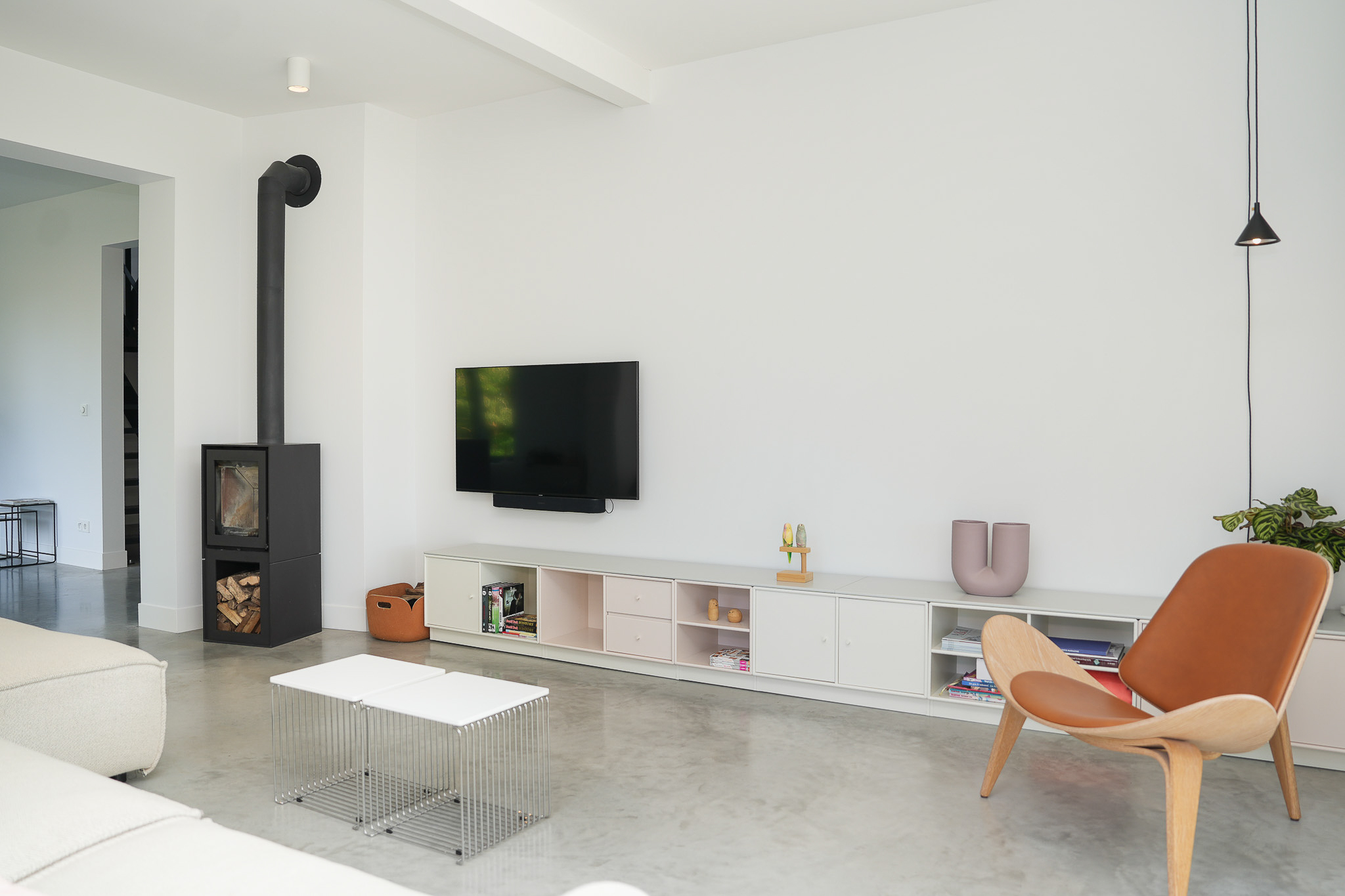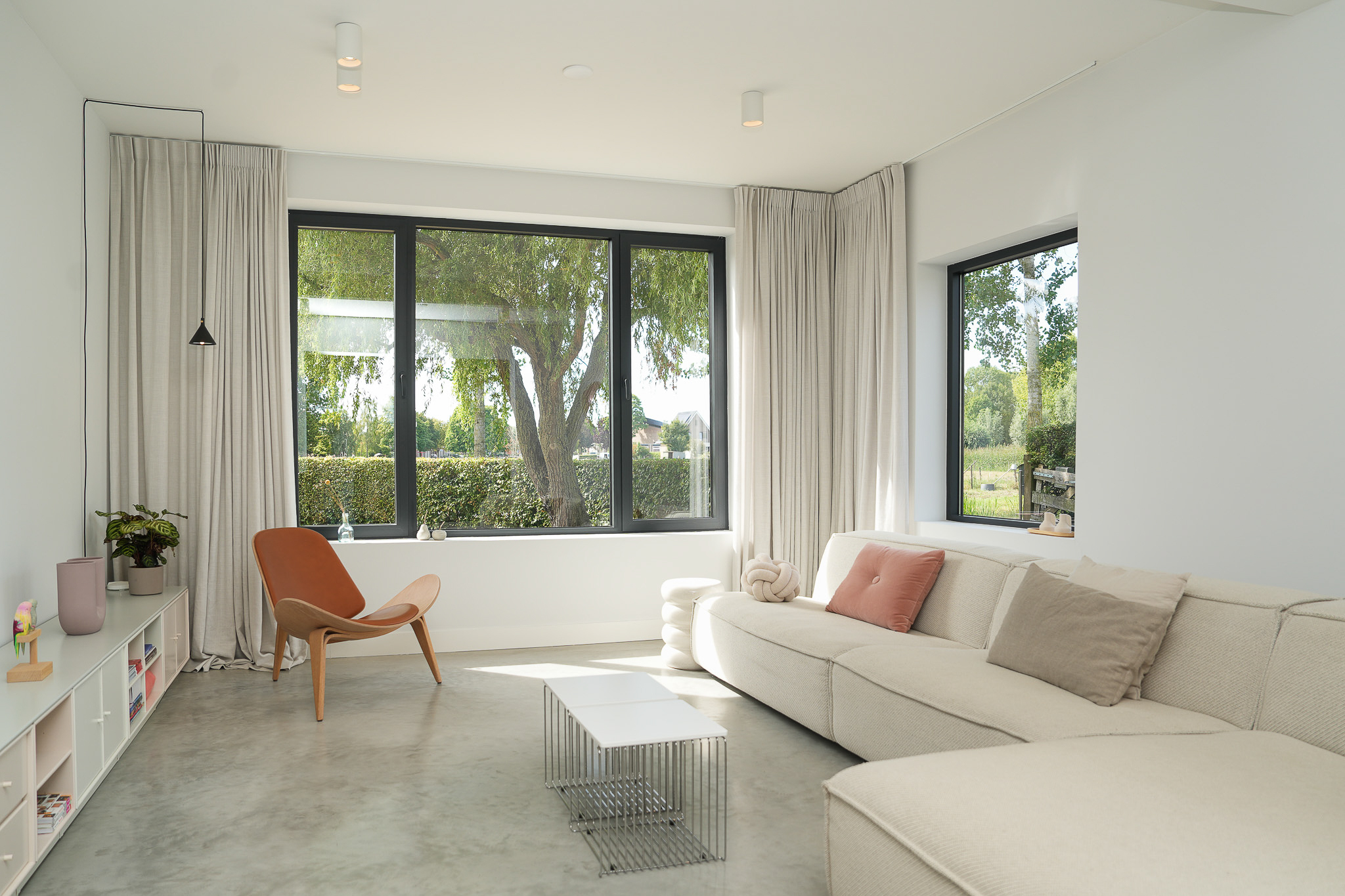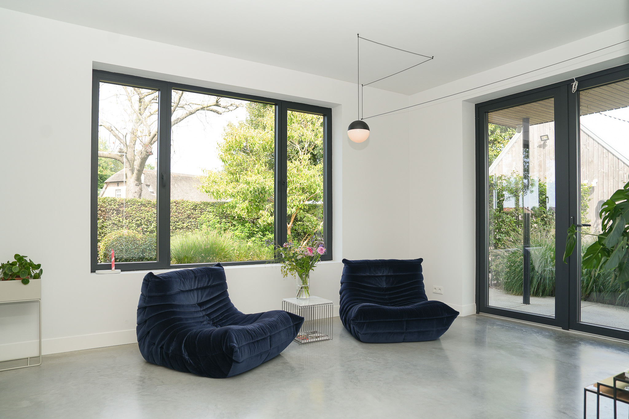 The entrance is centrally located behind the stately front door. The hallway, with its striking metal staircase, links the various rooms. To the left is the bright and atmospheric living room, with large windows, a modern poured floor and aluminium frames with HR++ glazing overlooking the driveway. A contemporary wood stove adds extra comfort on winter days. To the right is a second room, currently used as a playroom, but equally suitable as a study or fifth bedroom.