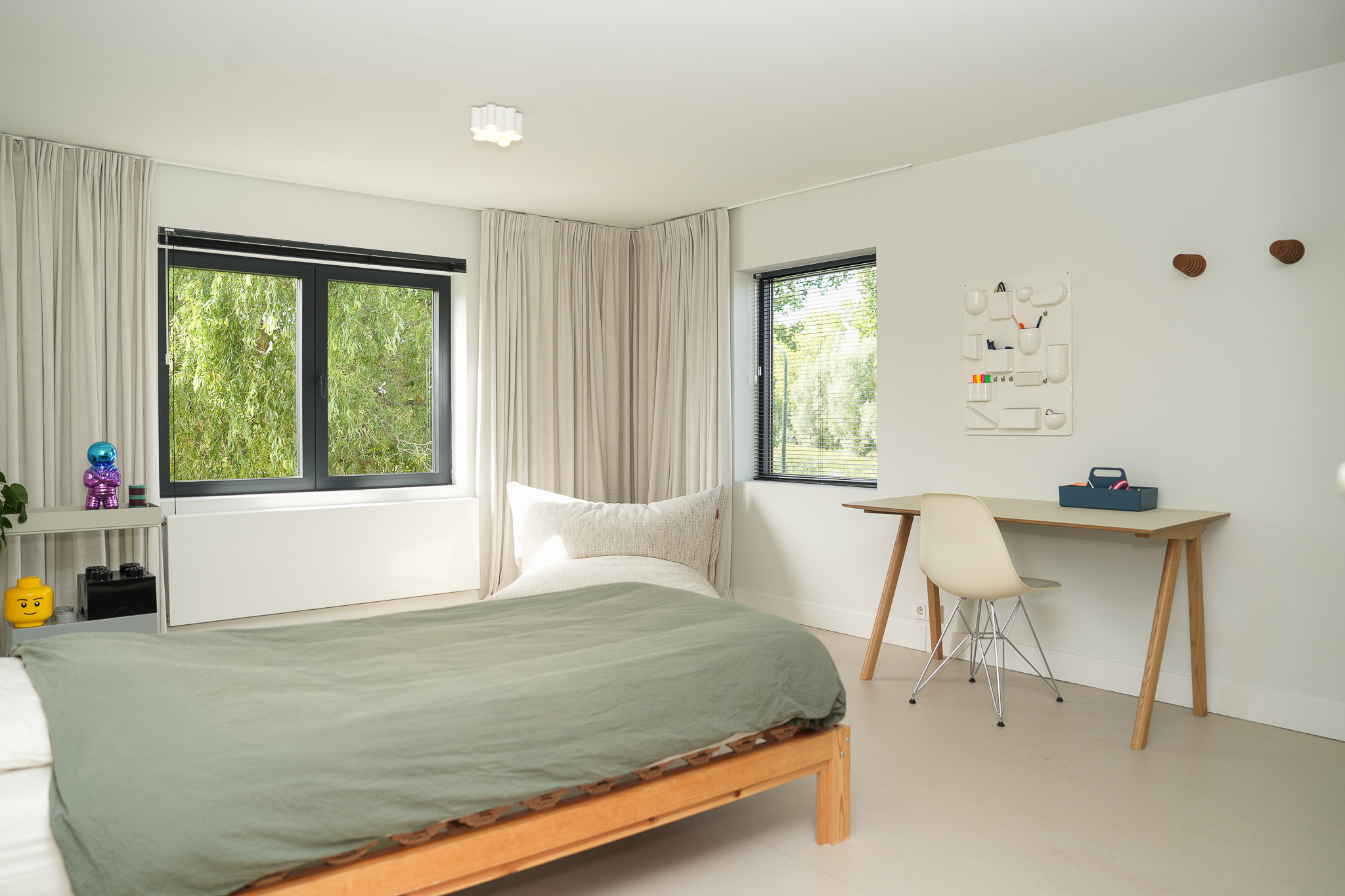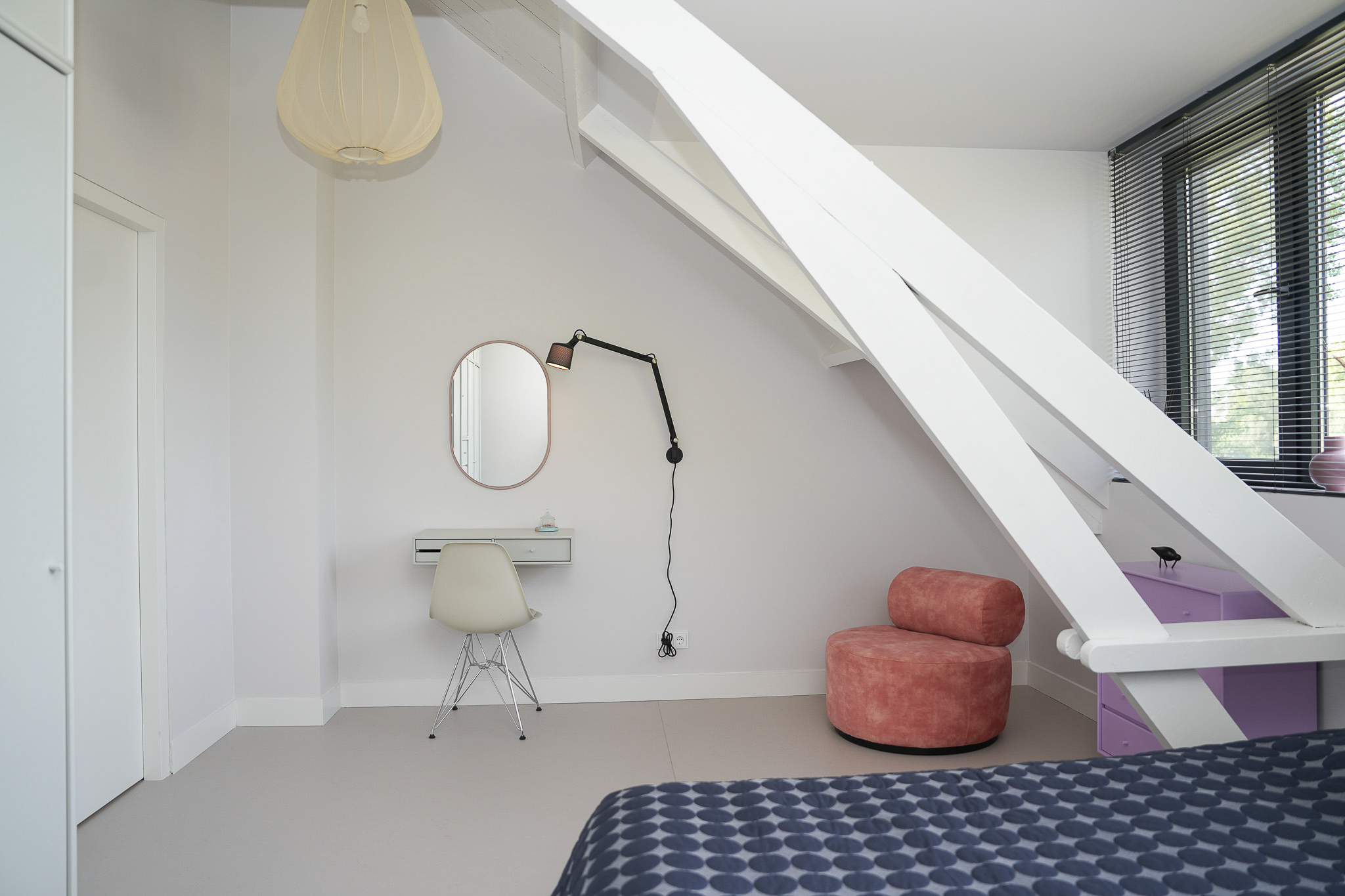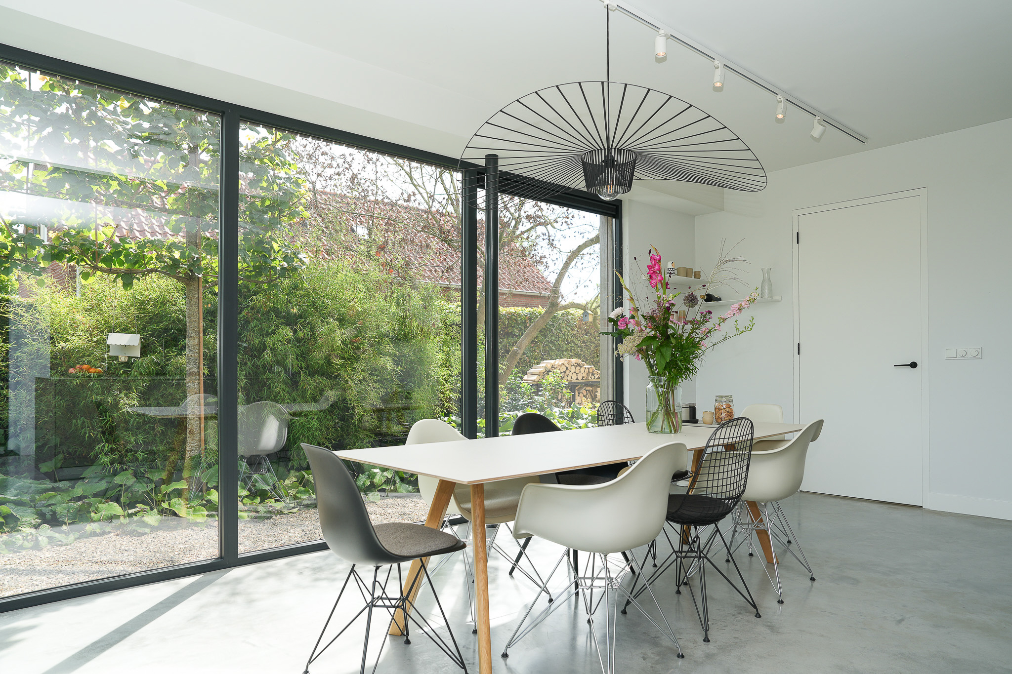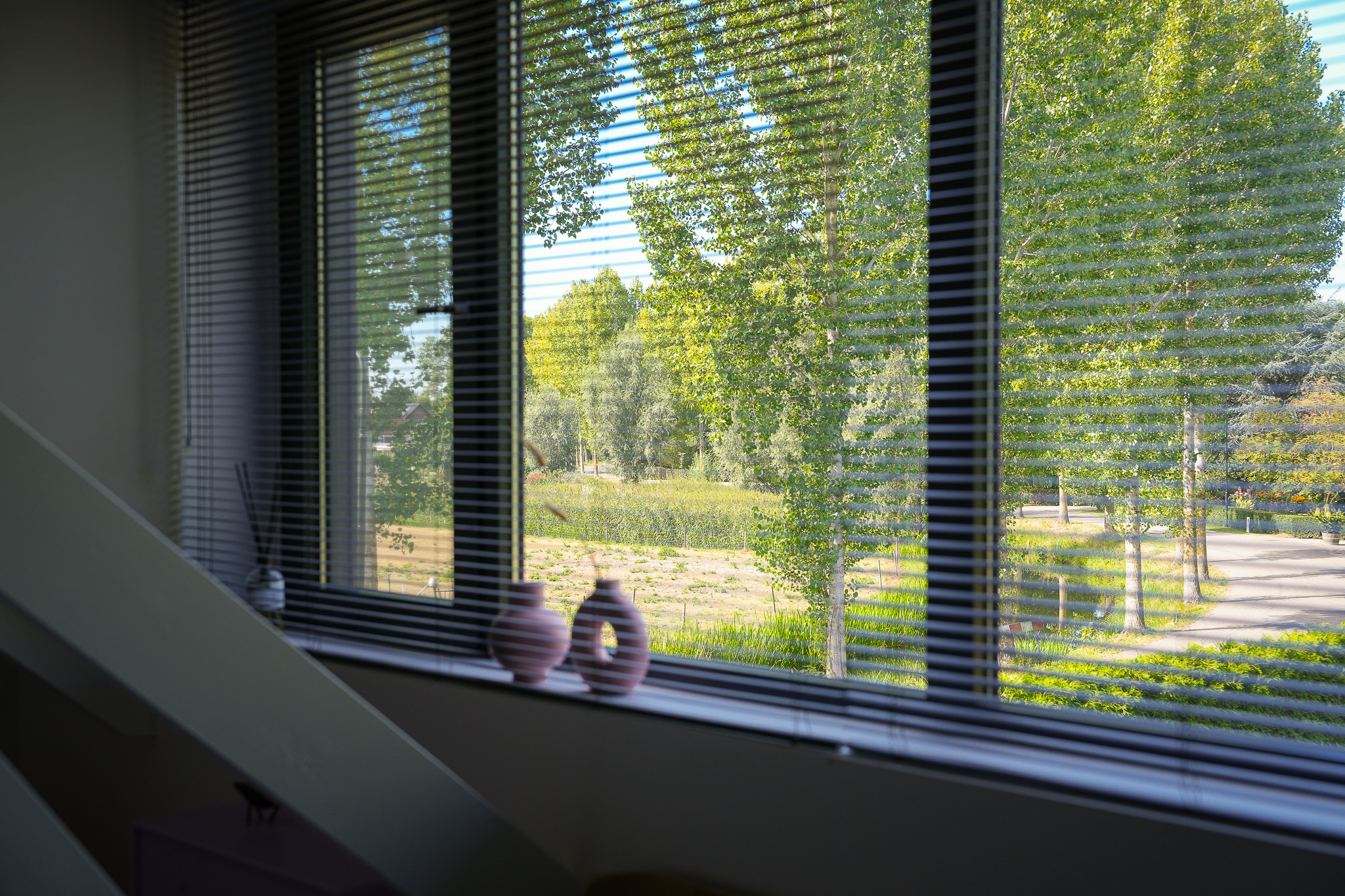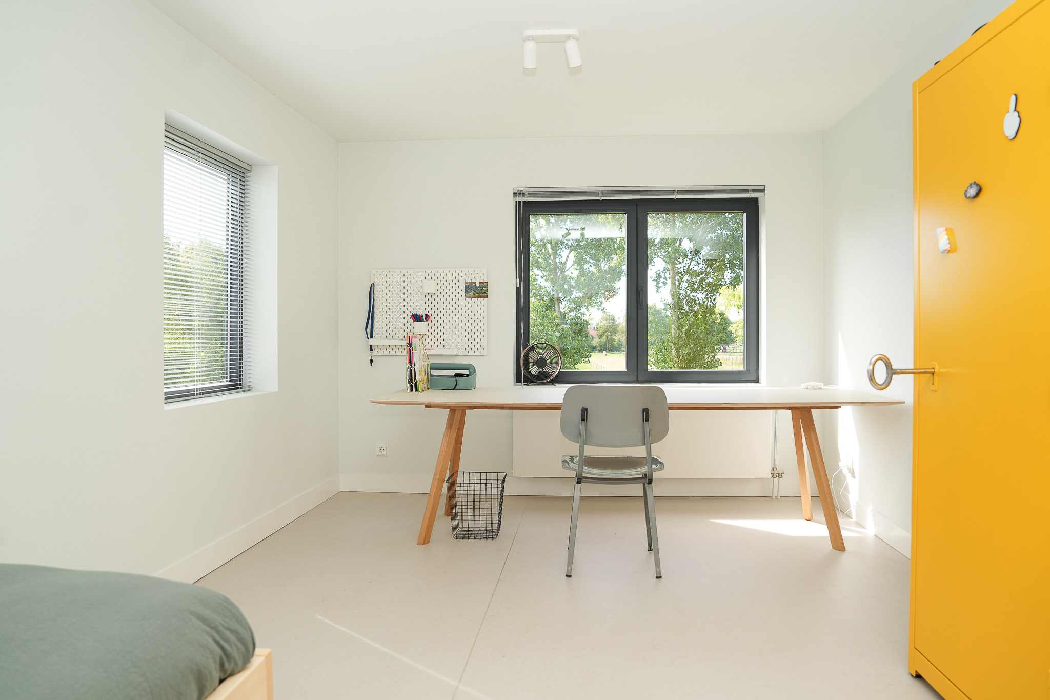 The entrance is centrally located behind the stately front door. The hallway, with its striking metal staircase, links the various rooms. To the left is the bright and atmospheric living room, with large windows, a modern poured floor and aluminium frames with HR++ glazing overlooking the driveway. A contemporary wood stove adds extra comfort on winter days. To the right is a second room, currently used as a playroom, but equally suitable as a study or fifth bedroom.