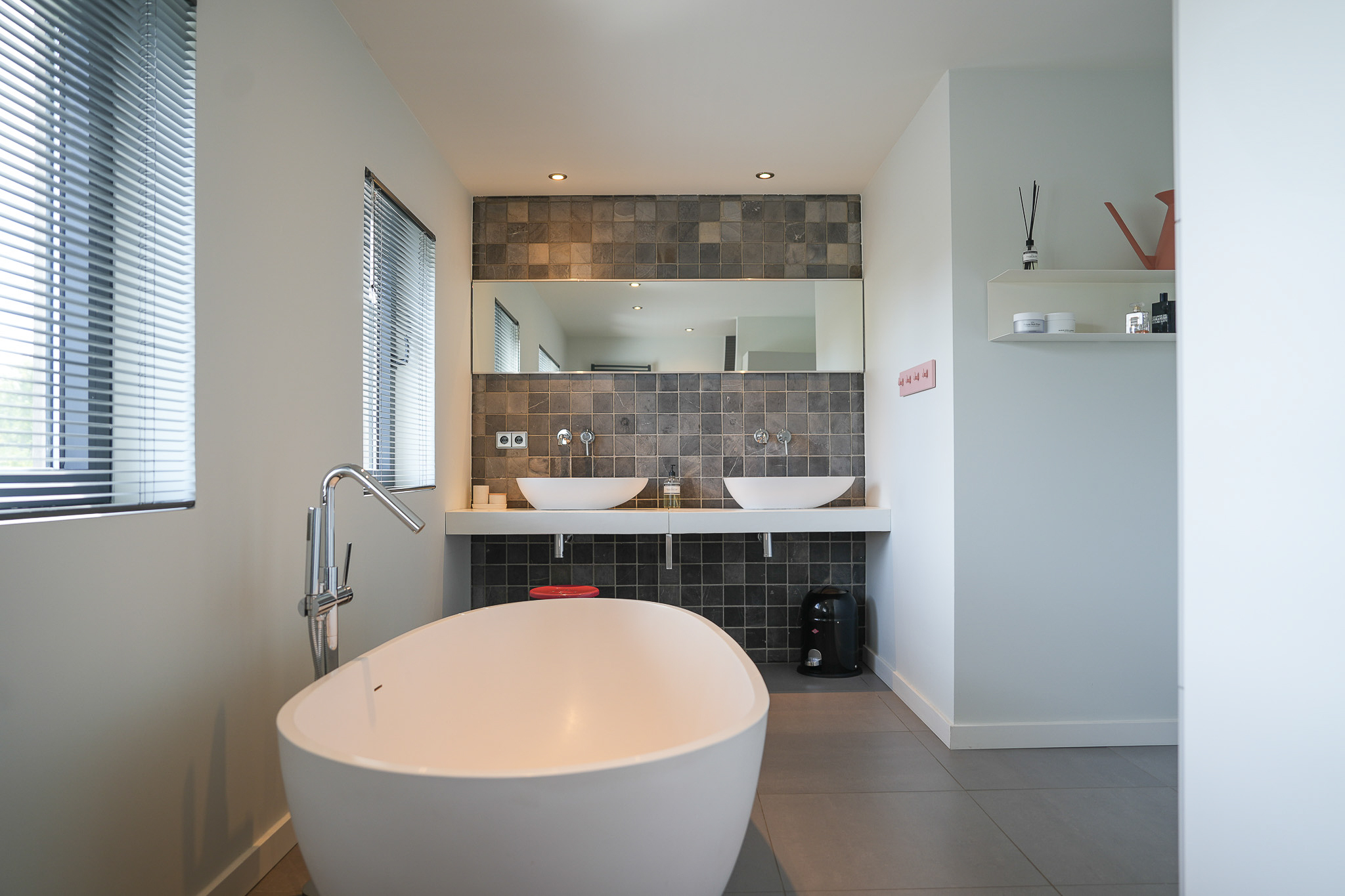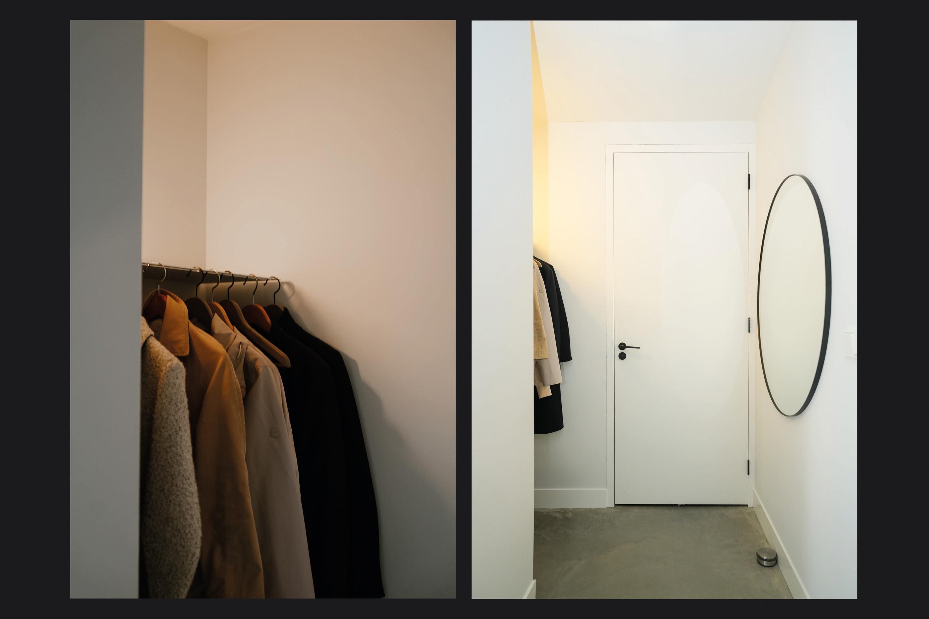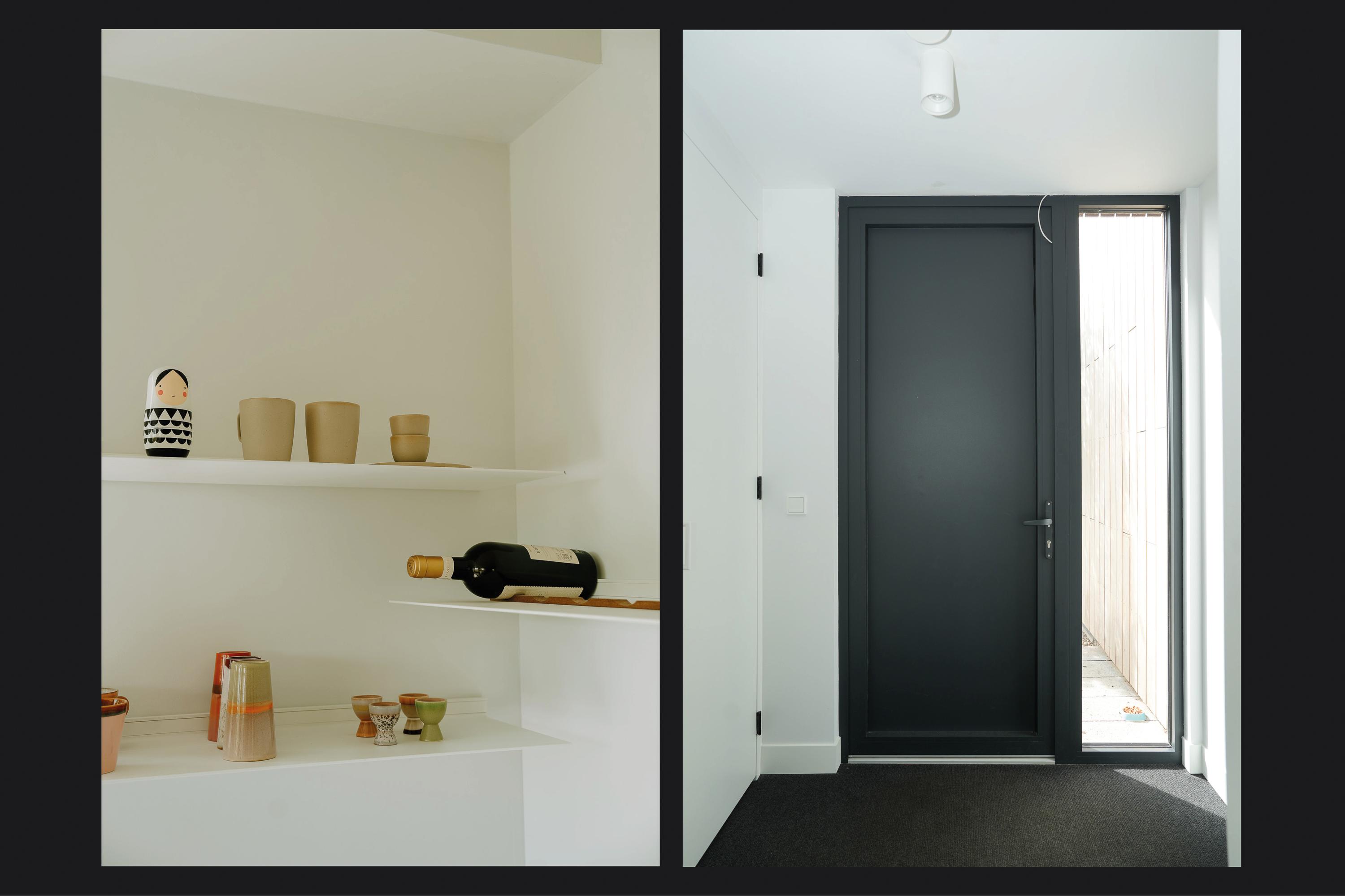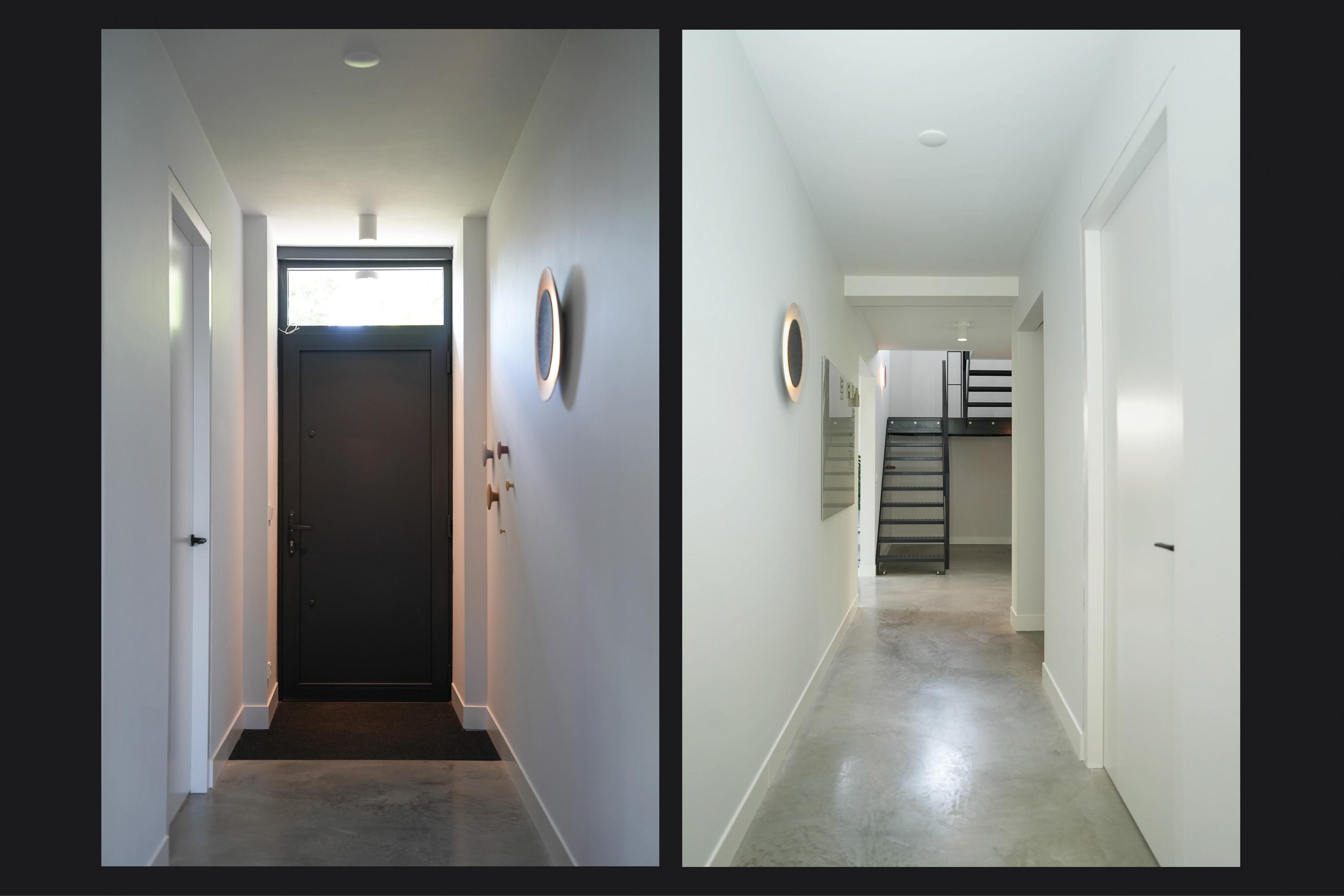 The entrance is centrally located behind the stately front door. The hallway, with its striking metal staircase, links the various rooms. To the left is the bright and atmospheric living room, with large windows, a modern poured floor and aluminium frames with HR++ glazing overlooking the driveway. A contemporary wood stove adds extra comfort on winter days. To the right is a second room, currently used as a playroom, but equally suitable as a study or fifth bedroom.
