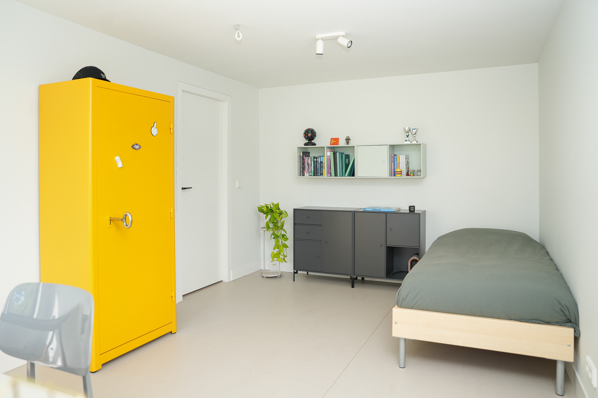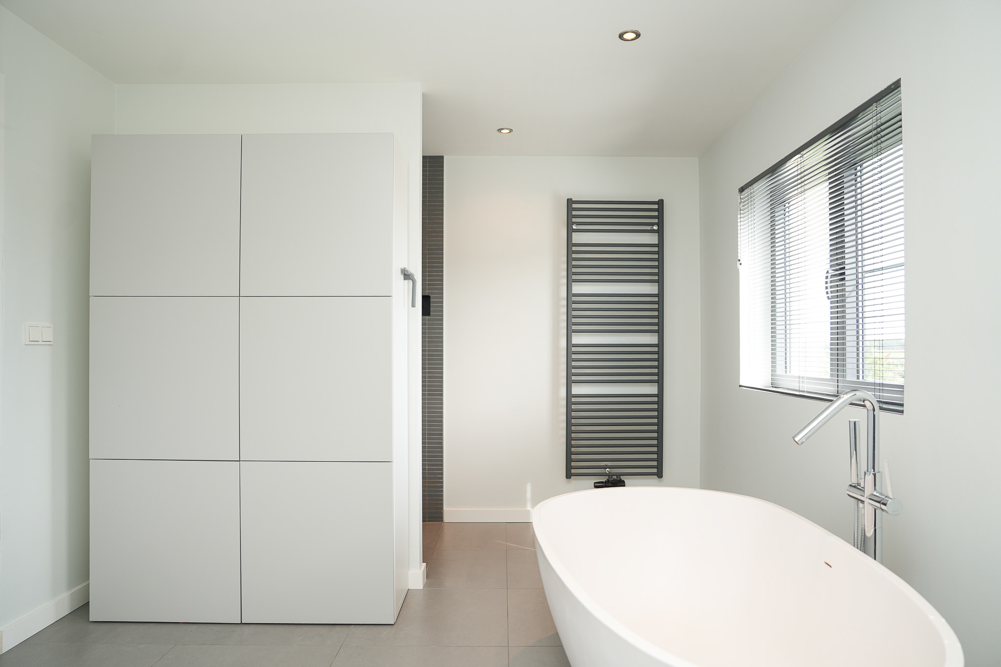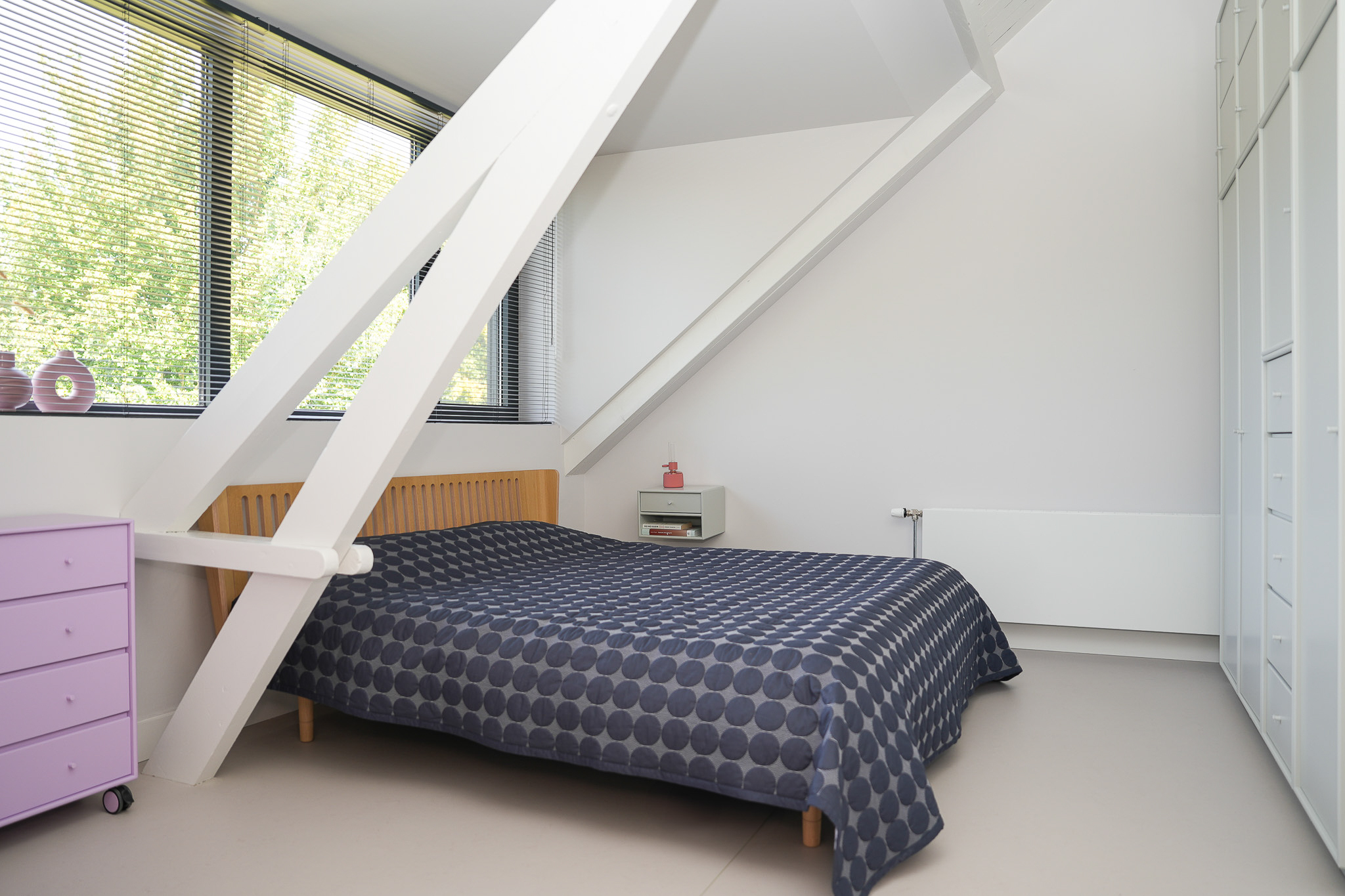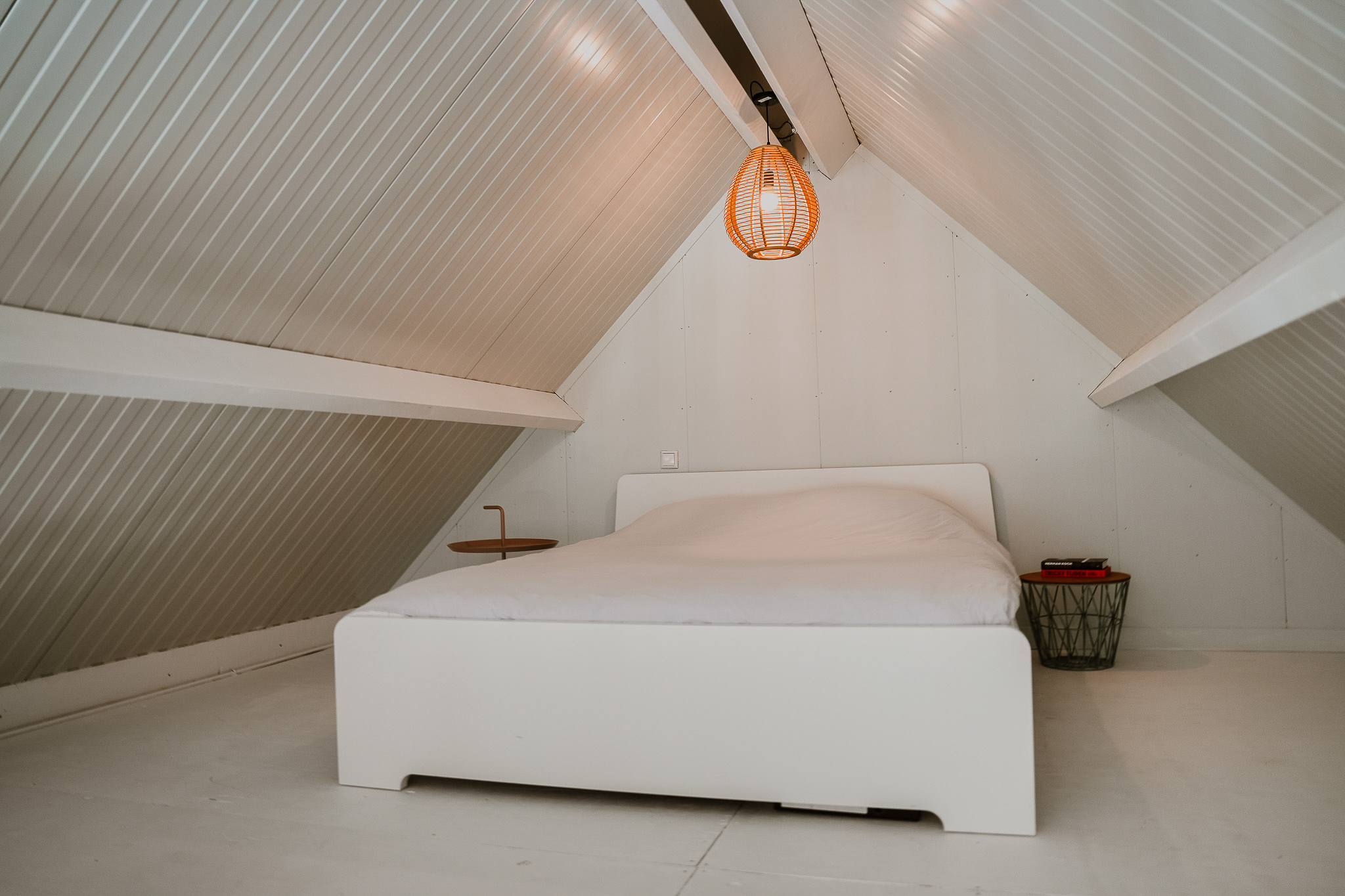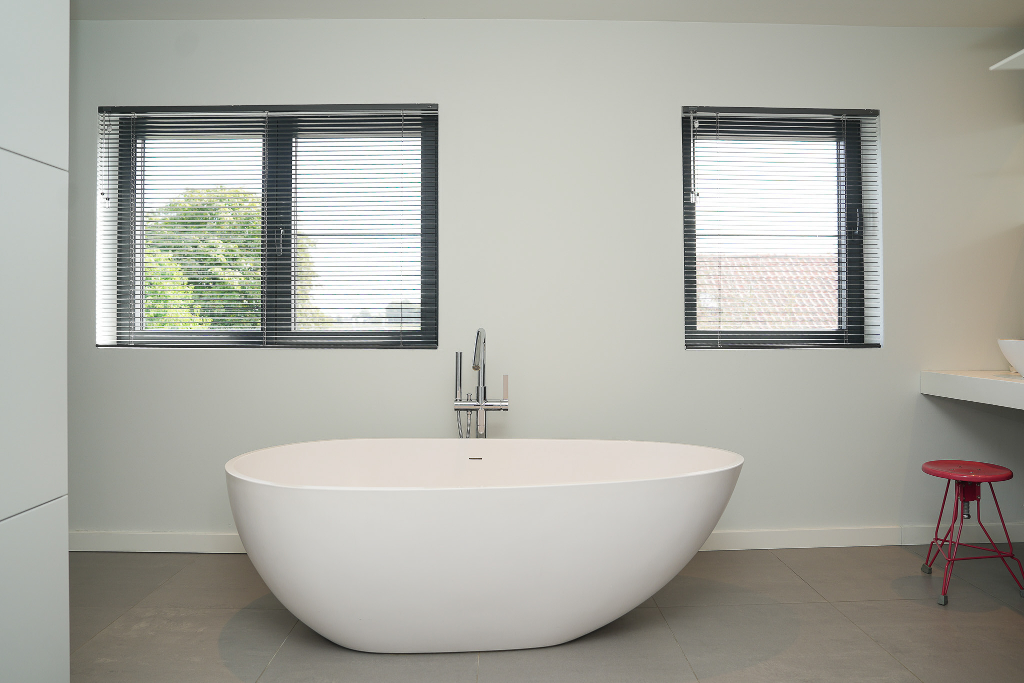 The entrance is centrally located behind the stately front door. The hallway, with its striking metal staircase, links the various rooms. To the left is the bright and atmospheric living room, with large windows, a modern poured floor and aluminium frames with HR++ glazing overlooking the driveway. A contemporary wood stove adds extra comfort on winter days. To the right is a second room, currently used as a playroom, but equally suitable as a study or fifth bedroom.