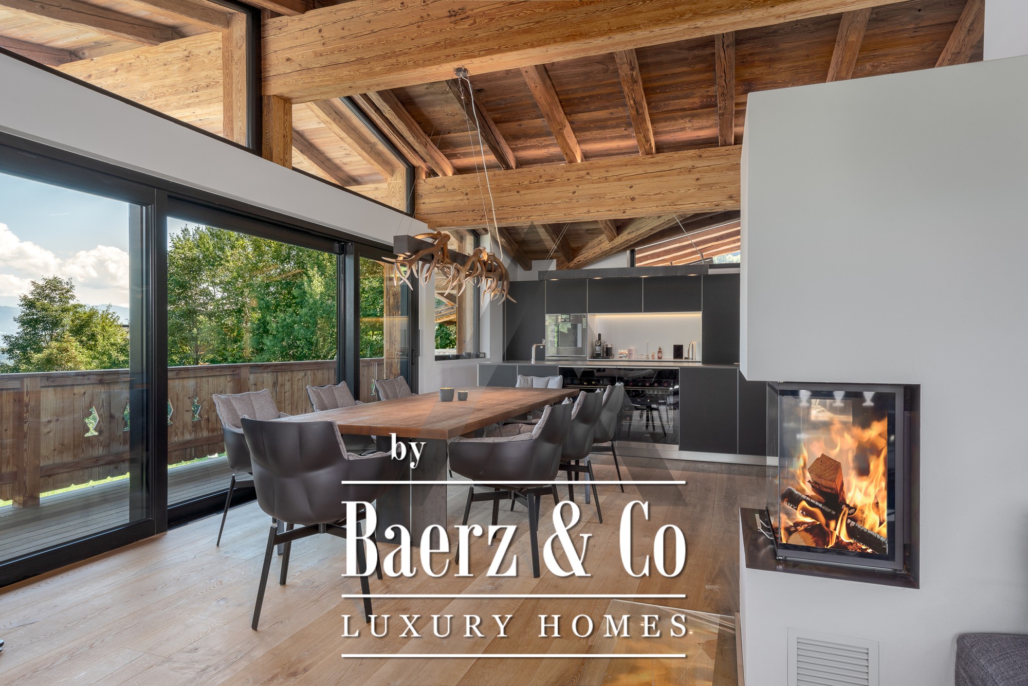 On the top floor, a generous open plan living, dining and kitchen area creates a sense of volume beneath exposed reclaimed wood beams. The modern kitchen features Gaggenau appliances, while an open fireplace adds both warmth and understated elegance. Large wrap-around decks and balconies invite sun and panorama into daily life, seamlessly connecting inside and out.