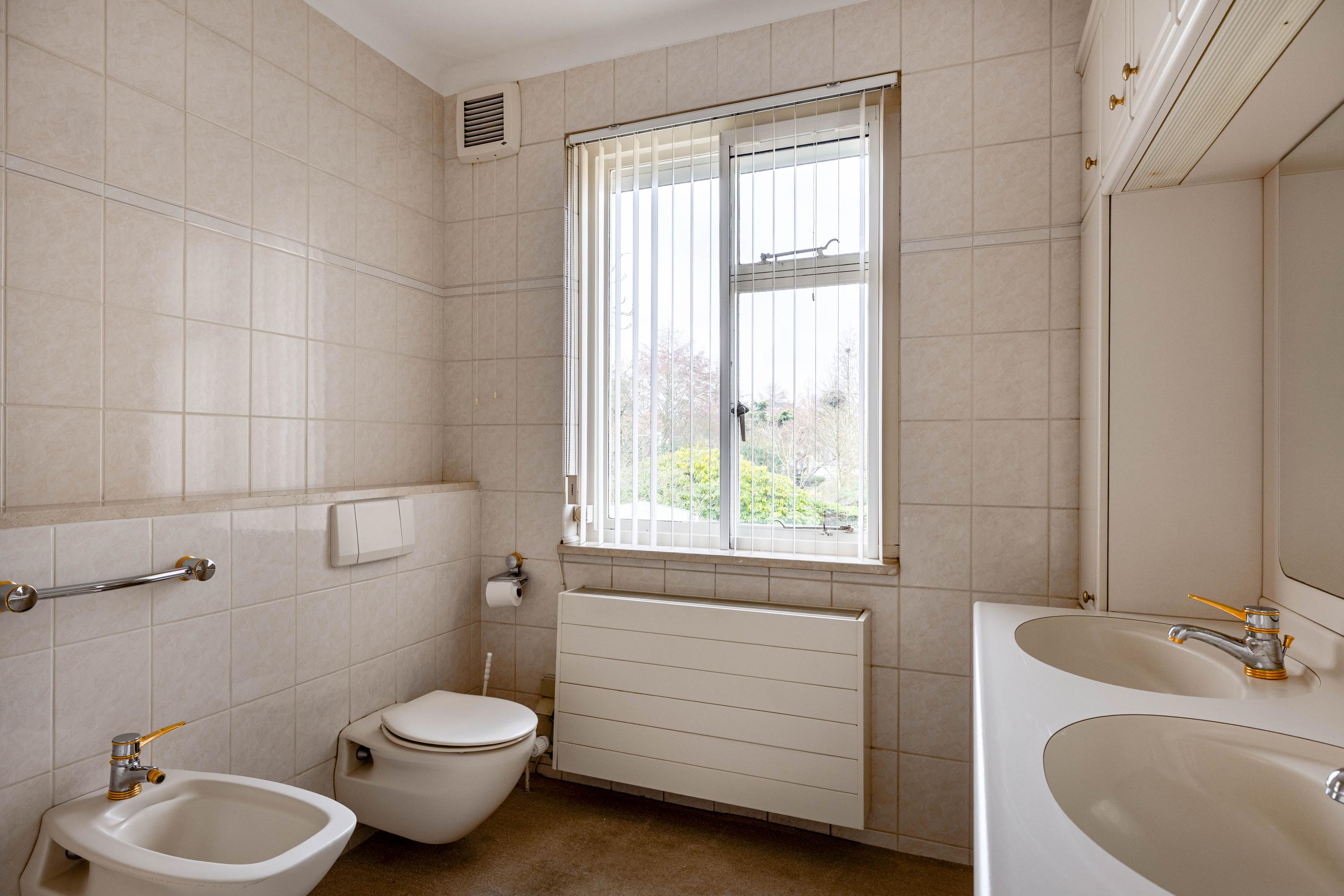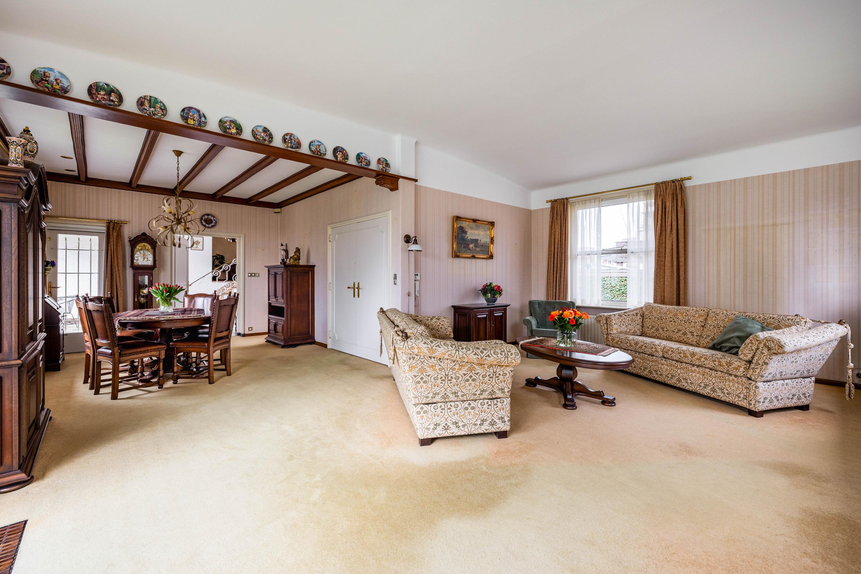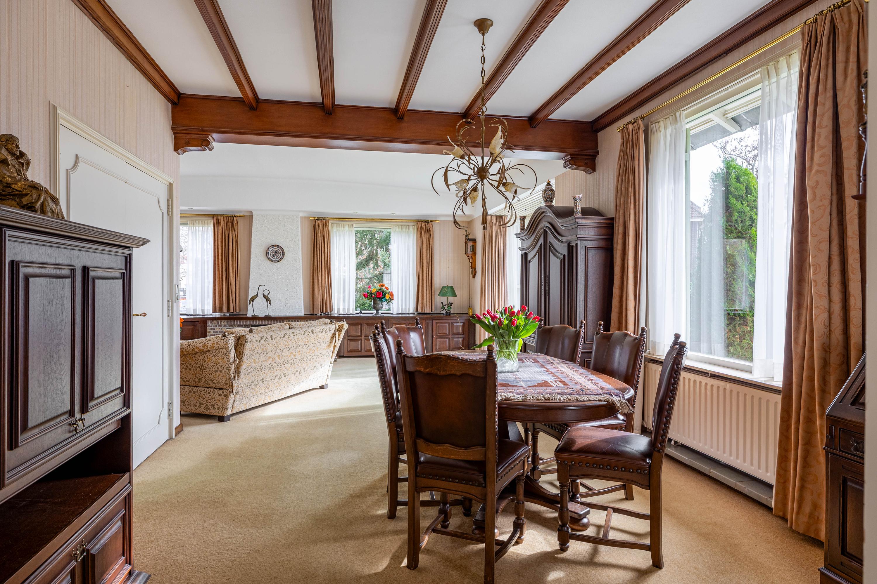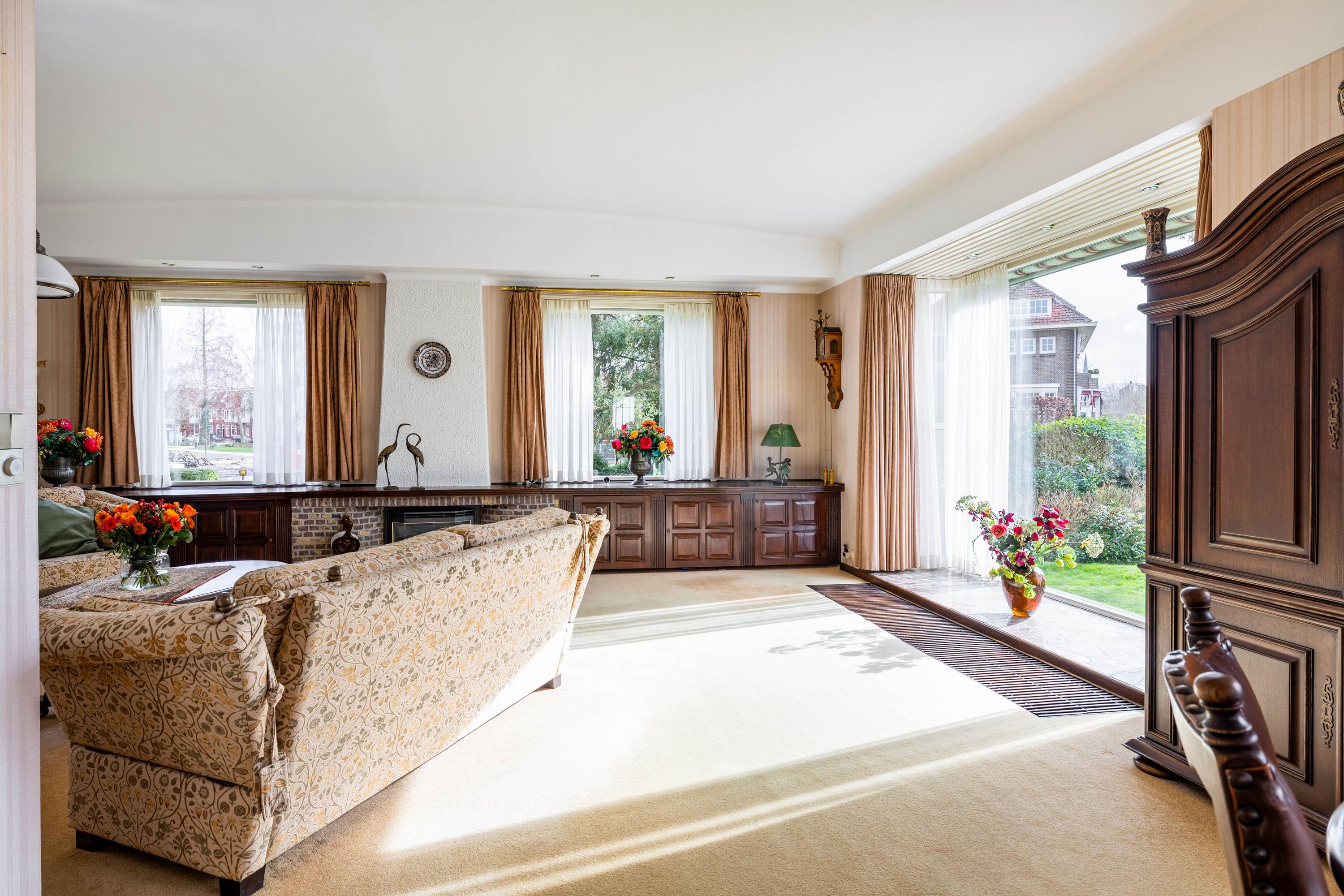 The living room is spacious and stately, featuring a fireplace and a bay window with a large pane of glass. Due to the elevated position of the house, you enjoy views over the park on two sides. Light floods in generously thanks to the large windows on the sunny side. Adjacent is the dining room, with a door to the terrace and to the kitchen. The enclosed kitchen is laid out in an L-shape and features built-in appliances and fixed cupboard space.