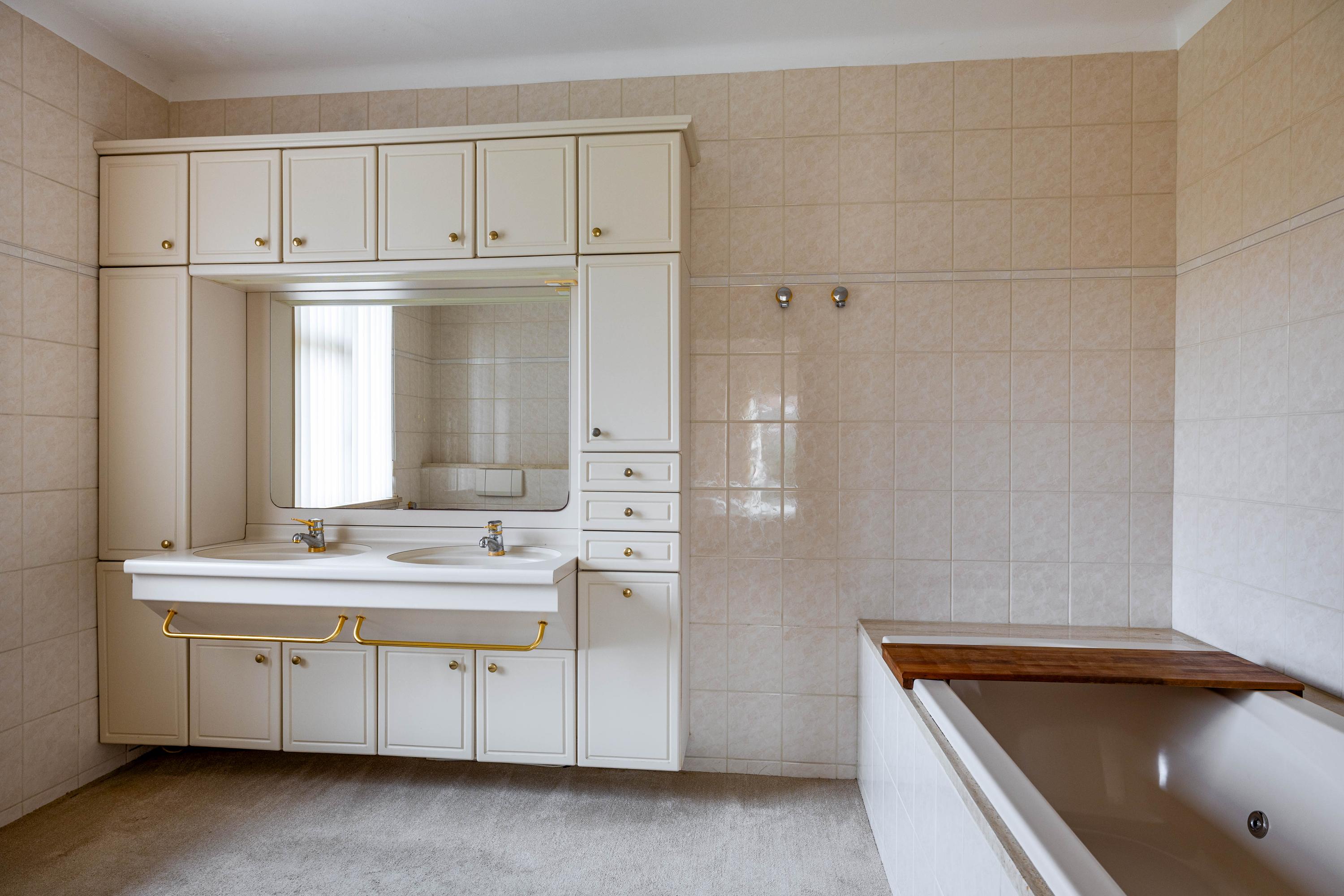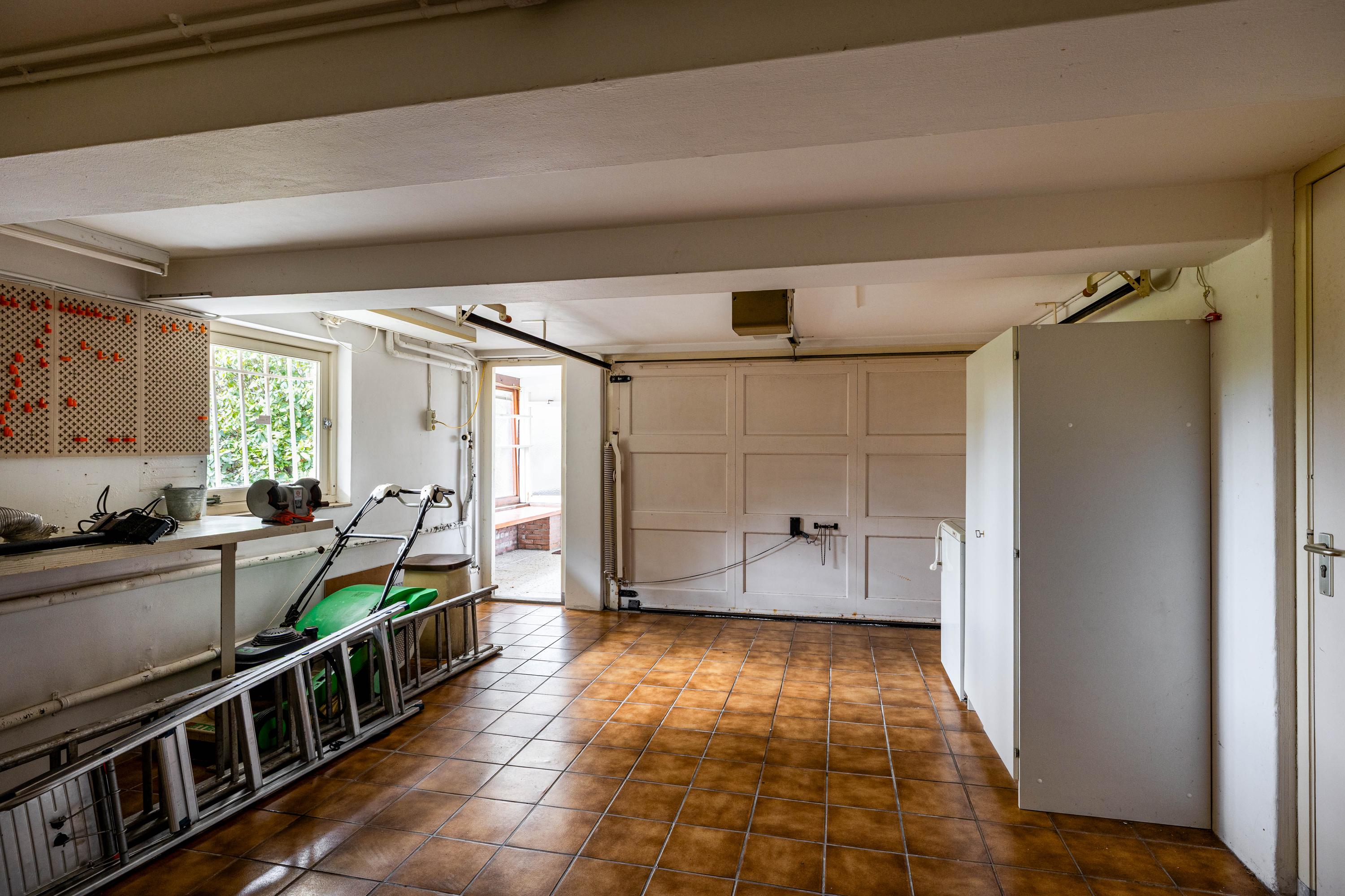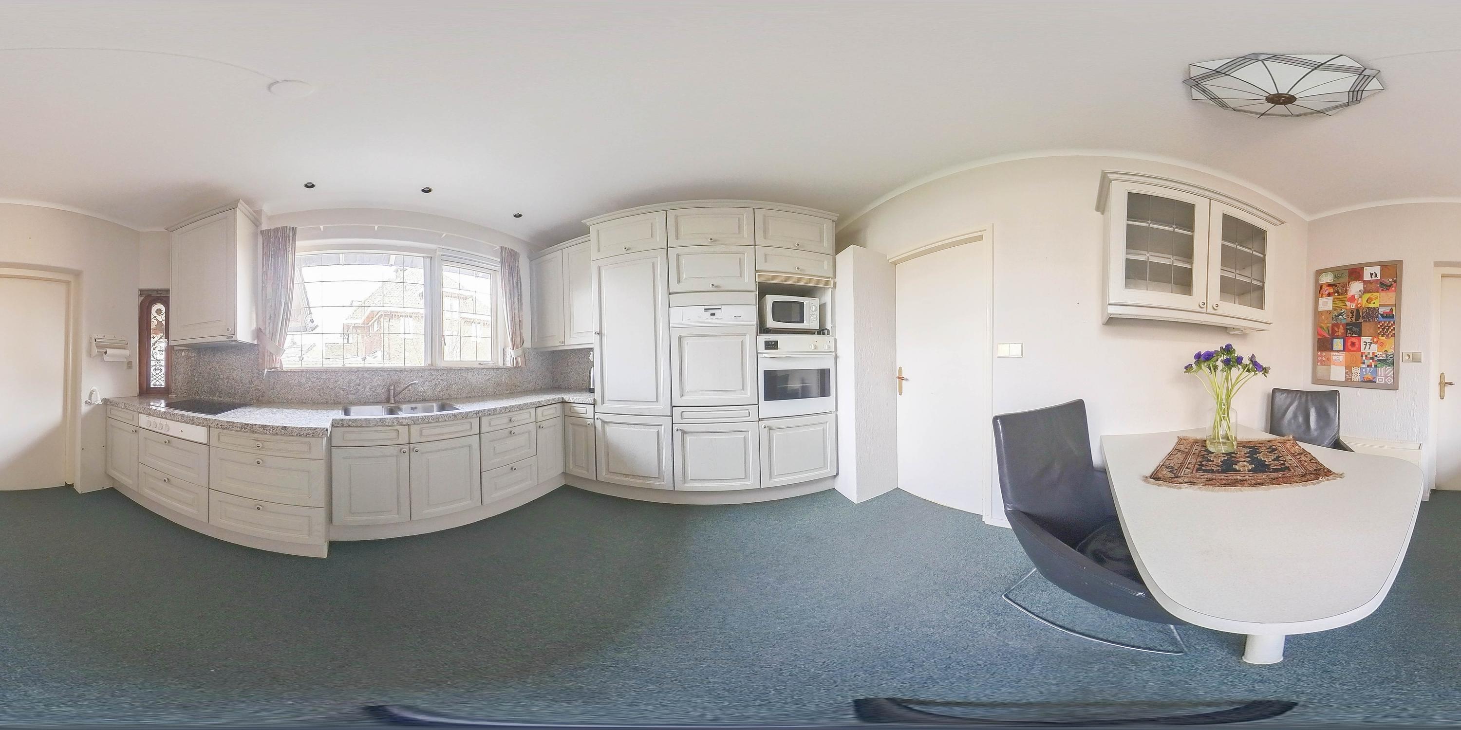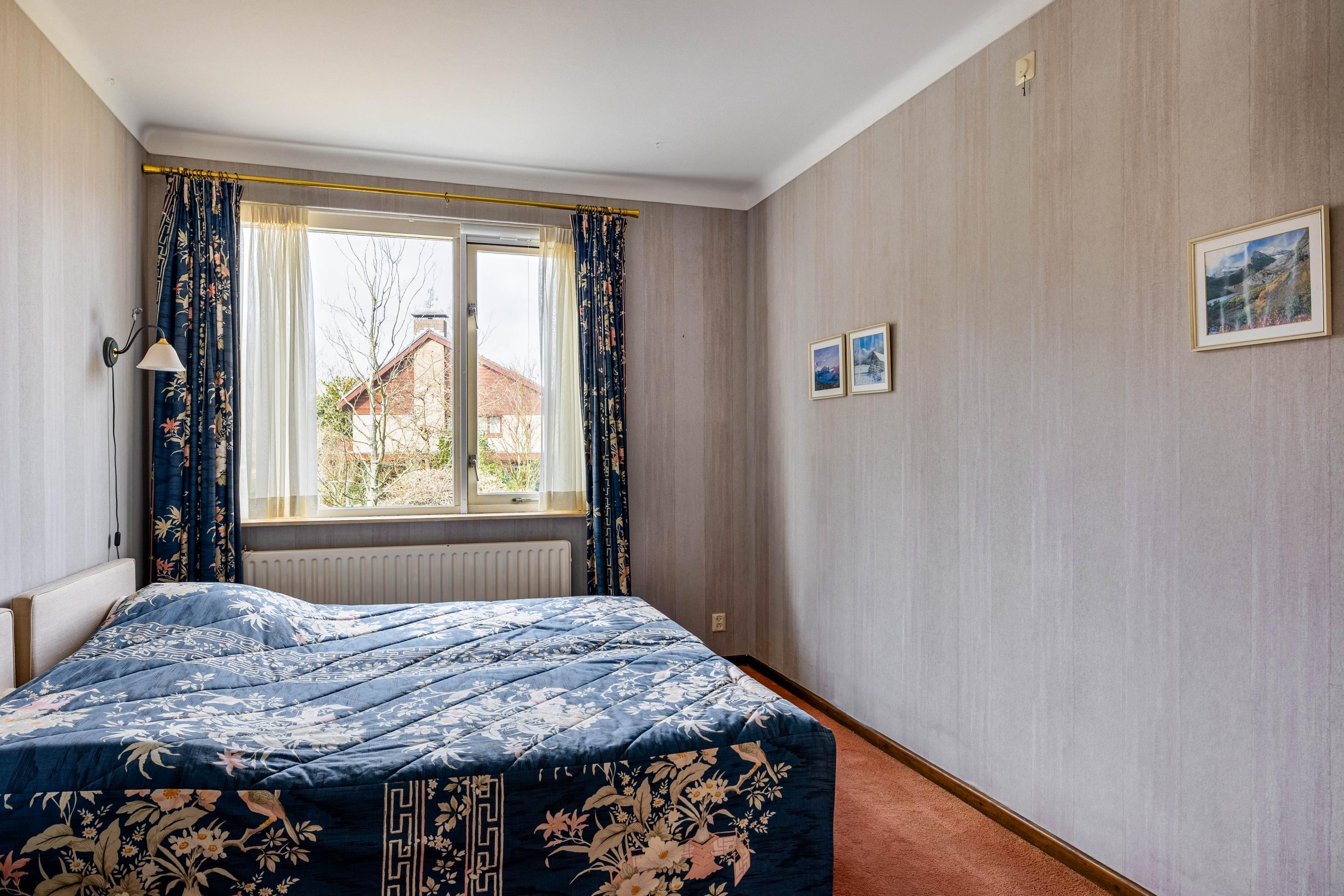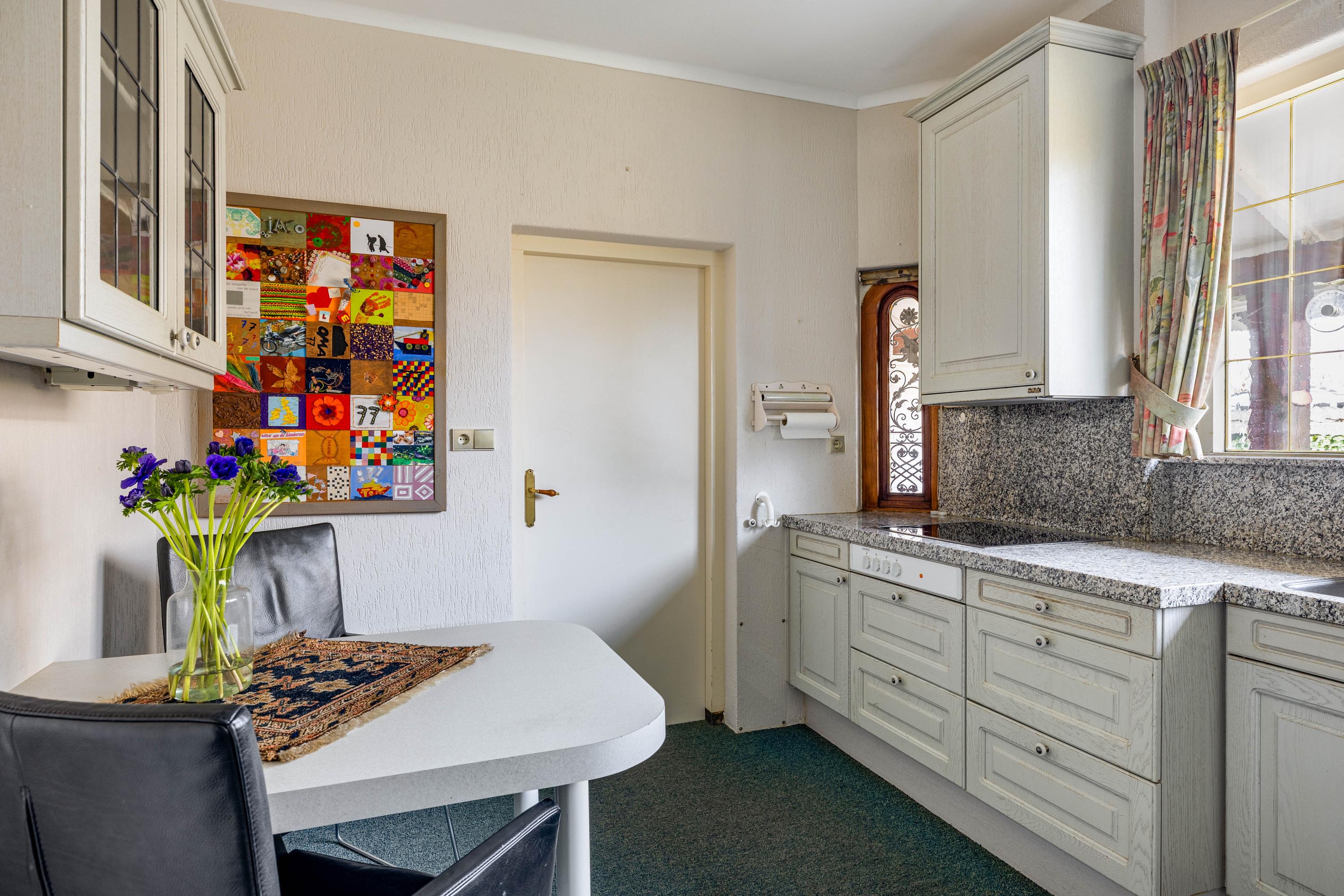 The living room is spacious and stately, featuring a fireplace and a bay window with a large pane of glass. Due to the elevated position of the house, you enjoy views over the park on two sides. Light floods in generously thanks to the large windows on the sunny side. Adjacent is the dining room, with a door to the terrace and to the kitchen. The enclosed kitchen is laid out in an L-shape and features built-in appliances and fixed cupboard space.