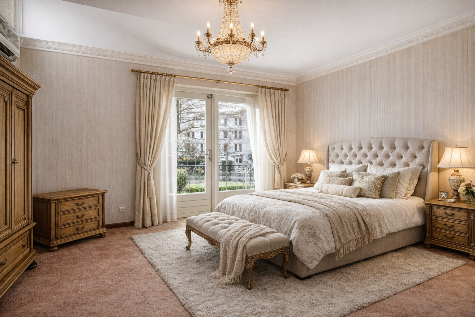 A small change in level leads to the sleeping area. The principal bedroom features air conditioning, a walk-in wardrobe and French doors opening onto the balcony. The adjoining bathroom is fully equipped with a bathtub, double washbasin unit, toilet and bidet. The second bedroom on this floor has a fitted wardrobe wall and its own washbasin.