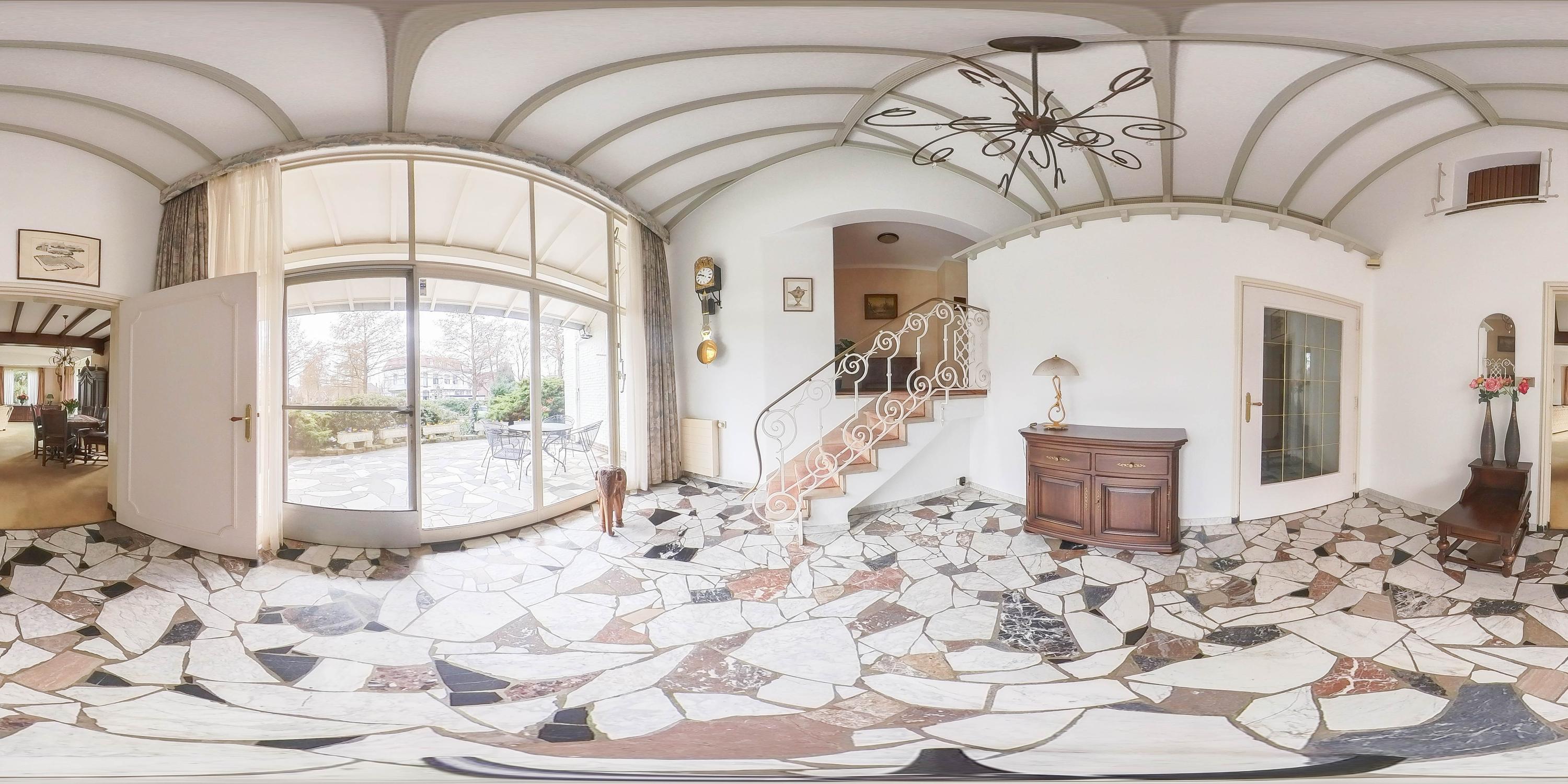 The entrance is impressive. The high hall with its large south-facing glass façade forms the connecting element between the living and sleeping areas and provides access to the adjoining terrace, where the marble mosaic floor continues seamlessly from the hall to the outside. Here, indoors and outdoors literally merge into one another.