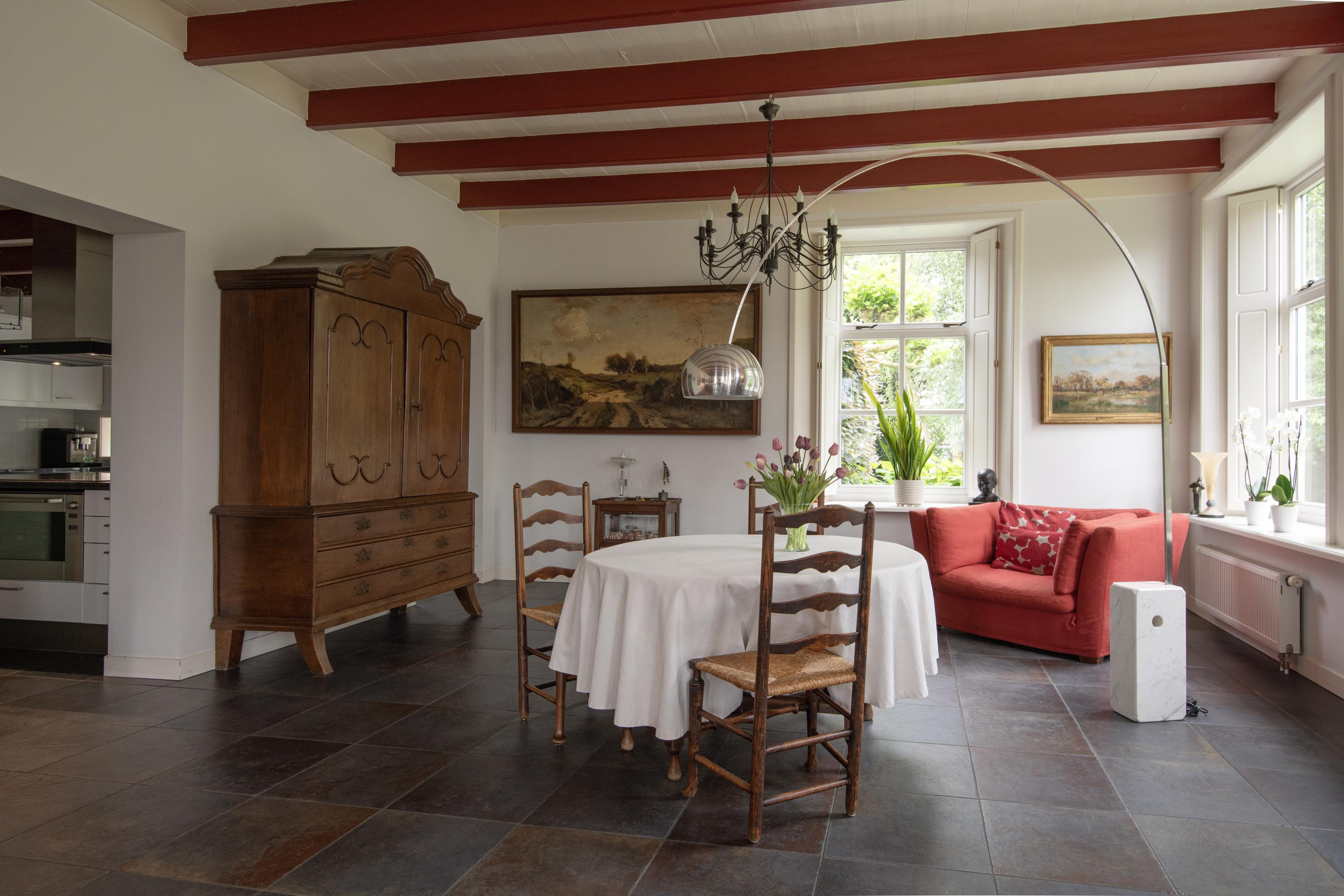 The original front door is located centrally in the front house but it is no longer used. The daily entrance is on the driveway side. The entrance is spacious and furnished with closets and a toilet. From the adjacent hallway is access to the living room. This sunny room with many skirted windows, flanked by interior shutters, breathes -with the almost three-meter high beamed ceiling- a pleasant atmosphere. In addition to the luxurious ceramic floor with underfloor heating, there is a natural stone fireplace with an open gas fire. In the living room are two passages that offer a view of the adjacent dining kitchen. This space offers access to the south-facing terrace through double French doors. Three mature Plane trees act as natural umbrellas there in the summer.