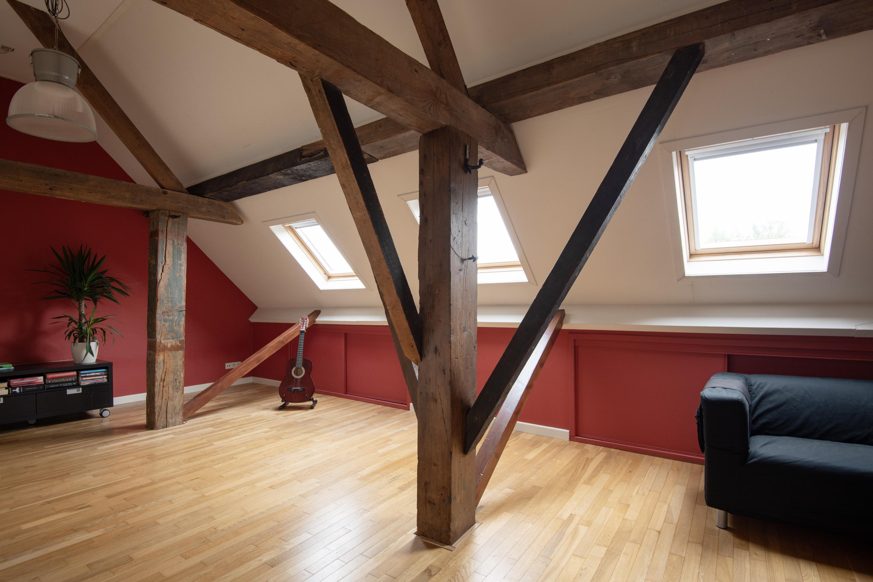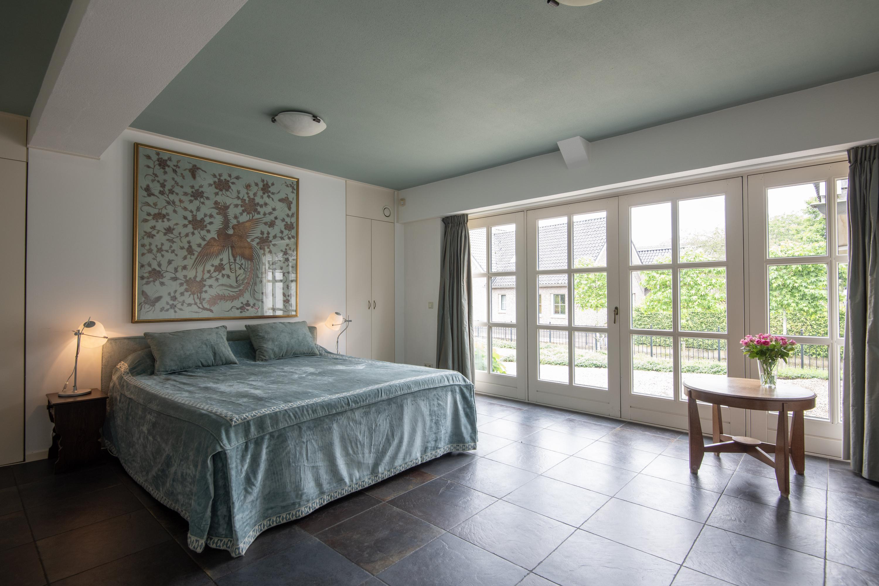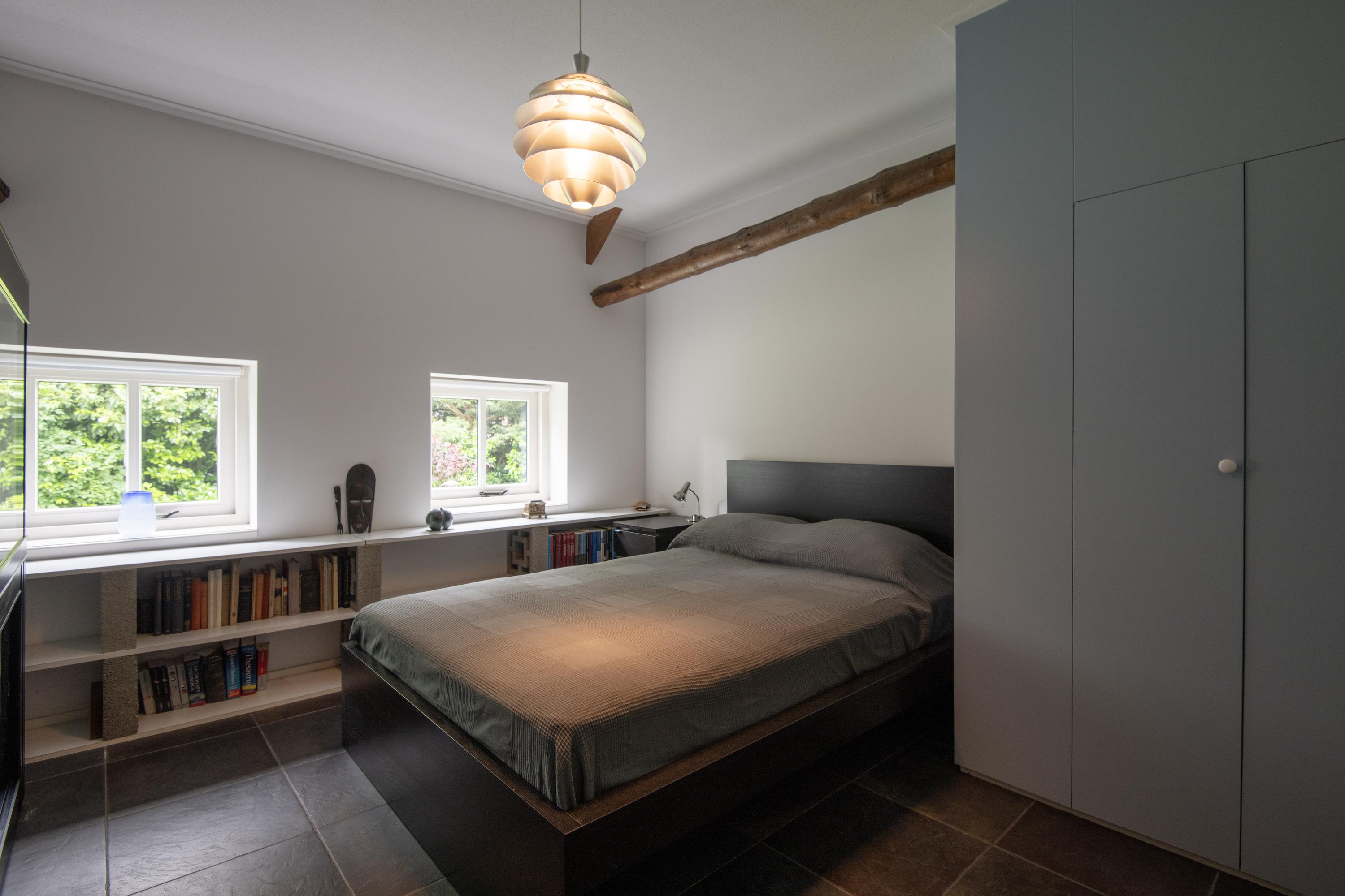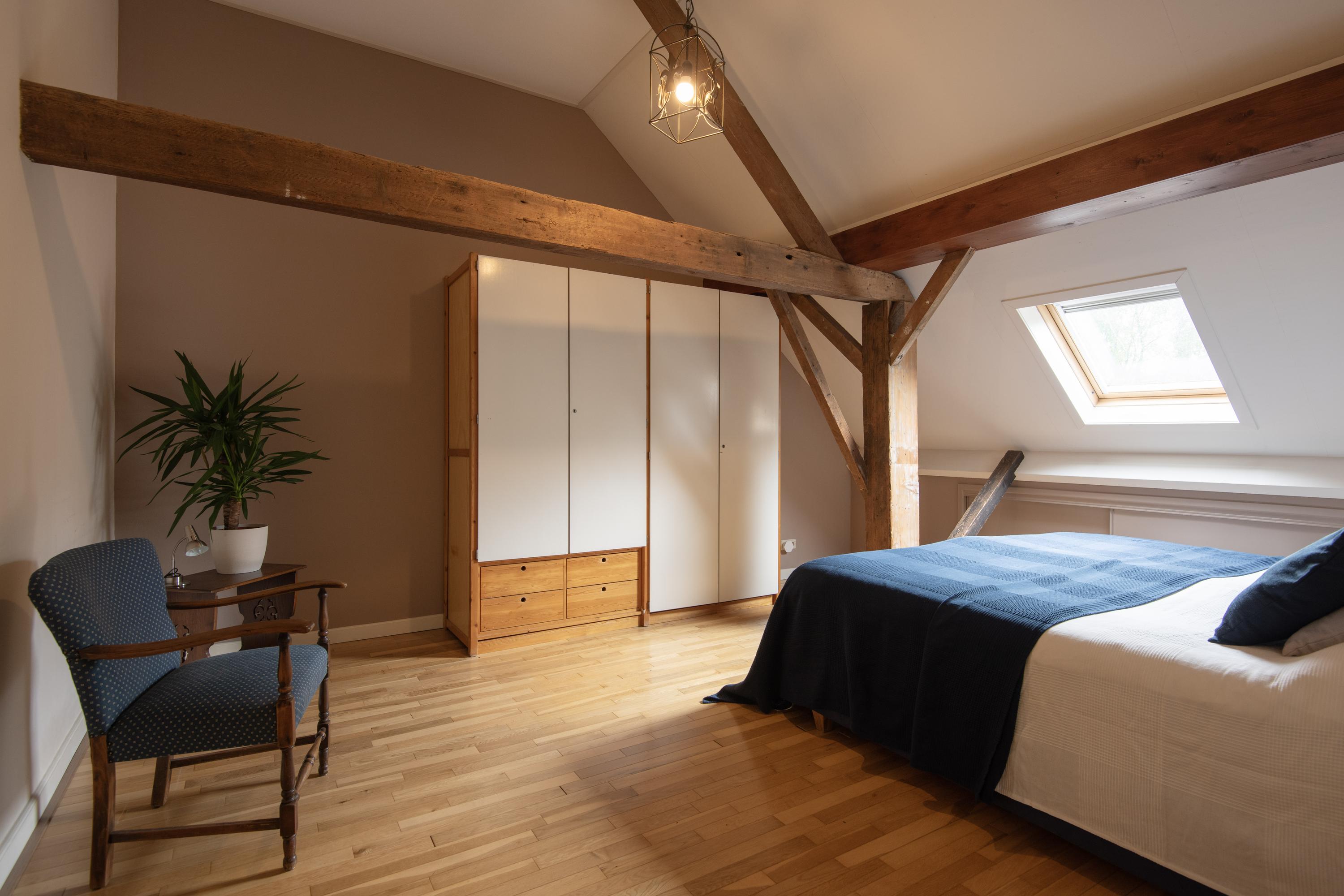 From the central corridor in the back house a staircase leads to the first floor. Under the insulated roof are two more beautiful bedrooms. Through three skylights there is a view of the garden and surroundings. Both rooms are wonderfully bright and have plenty of storage space.