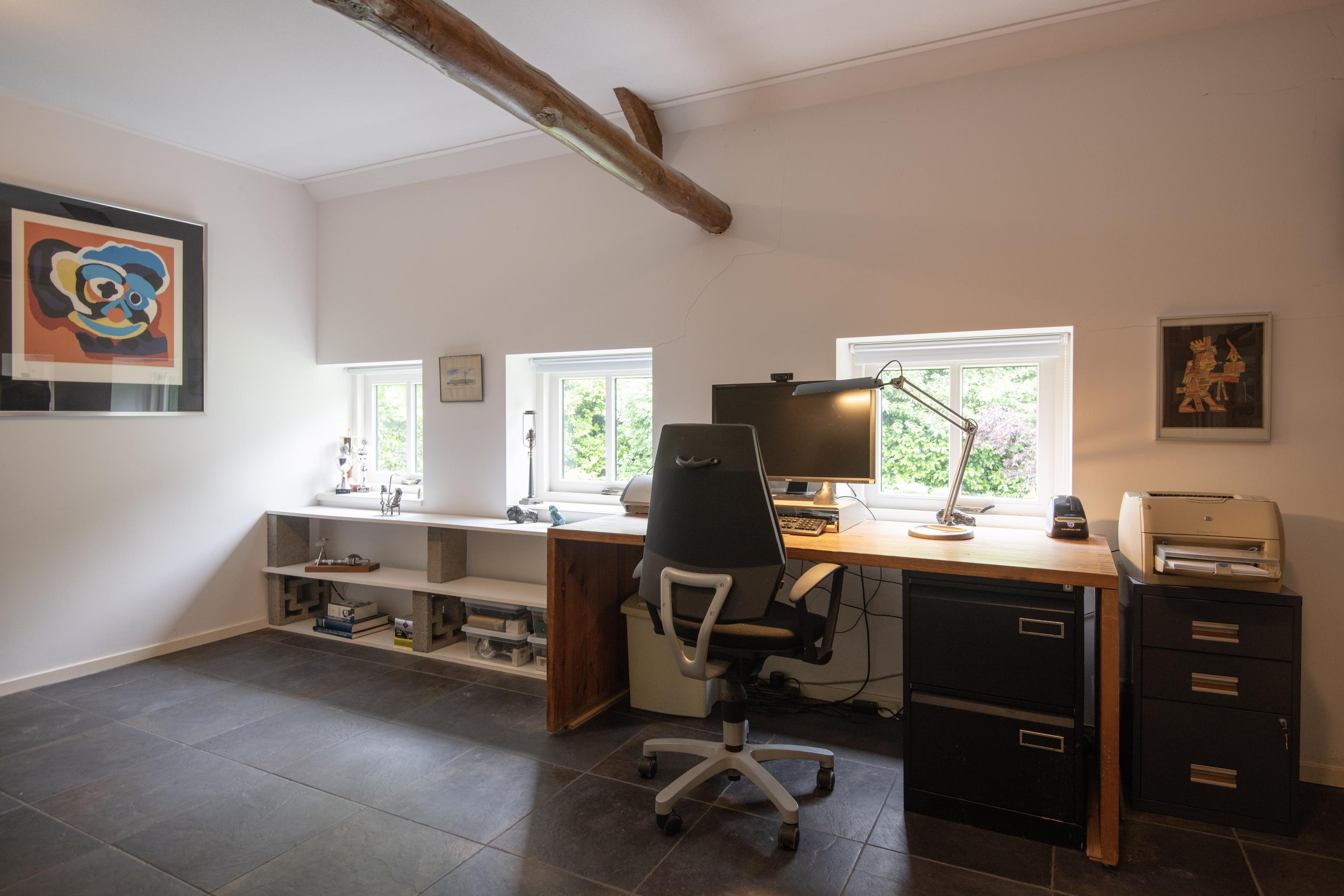 Hall, impressive garden-oriented living room, dining kitchen, bedroom with adjoining bathroom, two work/bedrooms, a 2nd bathroom, utility room and second hallway with access to the terrace under the Gelderland overhang on the first floor.