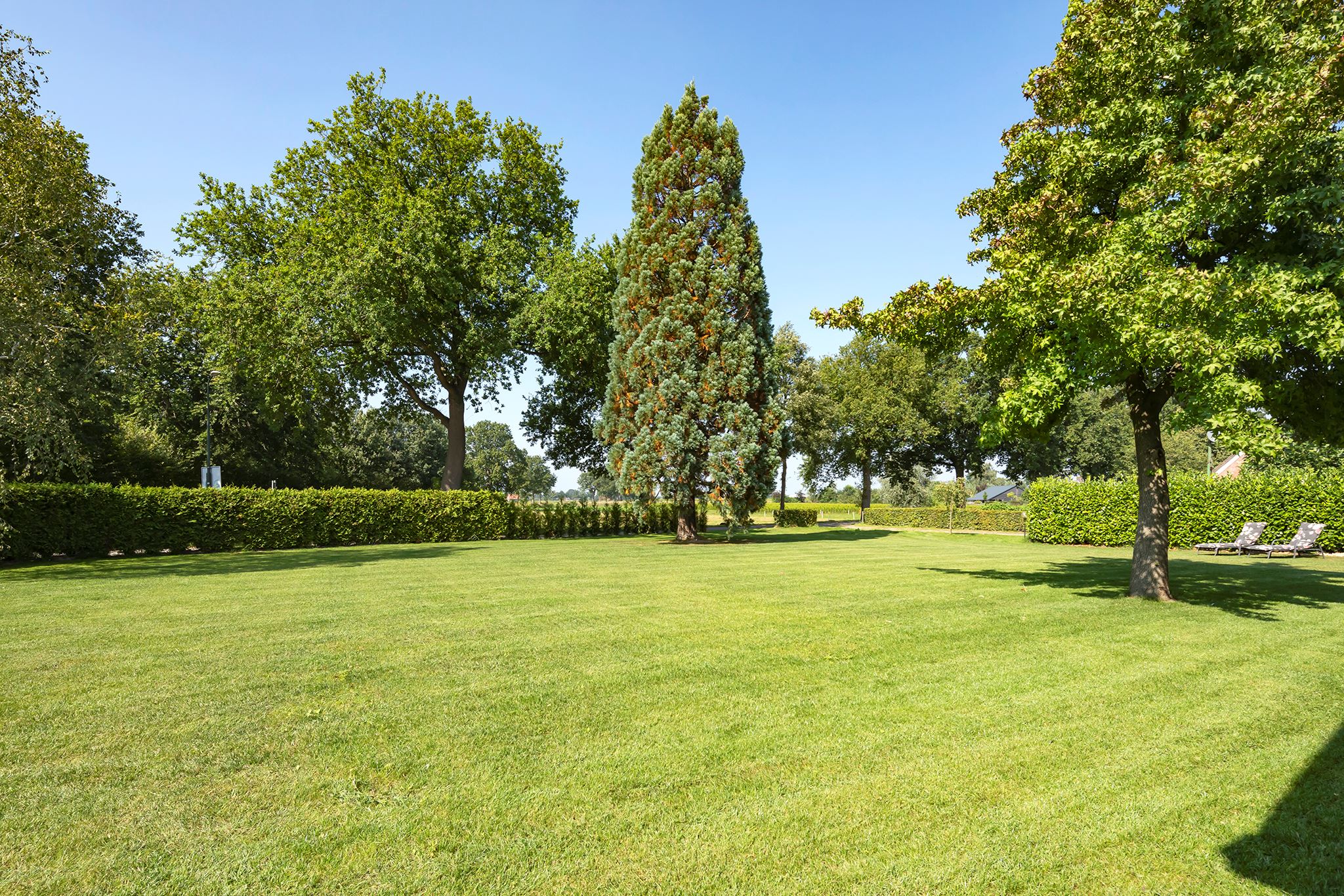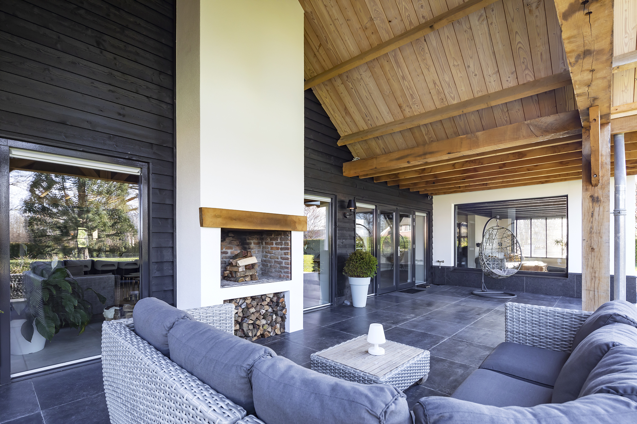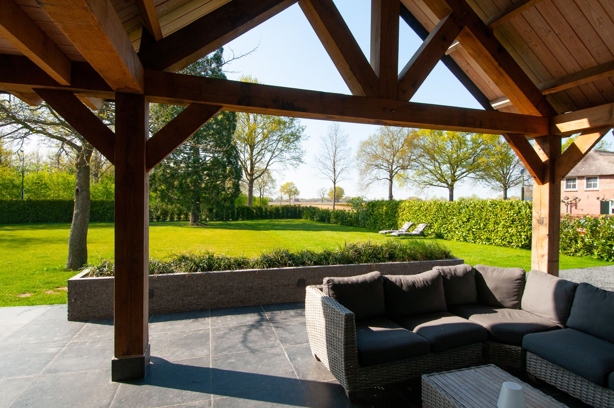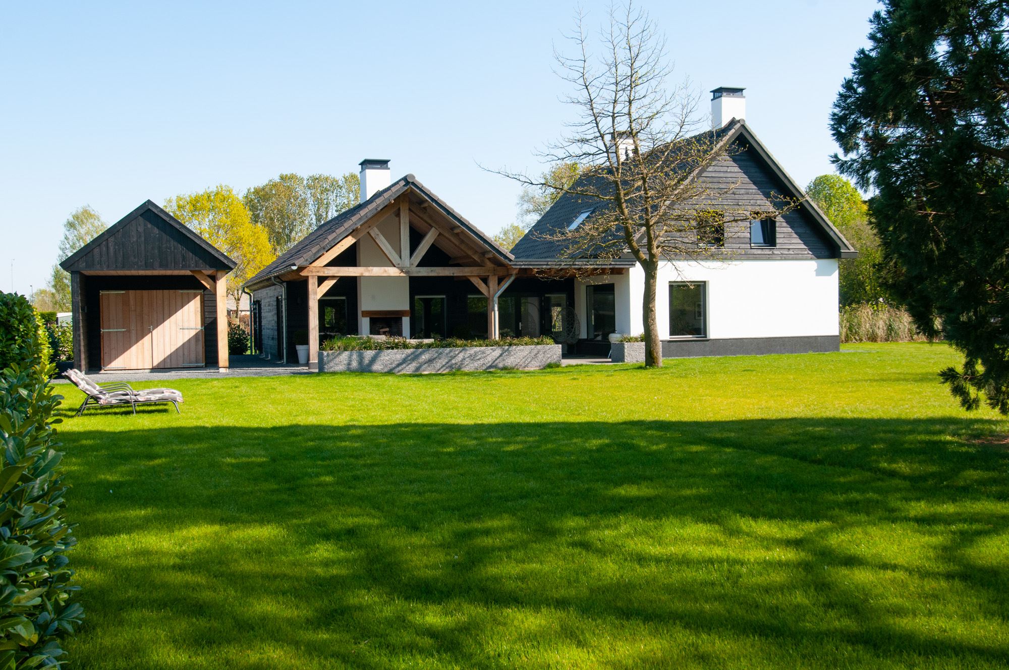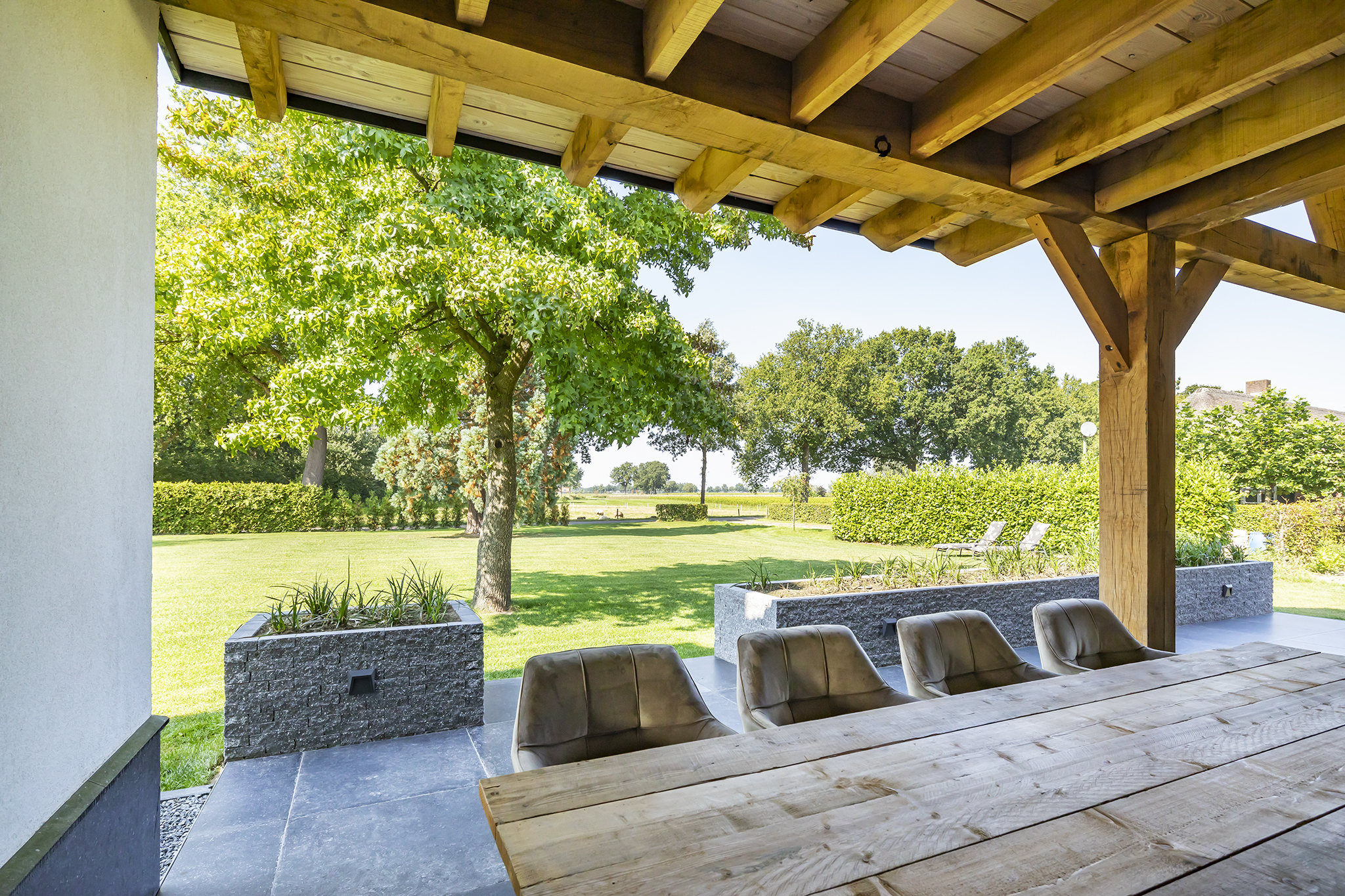 The surrounding garden with various mature trees and is neatly maintained, has a large lawn and a spacious covered terrace. This canopy made of Douglas fir and oak wood is a true eye-catcher! You can sit here with your family, friends or family. There is room for both a large garden table and a lounge set. The outdoor fireplace ensures that you are always comfortable here, even when it gets a little chilly outside.