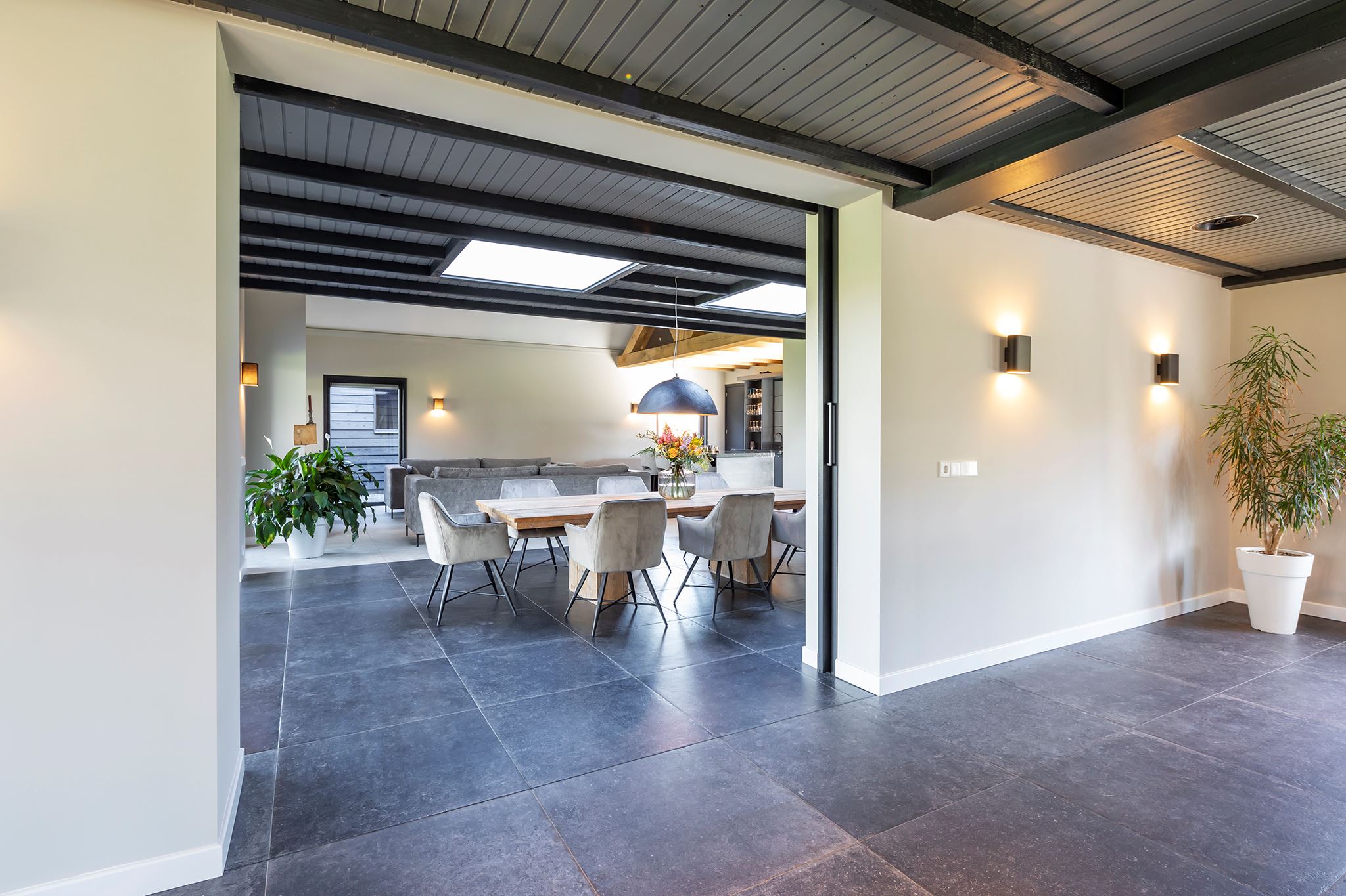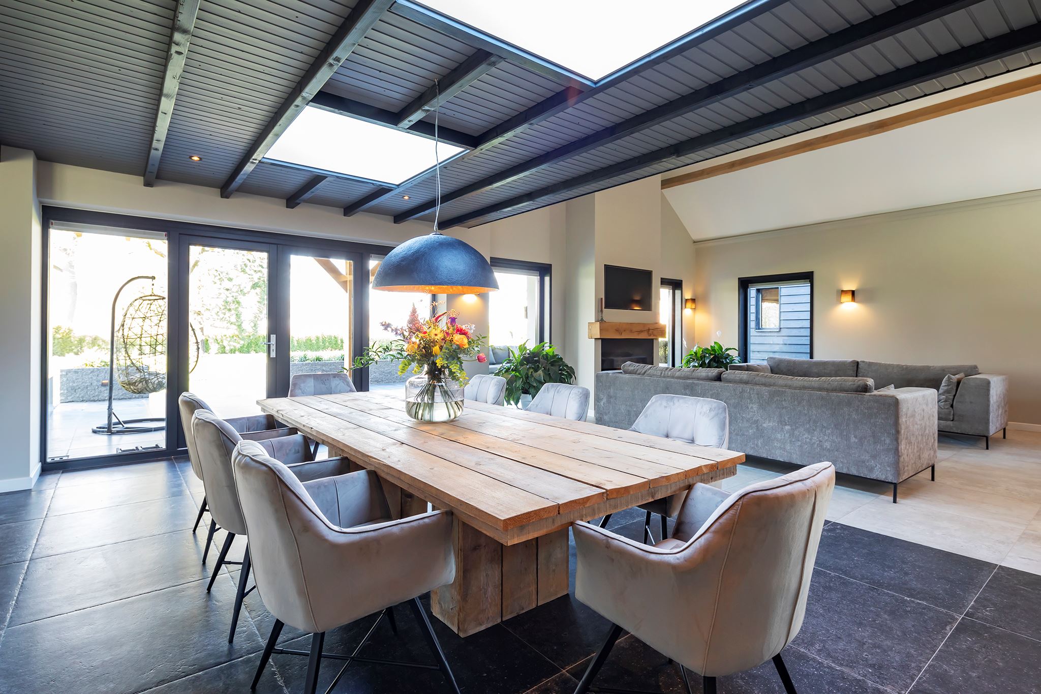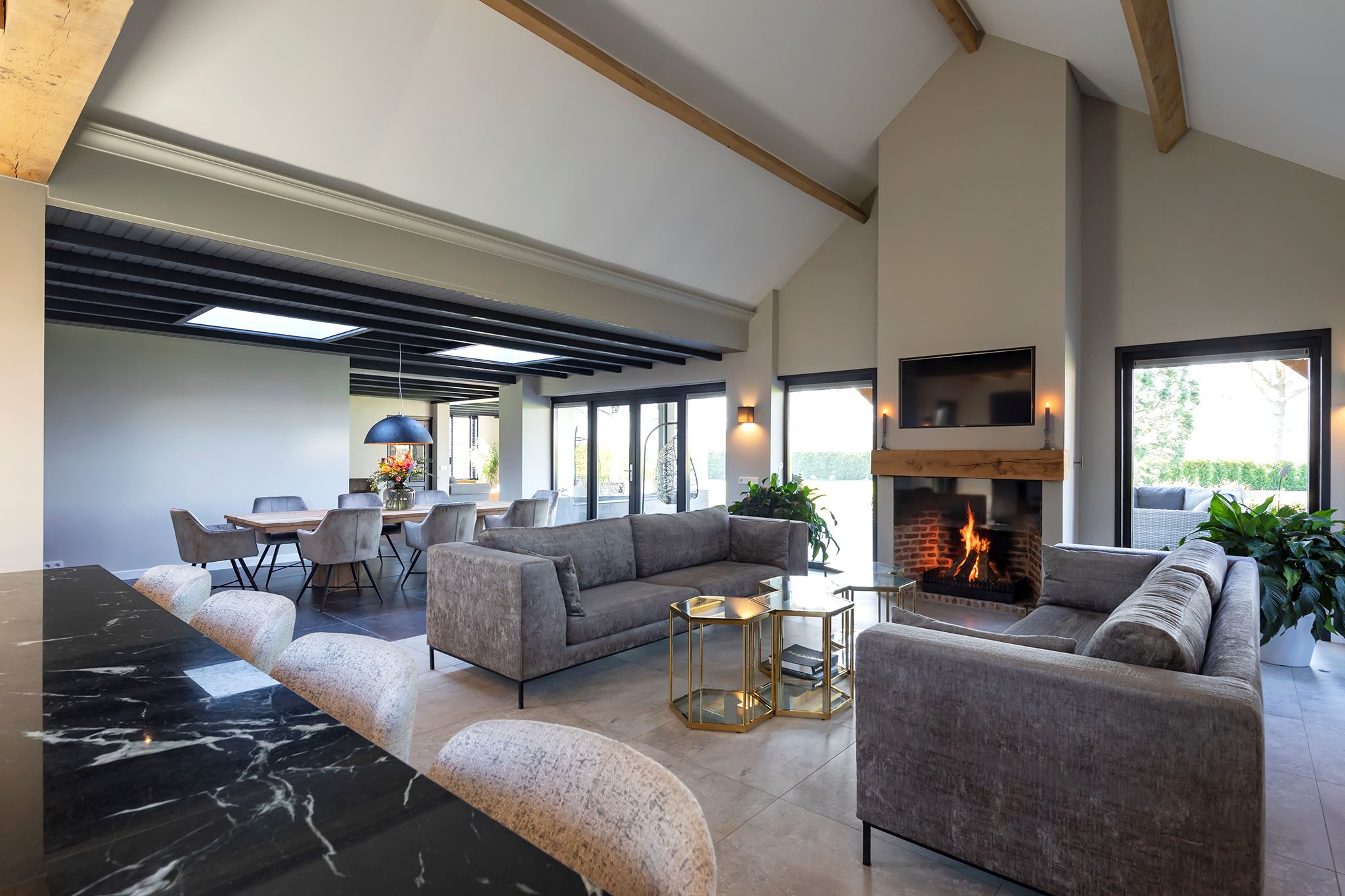 The living room has several attractive areas where you can sit. The fireplace provides even more atmosphere and extra warmth in the house. The entire floor is equipped with underfloor heating. There is room for a large dining table between the living room and the television area.