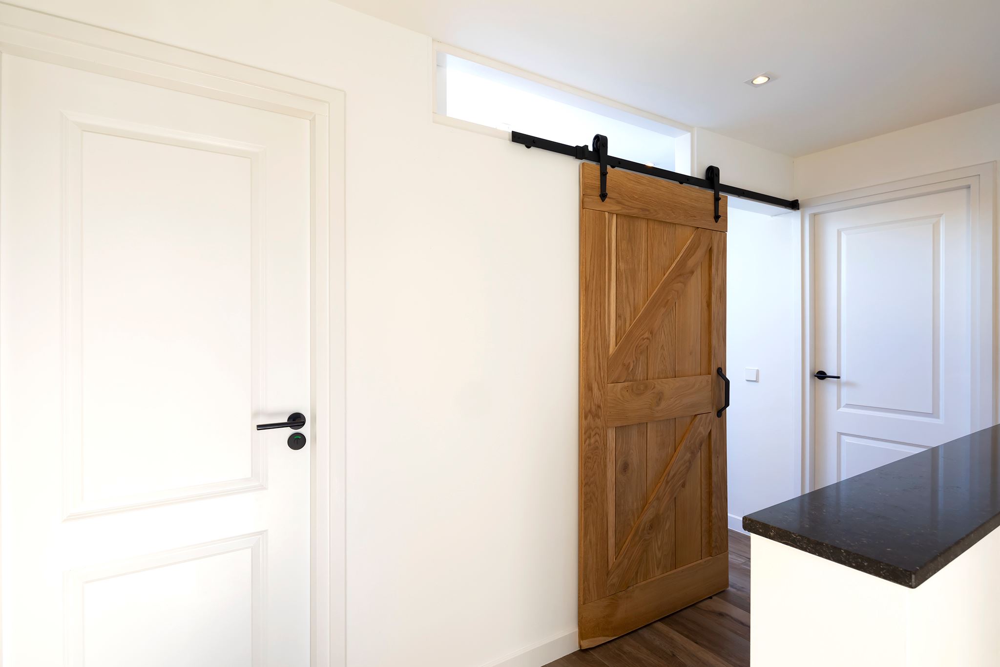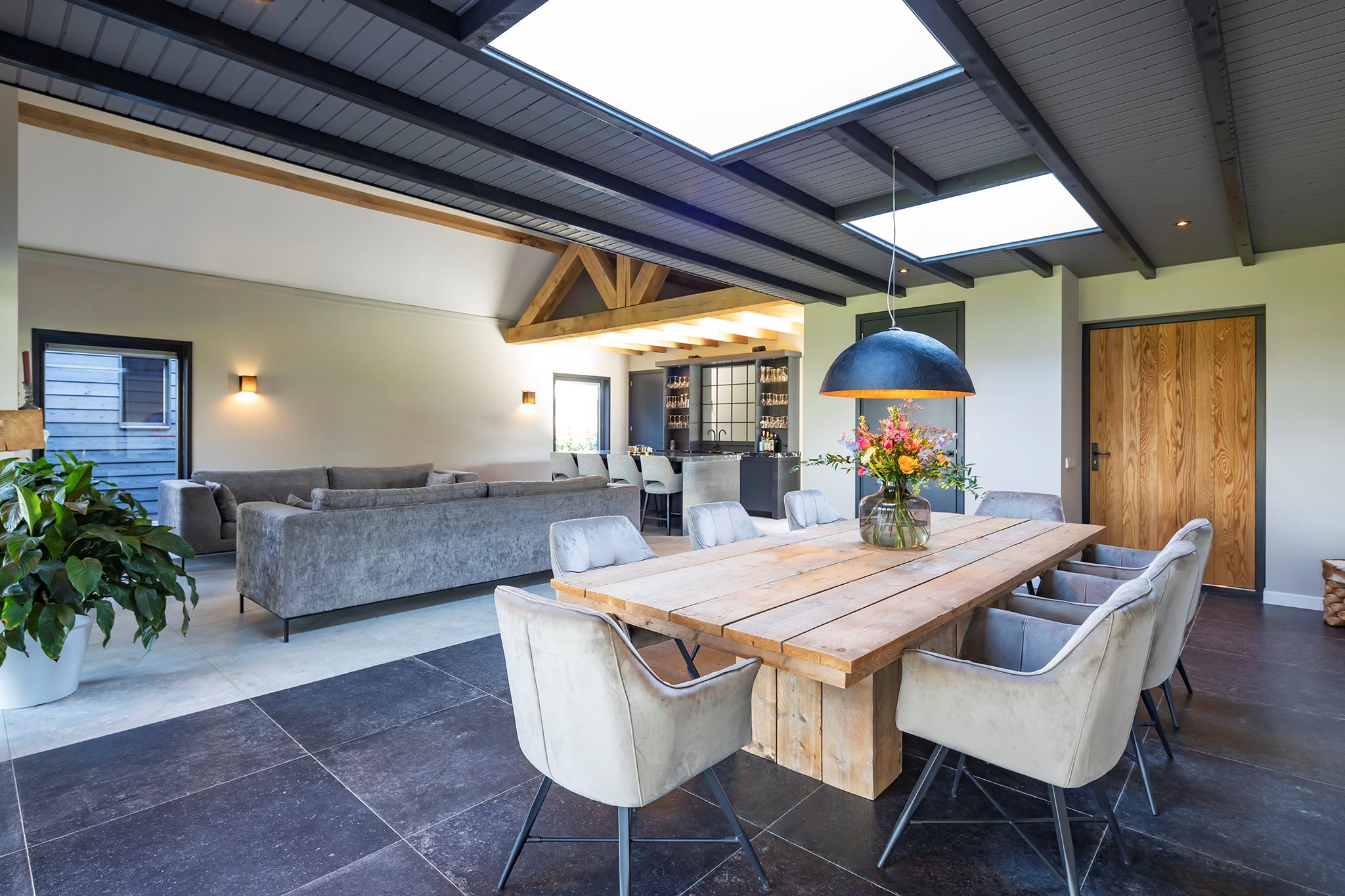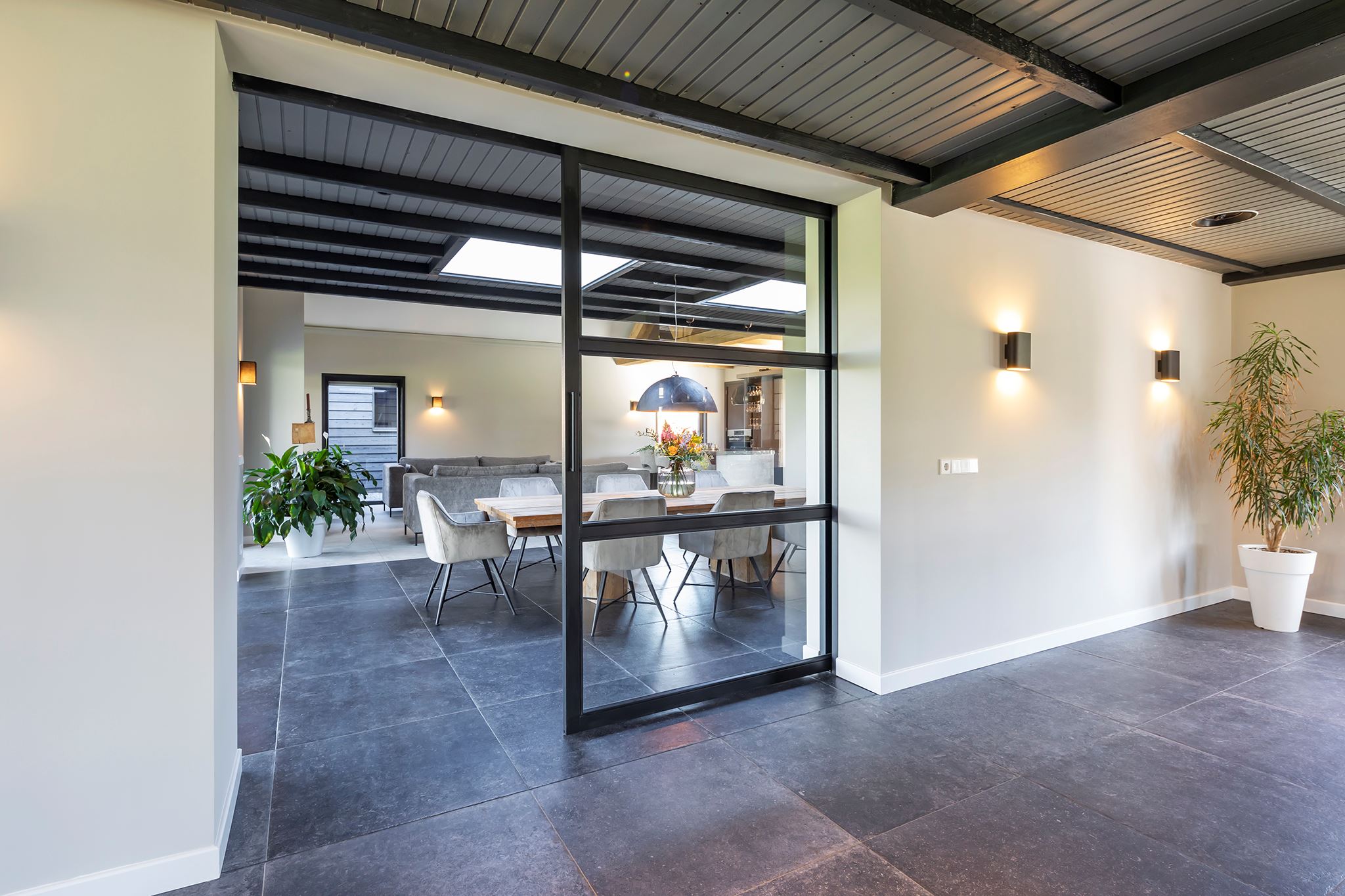 This house looks modern and neat at the front, but behind the front door lies an absolute gem! What a surprising home, you rarely come across one like this. Atmosphere and character, very contemporary, especially due to the special heights, the large windows and the beautiful light everywhere in the house.