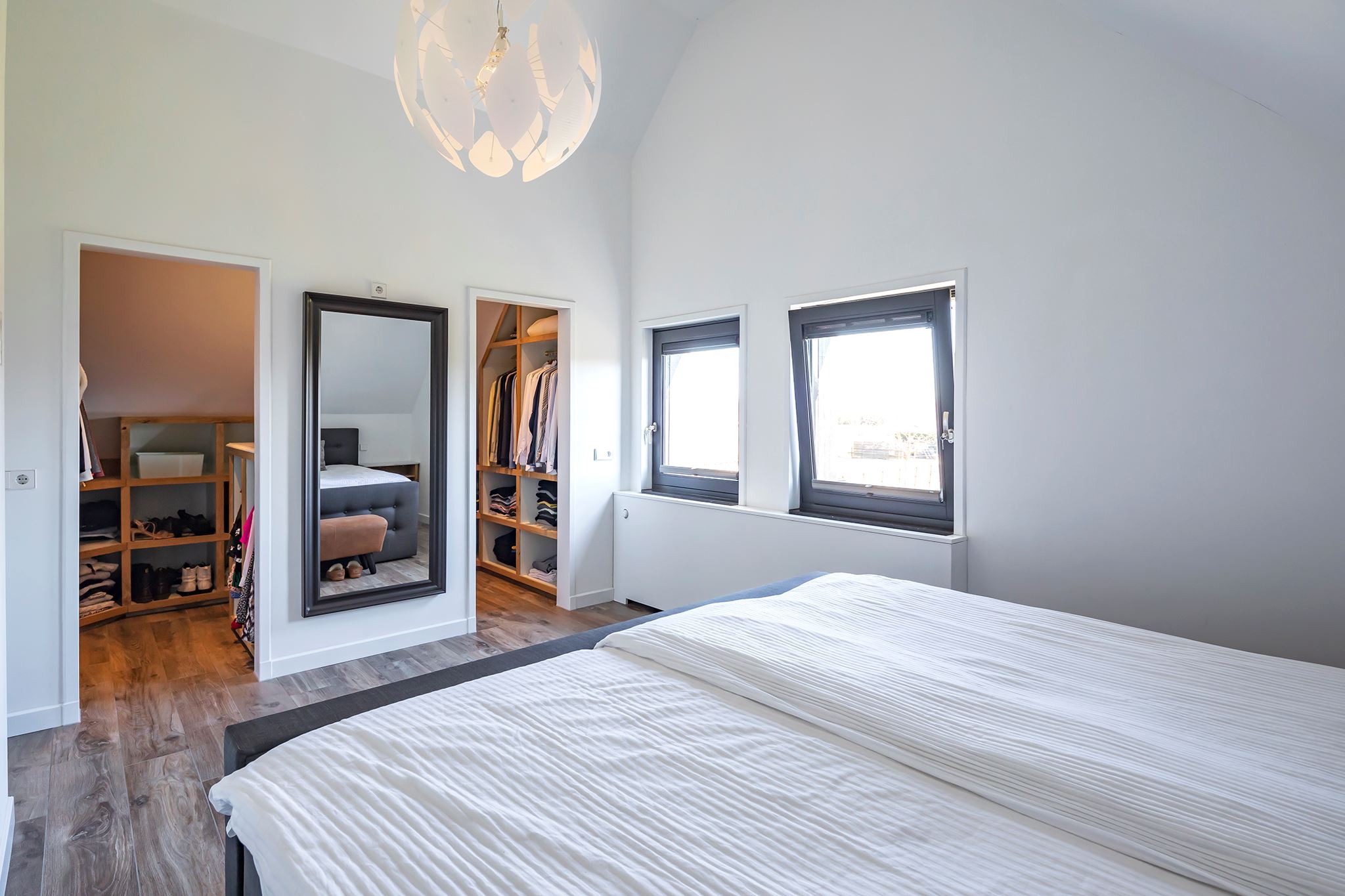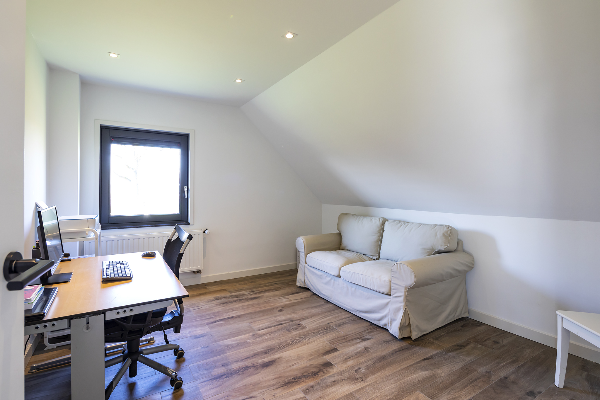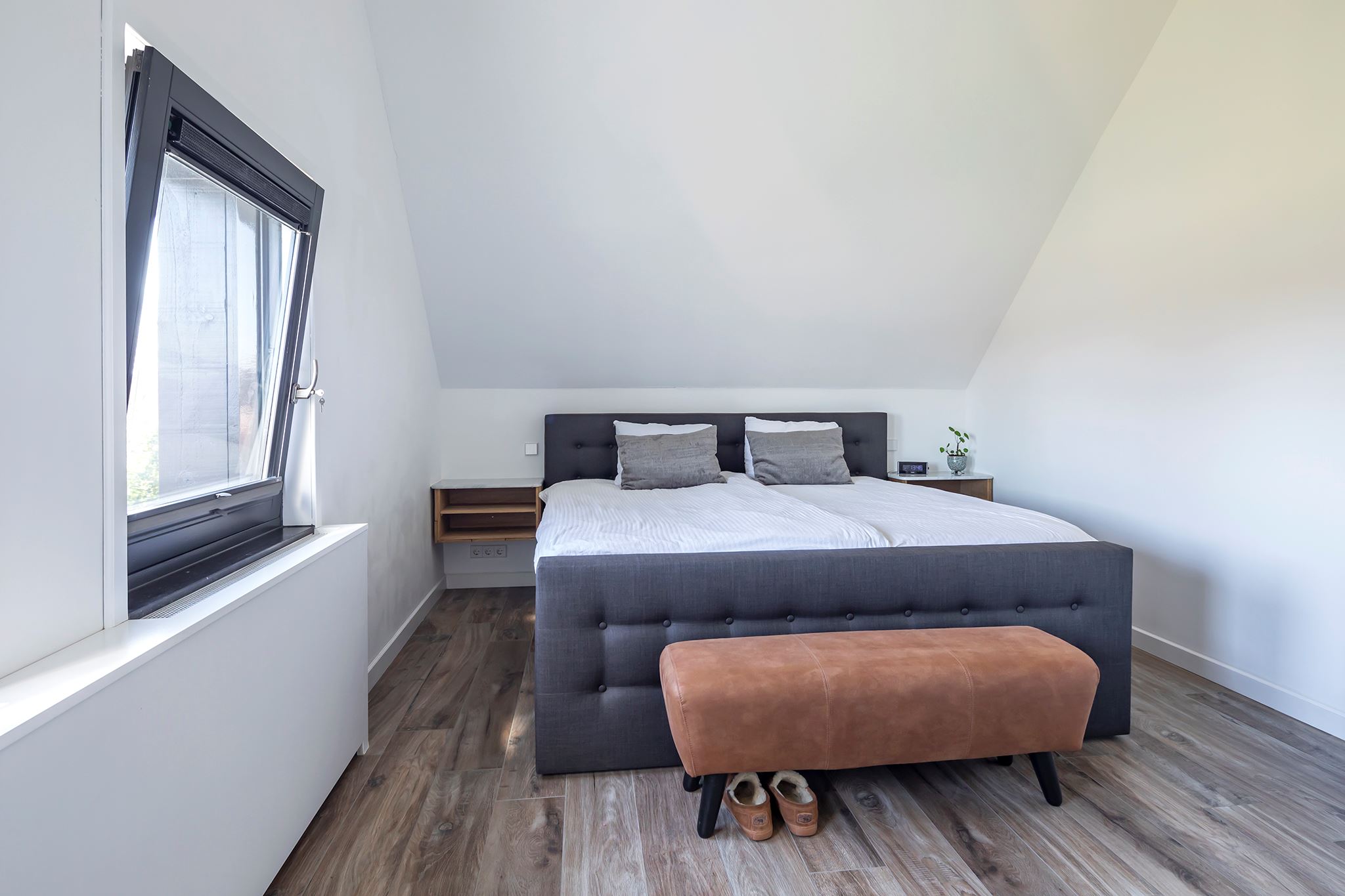 The beautiful bathroom is fully equipped, a corner bath, a walk-in shower with hand and rain shower and a wall unit with double sink. Thanks to the large dormer window, the bathroom has nice natural daylight and you can ventilate the room naturally as well as mechanically. The bathroom floor has underfloor heating. The toilet is located in a separate room on the landing.