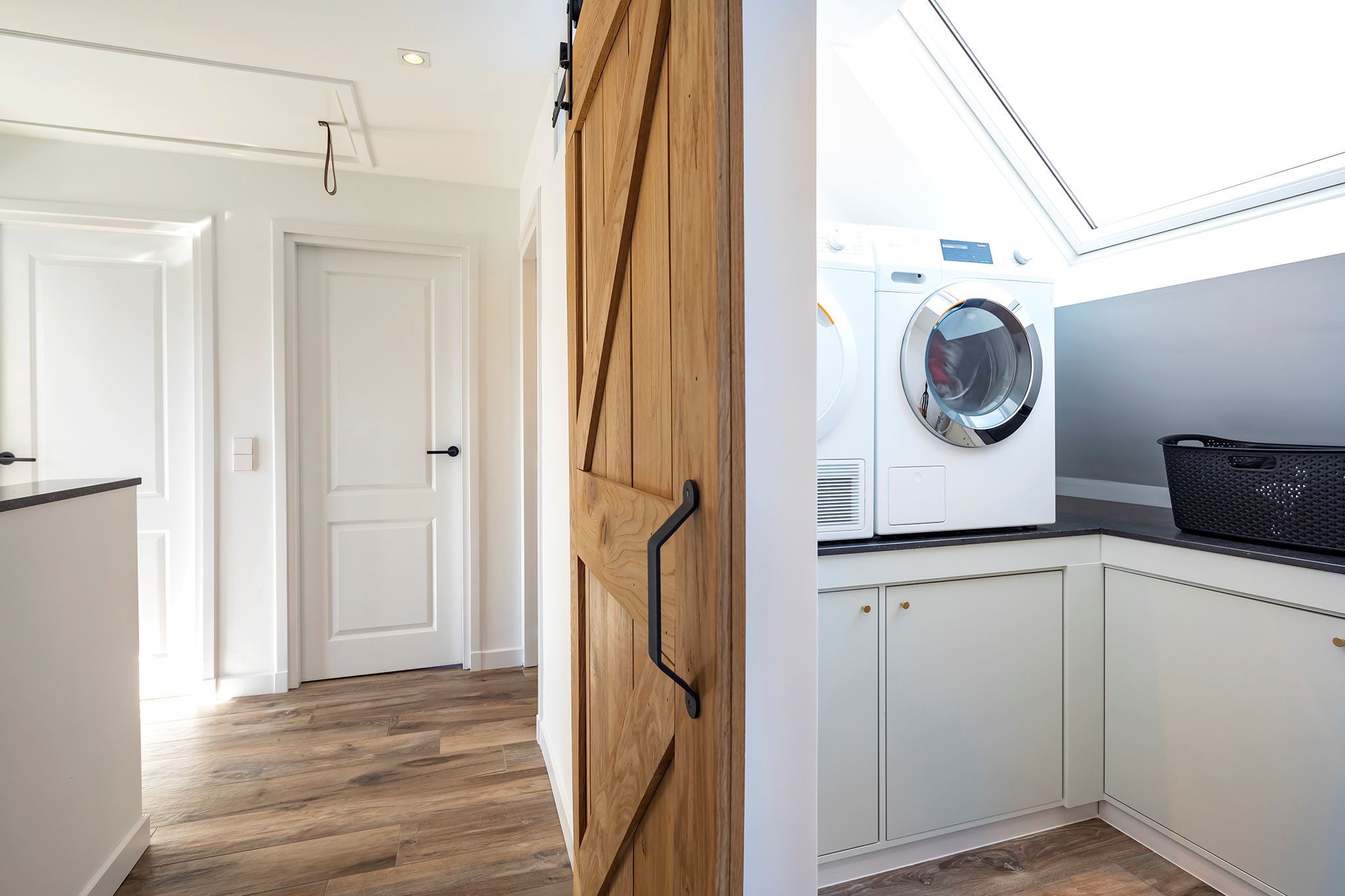 You can place the washing machine and dryer in the designated laundry room. This room has custom-made fitted wardrobes and a large skylight.