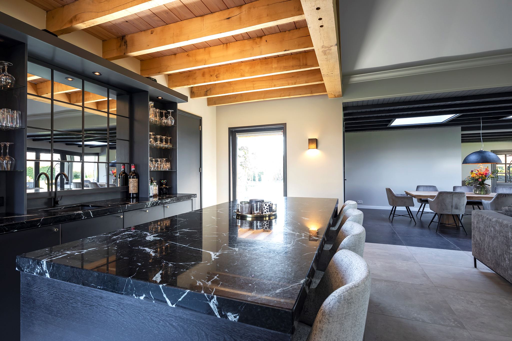 At the front is the luxurious kitchen, spacious, square layout, equipped with a Belgian bluestone countertop, various built-in appliances including a steam oven, dishwasher, fridge/freezer and a large, sturdy 6-burner gas stove with two ovens. At the end there is a cozy bar area.