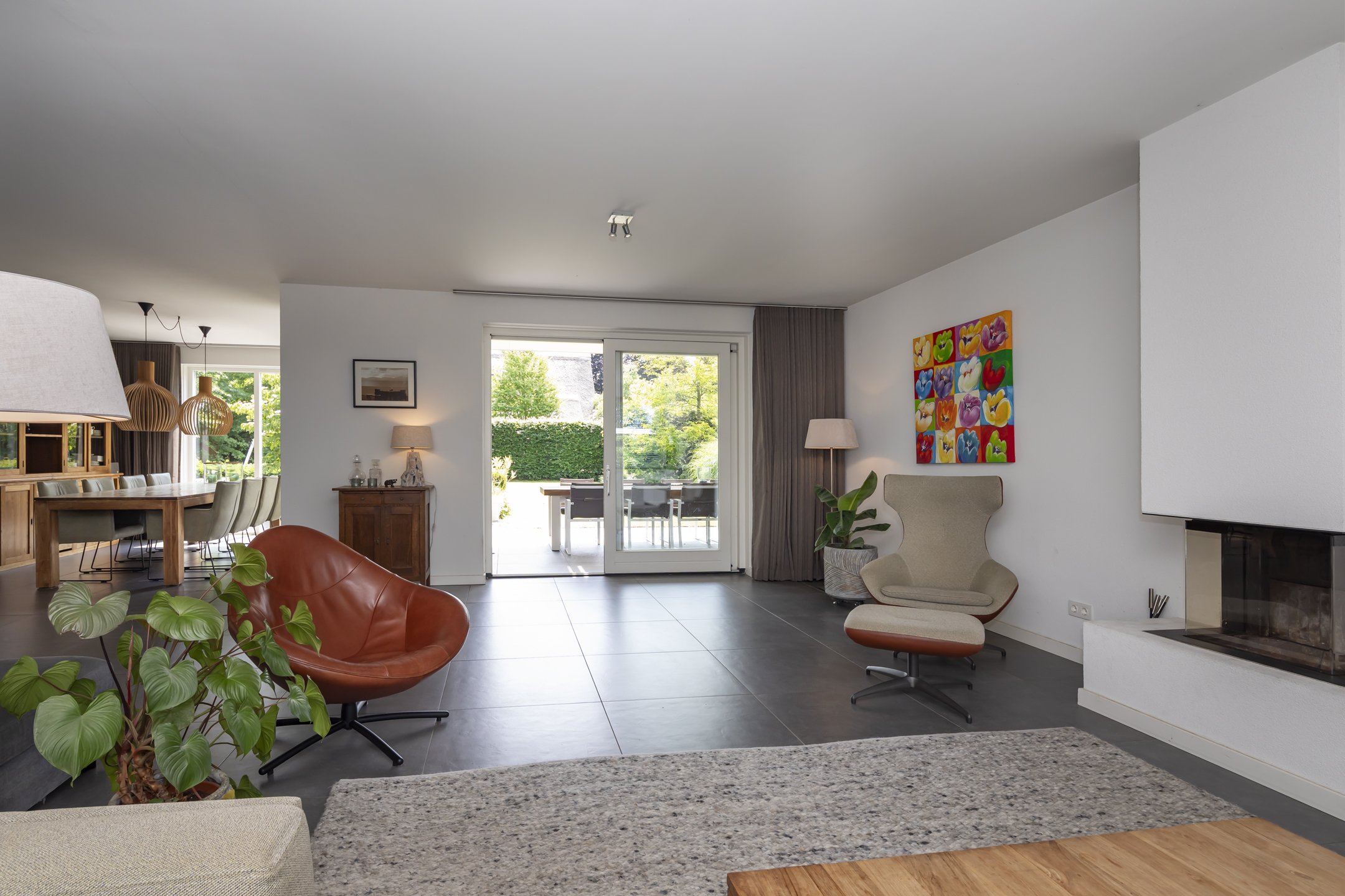 The inviting fireplace is centrally located in the living room. The living room is sunny thanks to the large windows at the front and sliding doors at the rear, which open onto the lovely covered terrace.