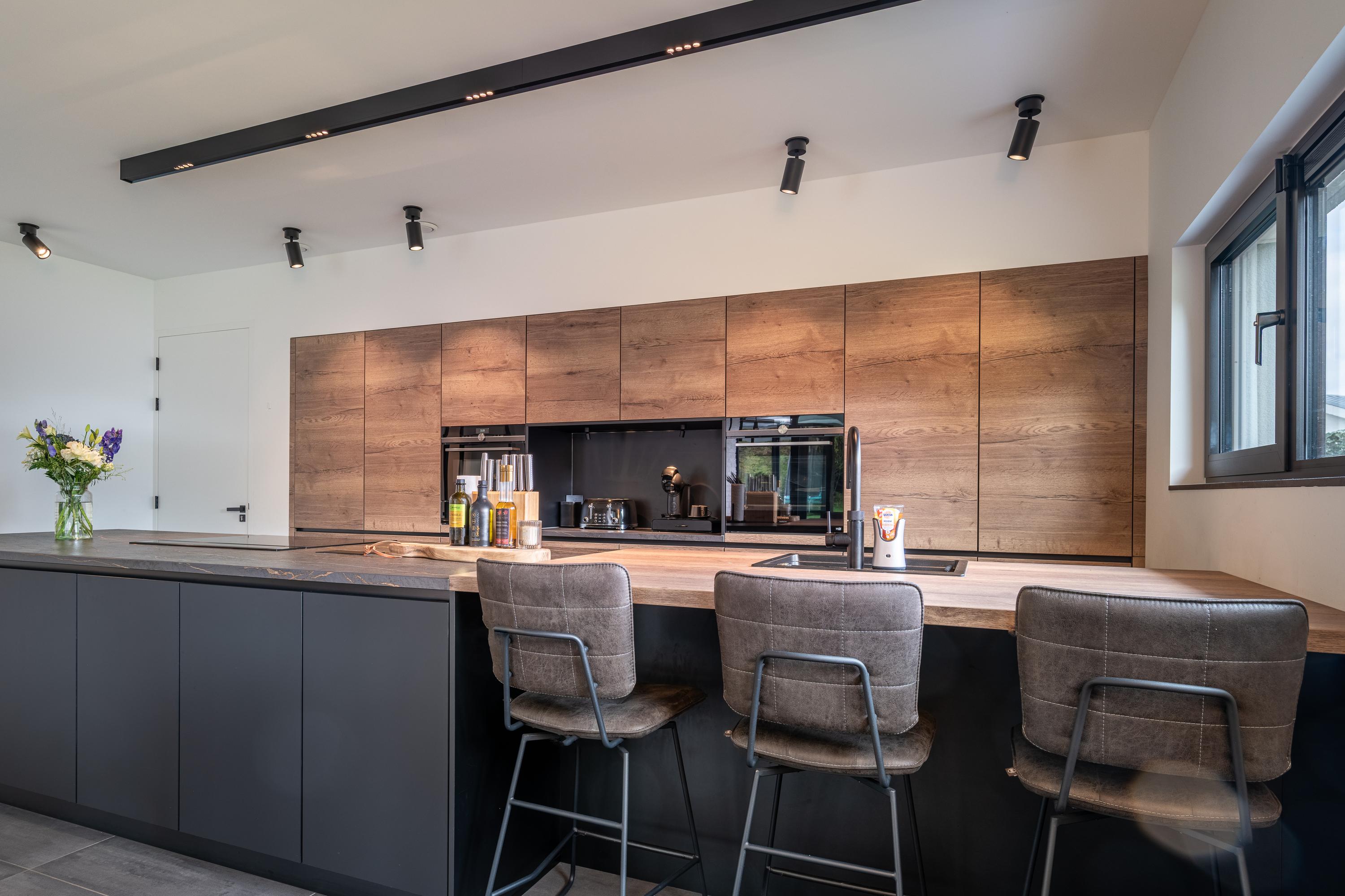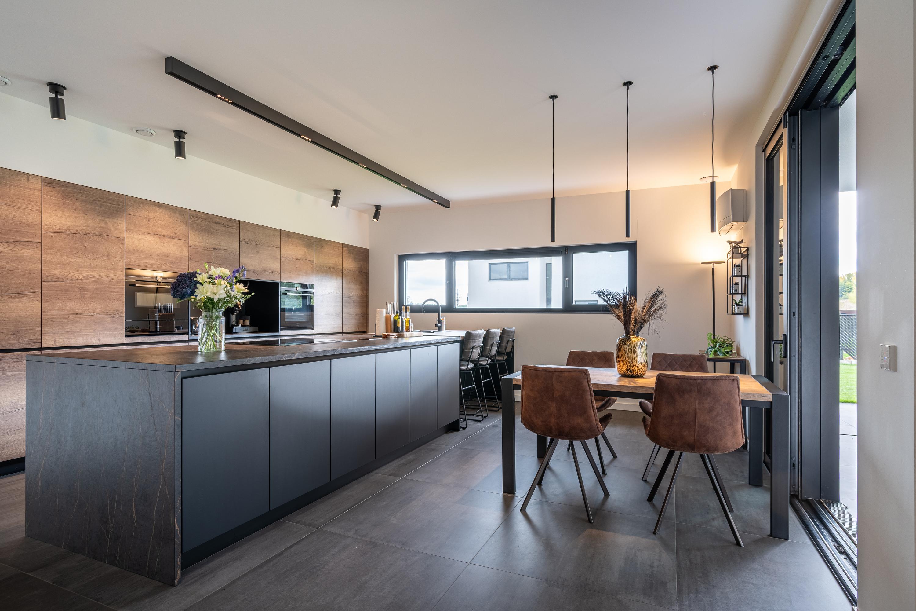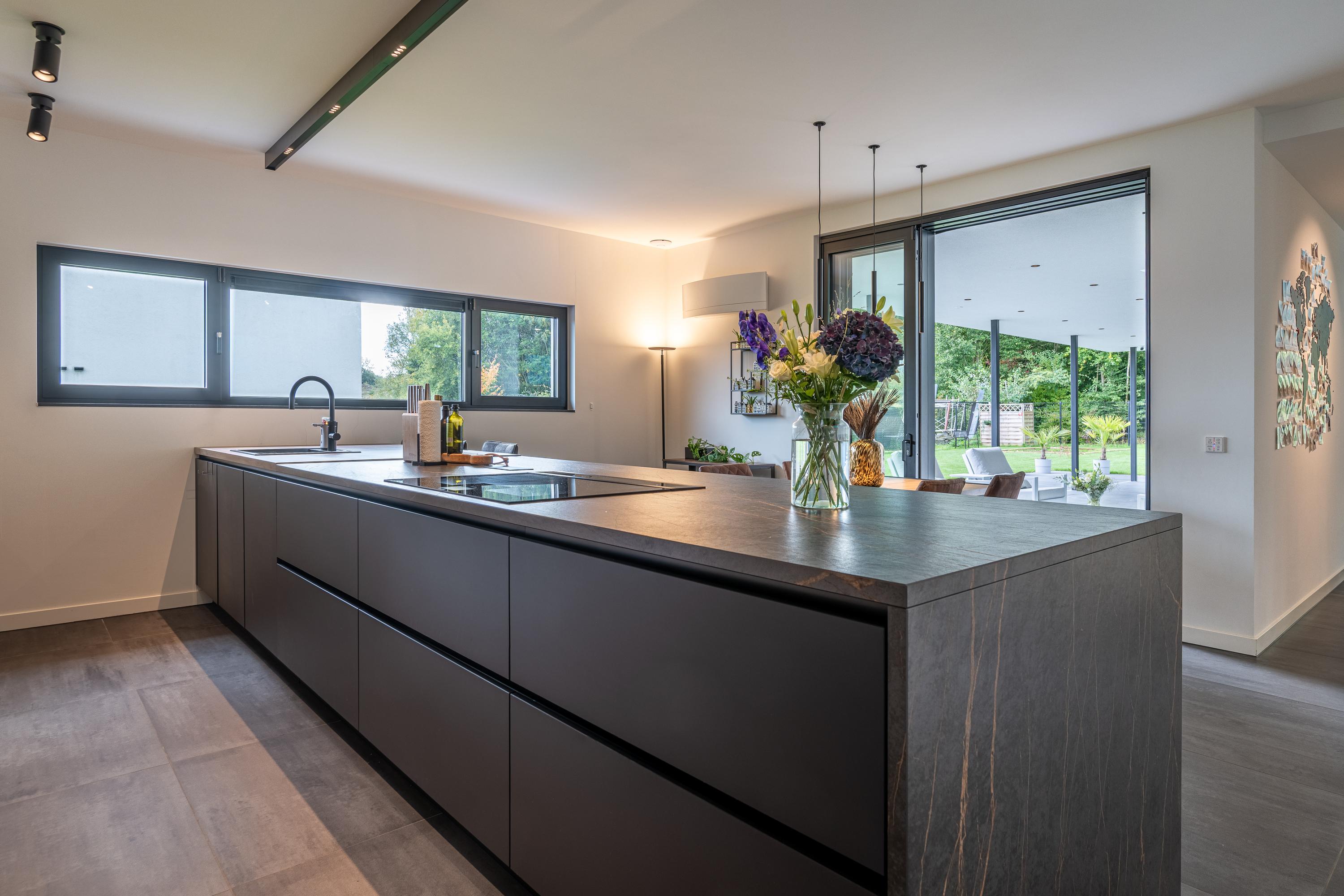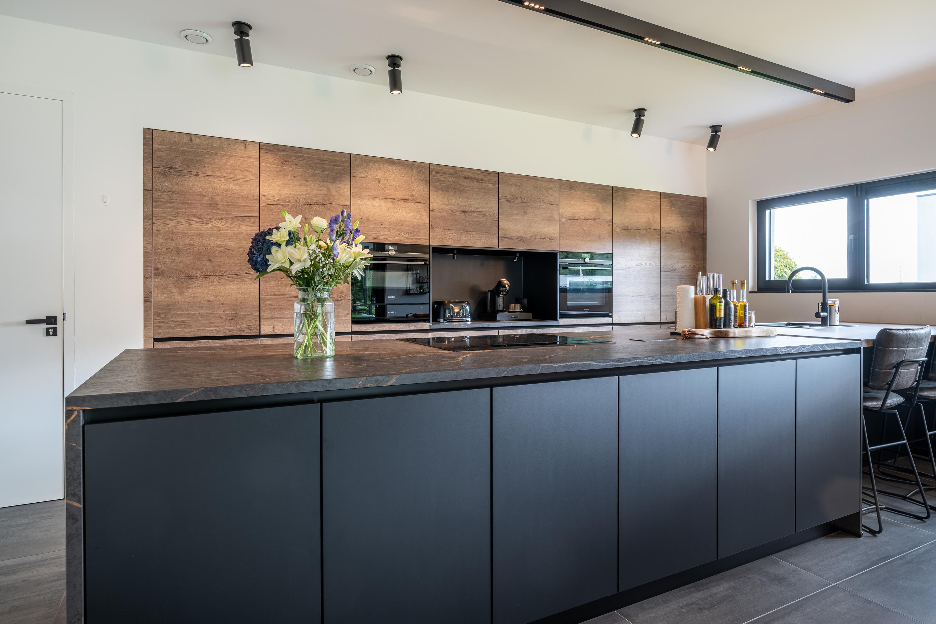 De keuken vormt het hart van deze villa en is een absolute blikvanger. Centraal staat het matzwarte kookeiland, strak vormgegeven en voorzien van een hoogwaardige afwerking. De combinatie van het stoere zwarte eiland en de strakke kastenwand zorgt voor een moderne, luxe sfeer met een tijdloze uitstraling. Achter de greeploze fronten schuilen volop opbergruimte en hoogwaardige inbouwapparatuur van het merk Siemens, waaronder: Quooker 5-in-1, wasbak met geïntegreerde voedselresten vermaler, combi stoomoven, hete luchtoven, koffiebar, inductiekookplaat met geïntegreerd afzuigsysteem, koelkast, vaatwasser en warmhoudlades.