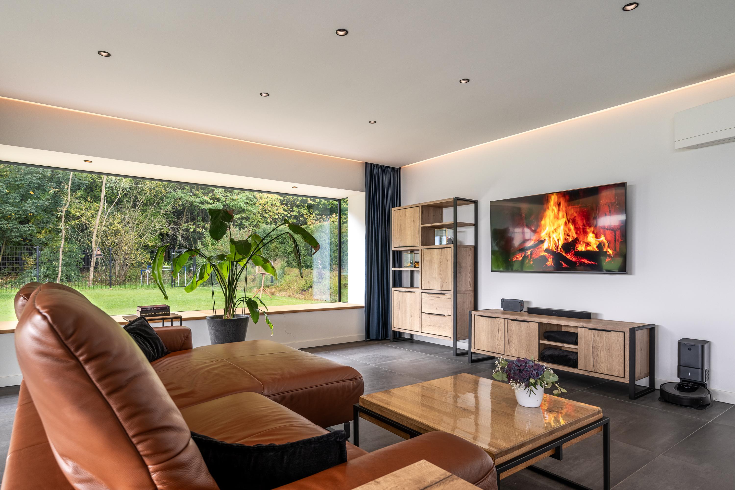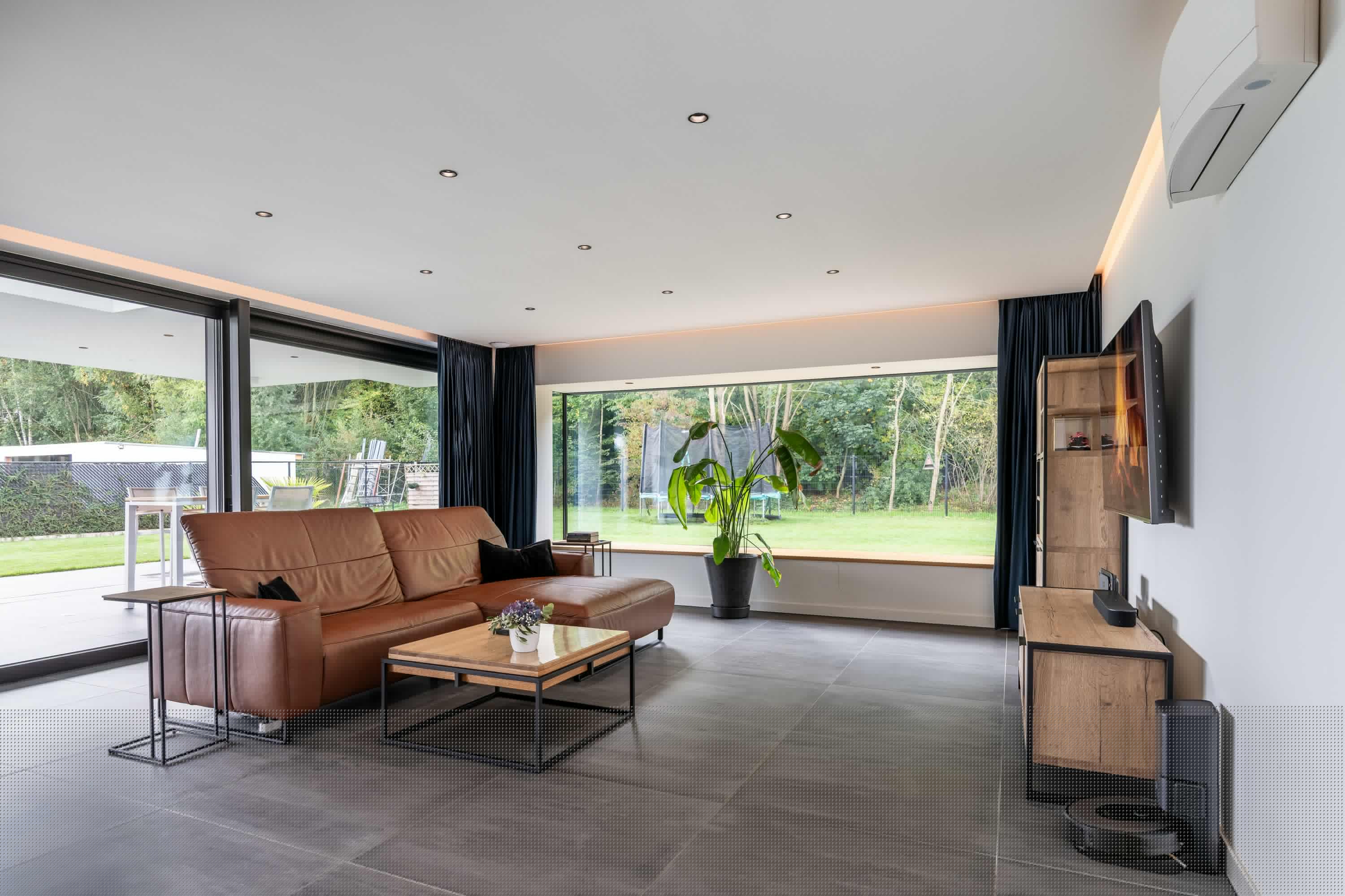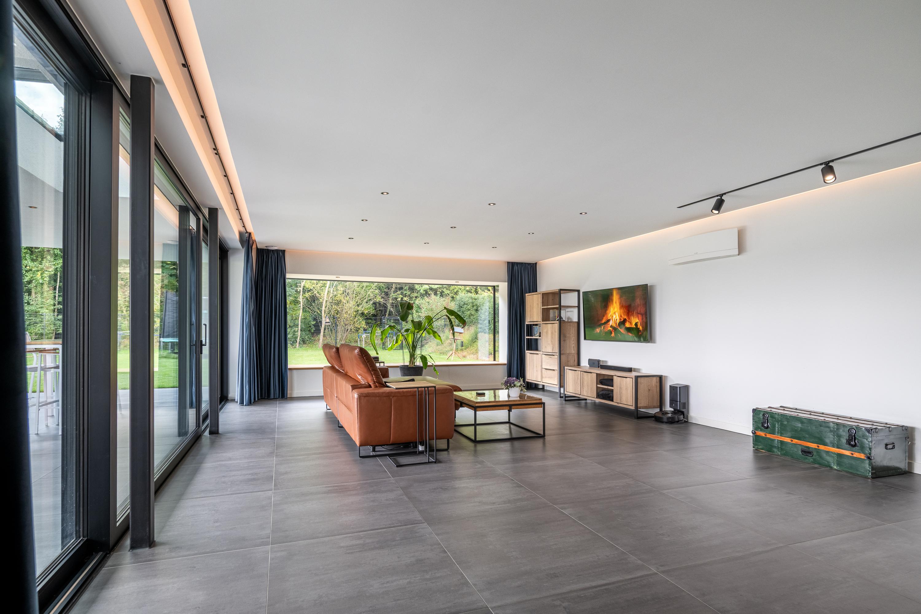 De woonkamer is royaal van opzet en geniet veel lichtinval dankzij de grote raampartijen rondom. Het vele glas zorgt niet alleen voor een prachtige natuurlijke lichtinval, maar ook voor een optimaal zicht op de tuin.