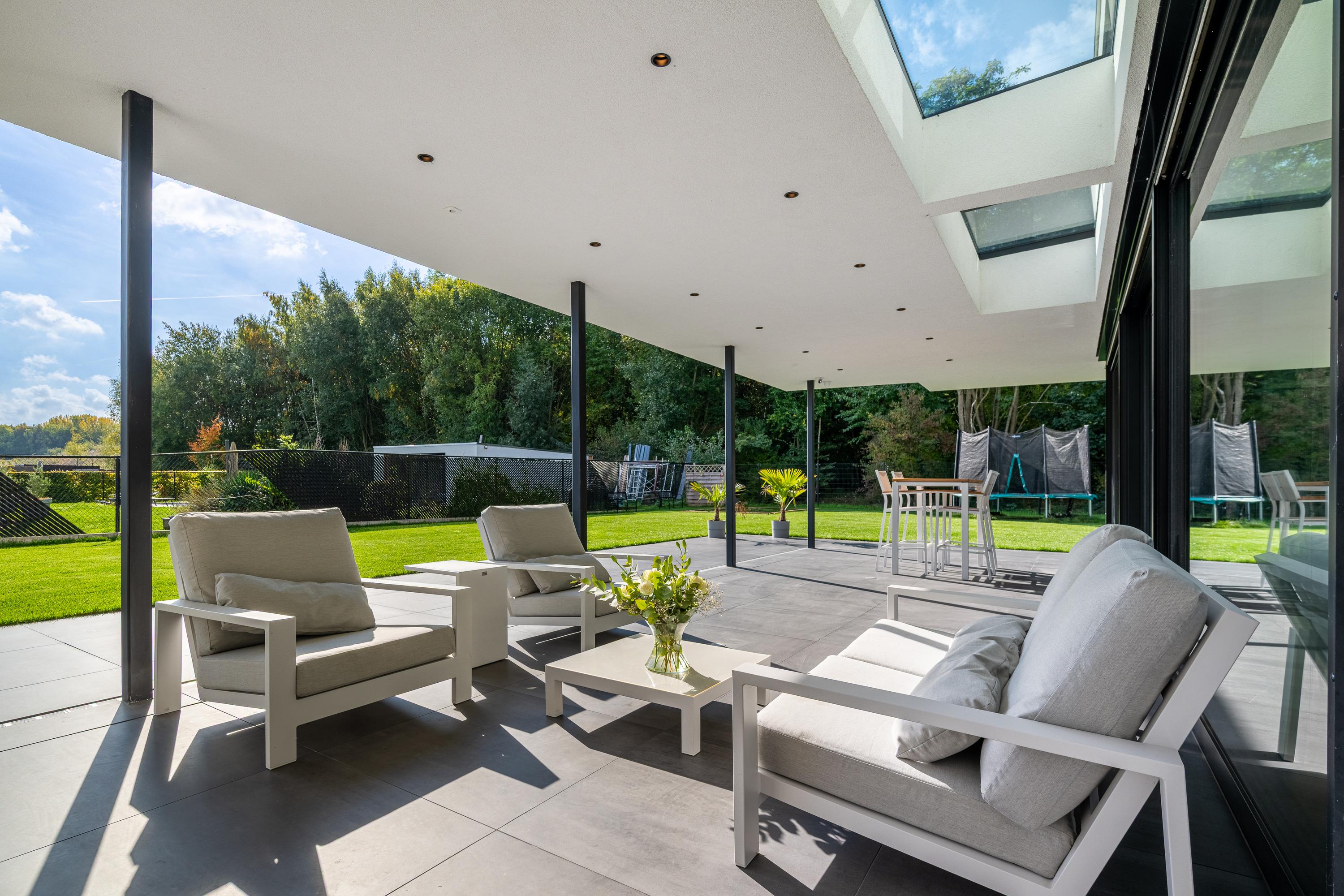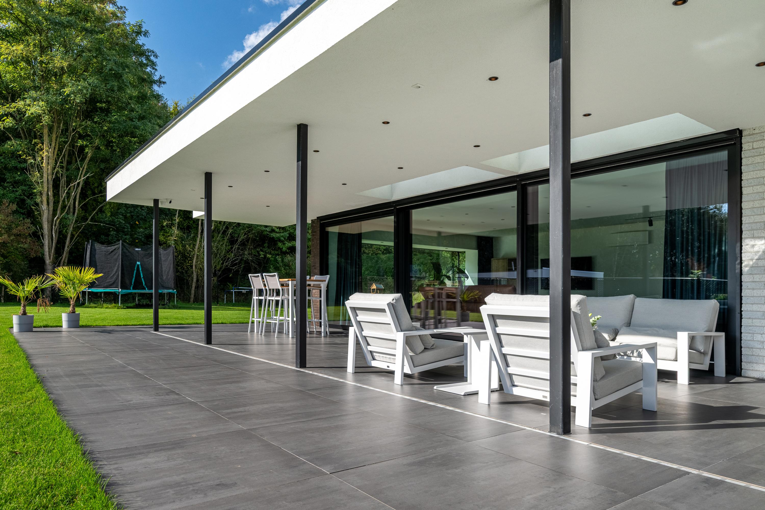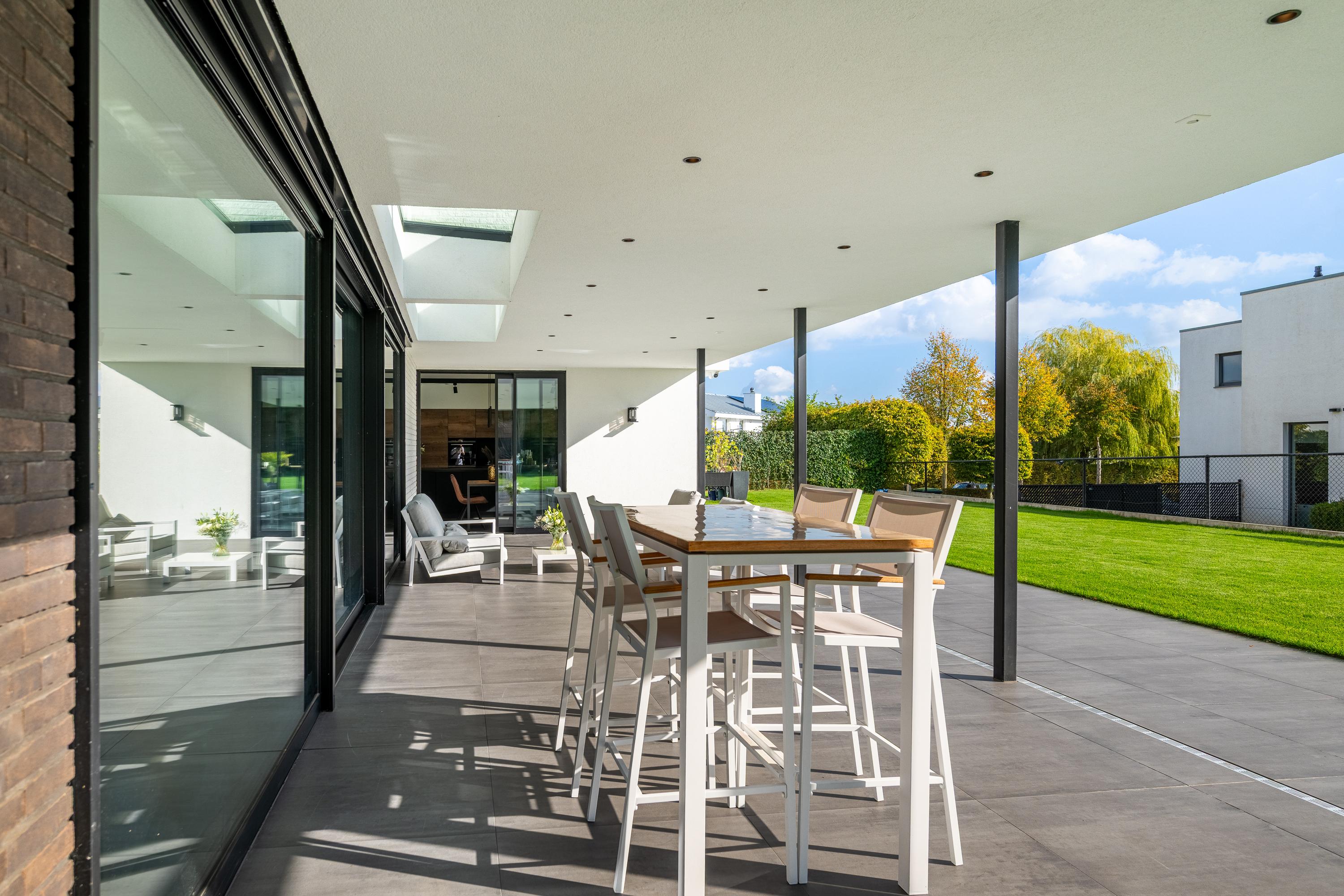 Dankzij de ruime overkapping geniet men hier van schaduw op zonnige dagen en comfortabele beschutting bij minder weer. De inbouwspots in het plafond zorgen 's avonds voor een warme, uitnodigende sfeer.