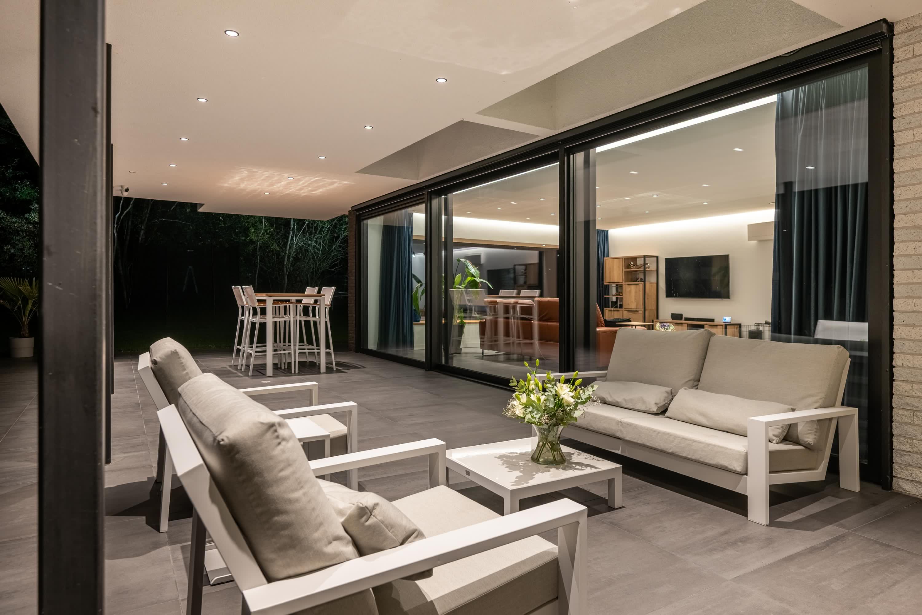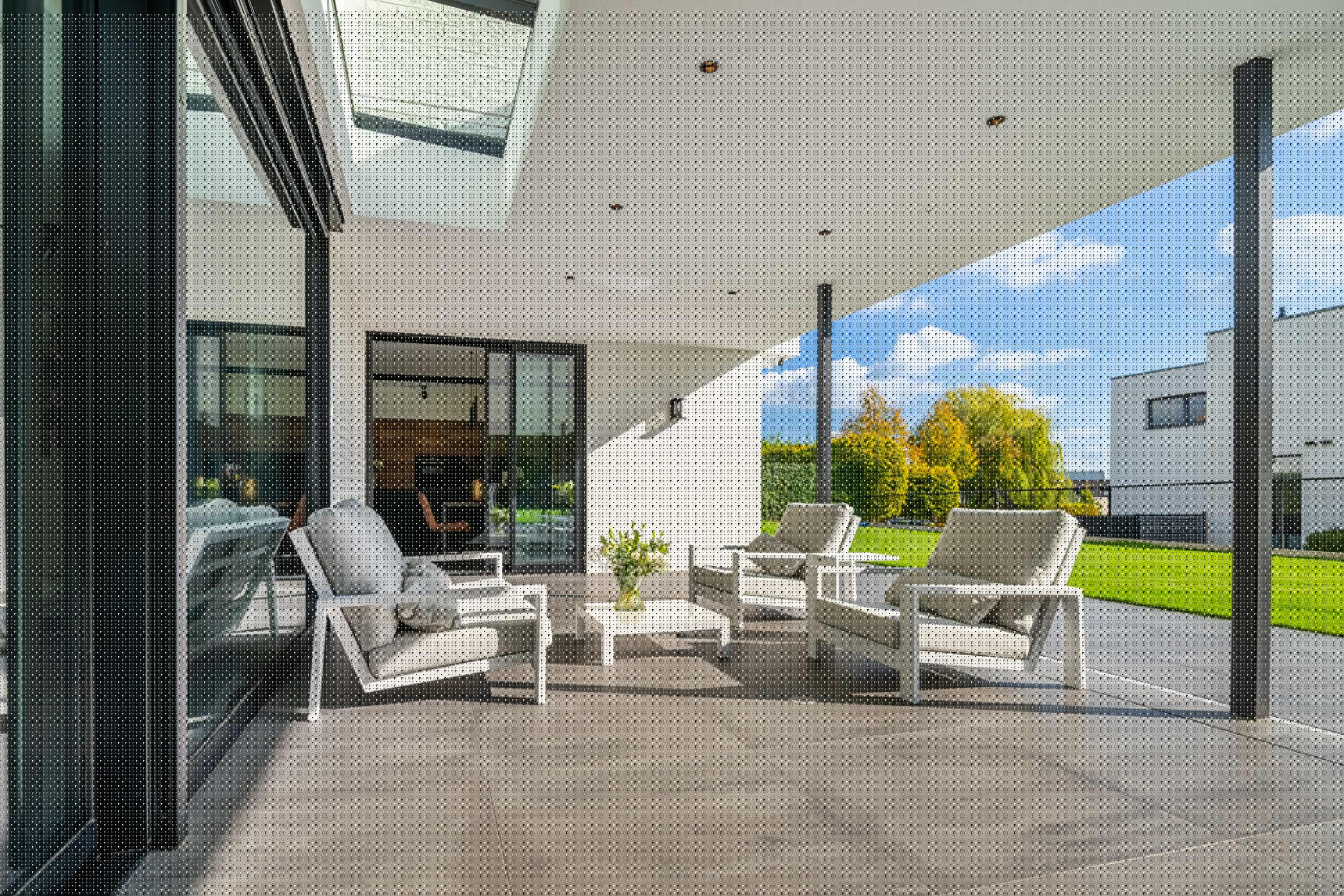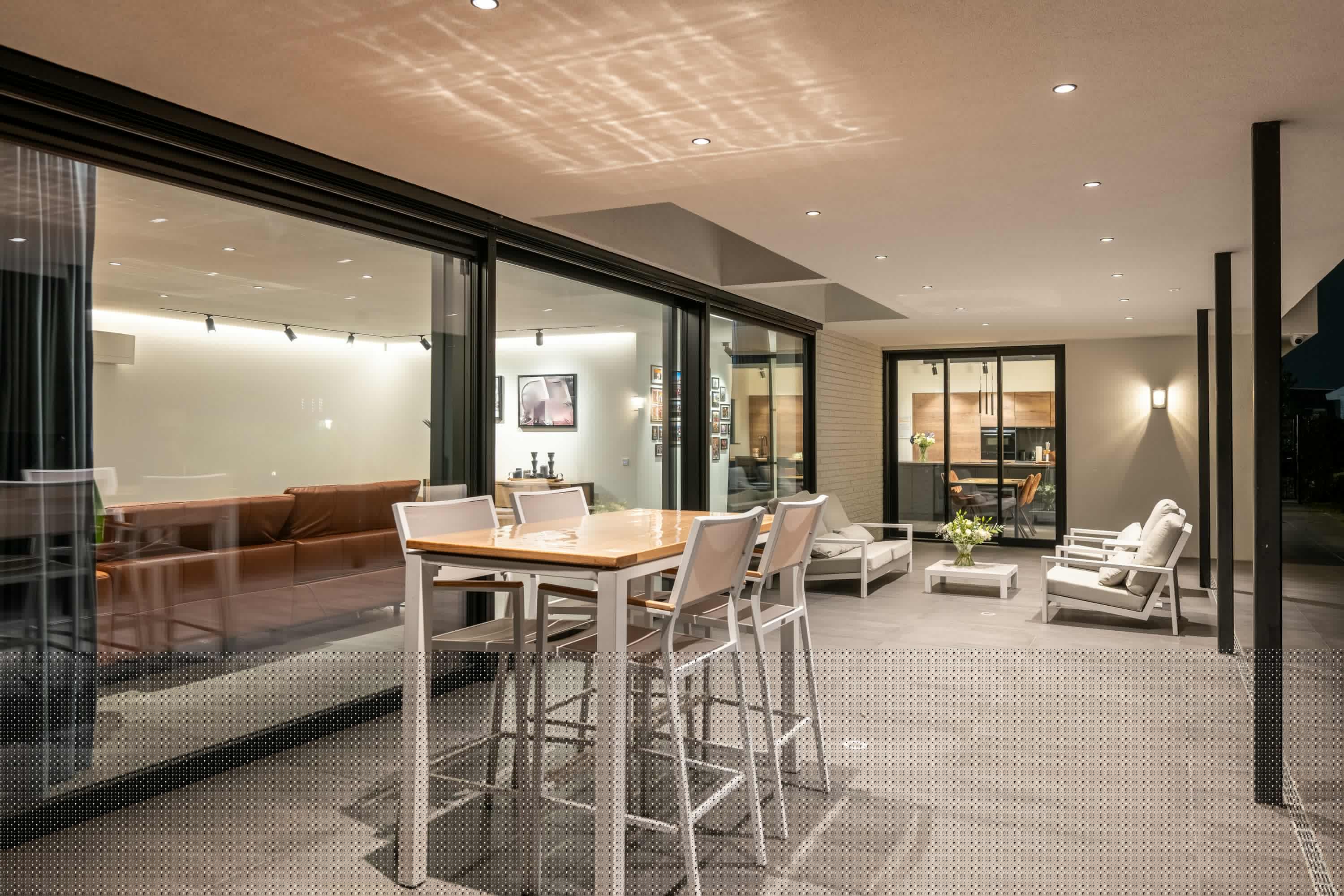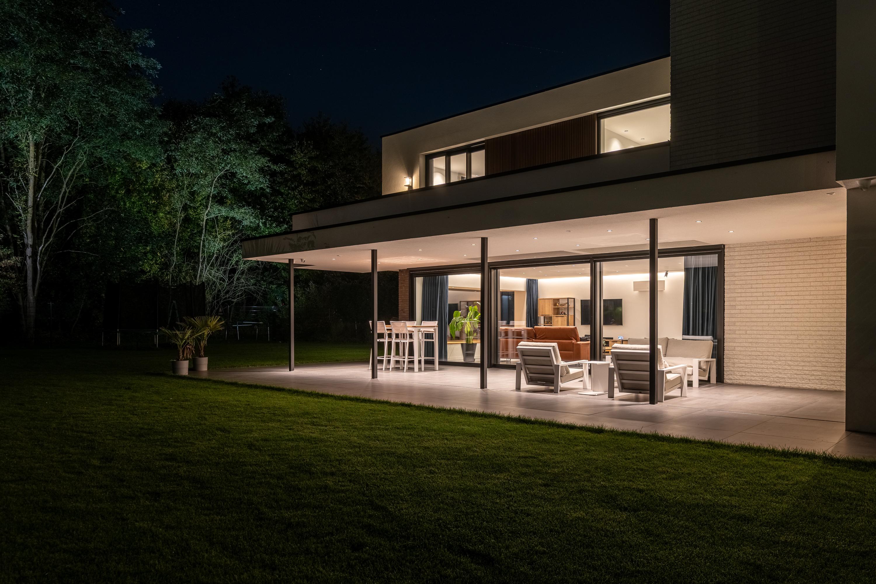 Dankzij de ruime overkapping geniet men hier van schaduw op zonnige dagen en comfortabele beschutting bij minder weer. De inbouwspots in het plafond zorgen 's avonds voor een warme, uitnodigende sfeer.