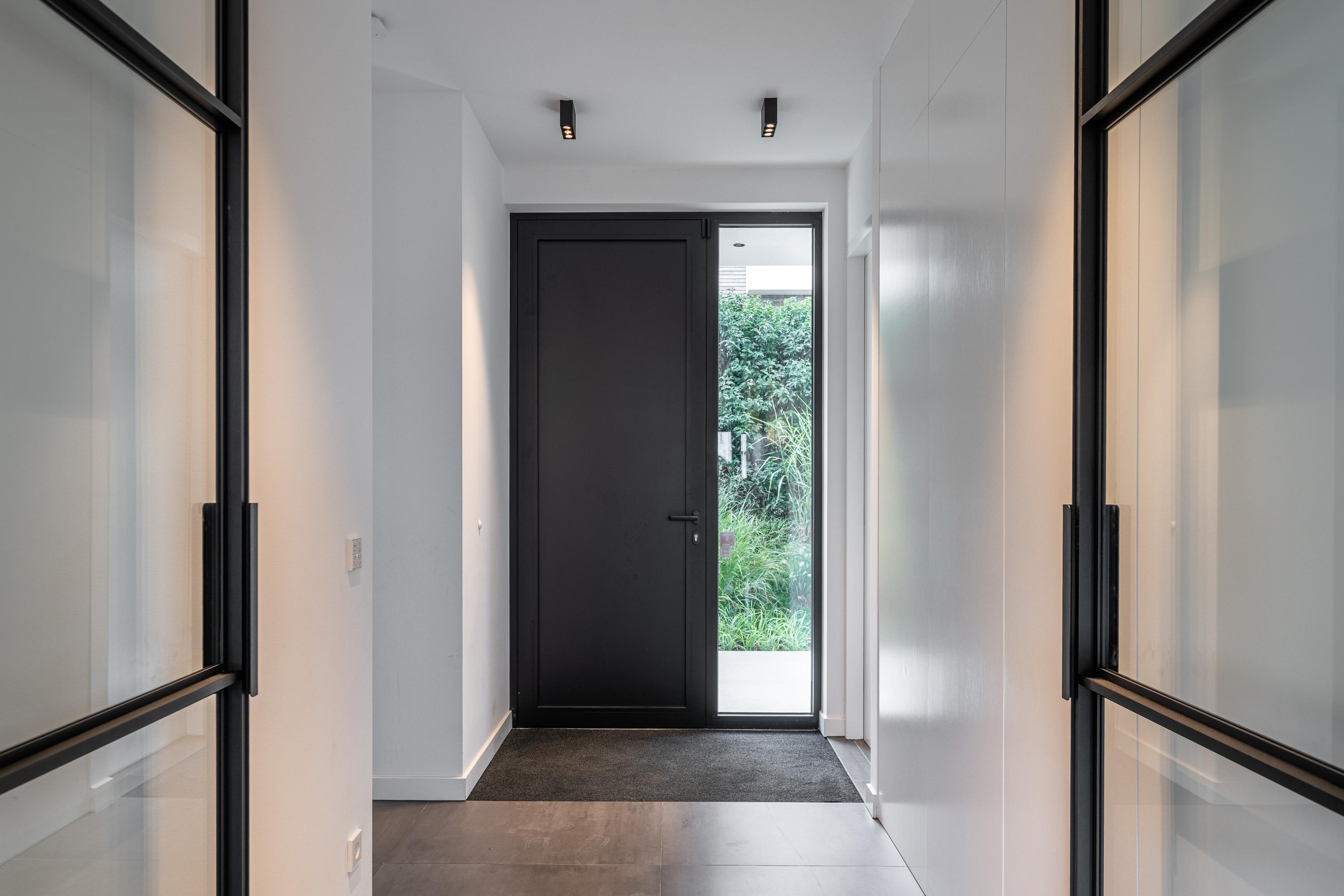 The spacious entrance hall features two aluminum pivot doors that provide access to the living area and the loft with large windows. The hall also provides access to the toilet with a floating toilet and sink. There is also access to the office space on the ground floor. Ideal for people who want to create a home office or a bedroom on the ground floor for lifetime living.