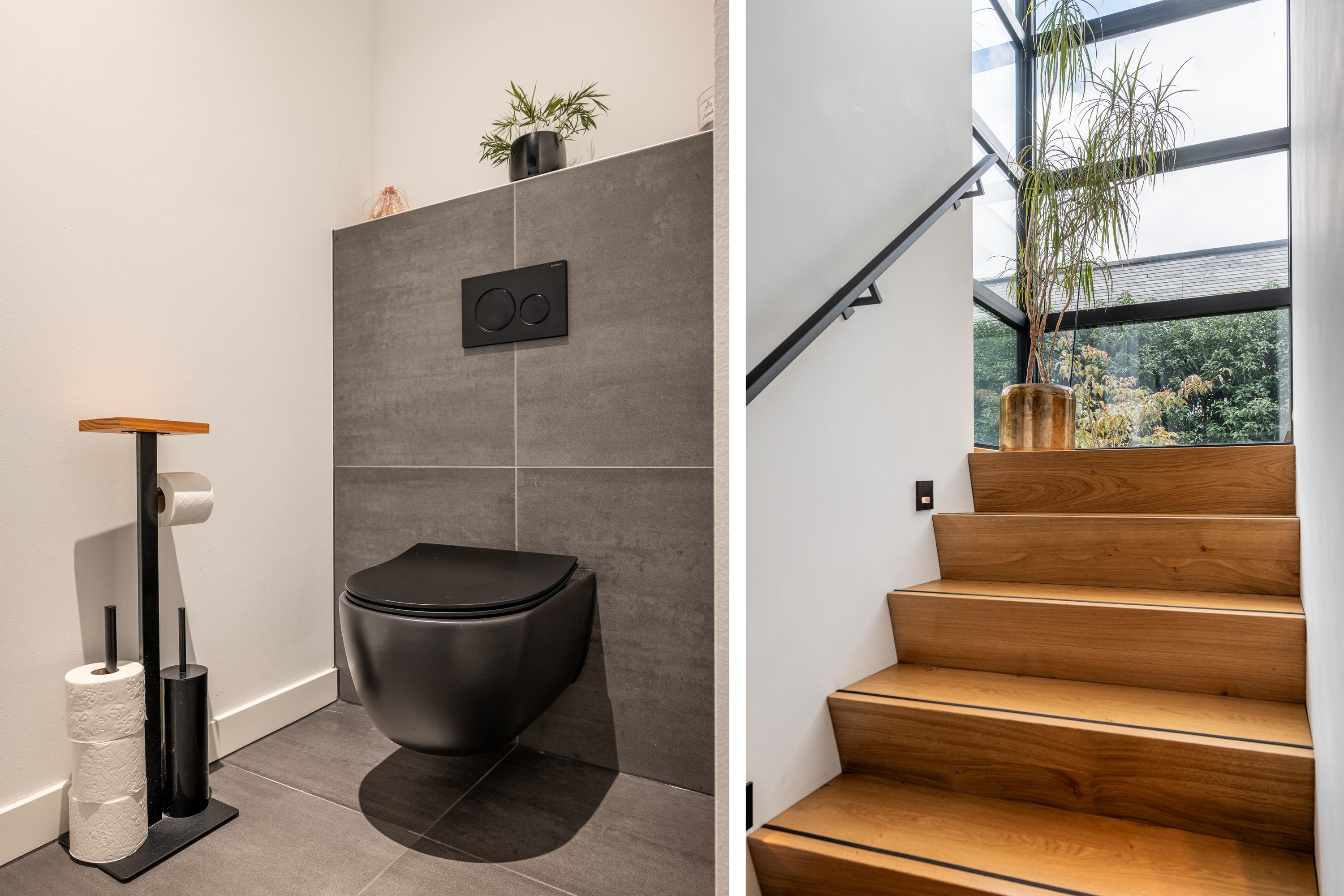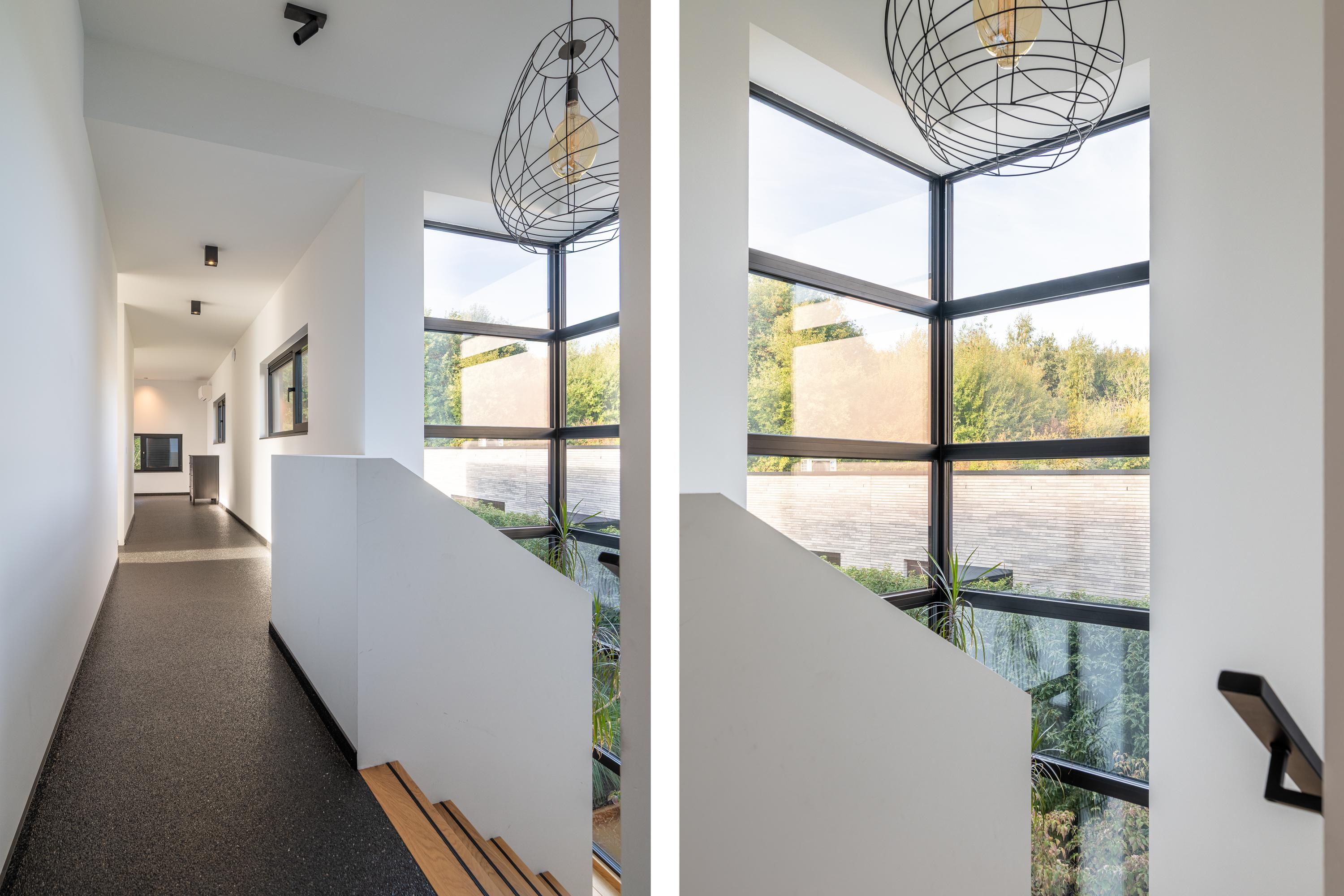 Via een stijlvolle betontrap bekleed met houten tredes, omringd door royale glaspartijen en een prachtig uitzicht op de bosrand, bereikt u de eerste verdieping.