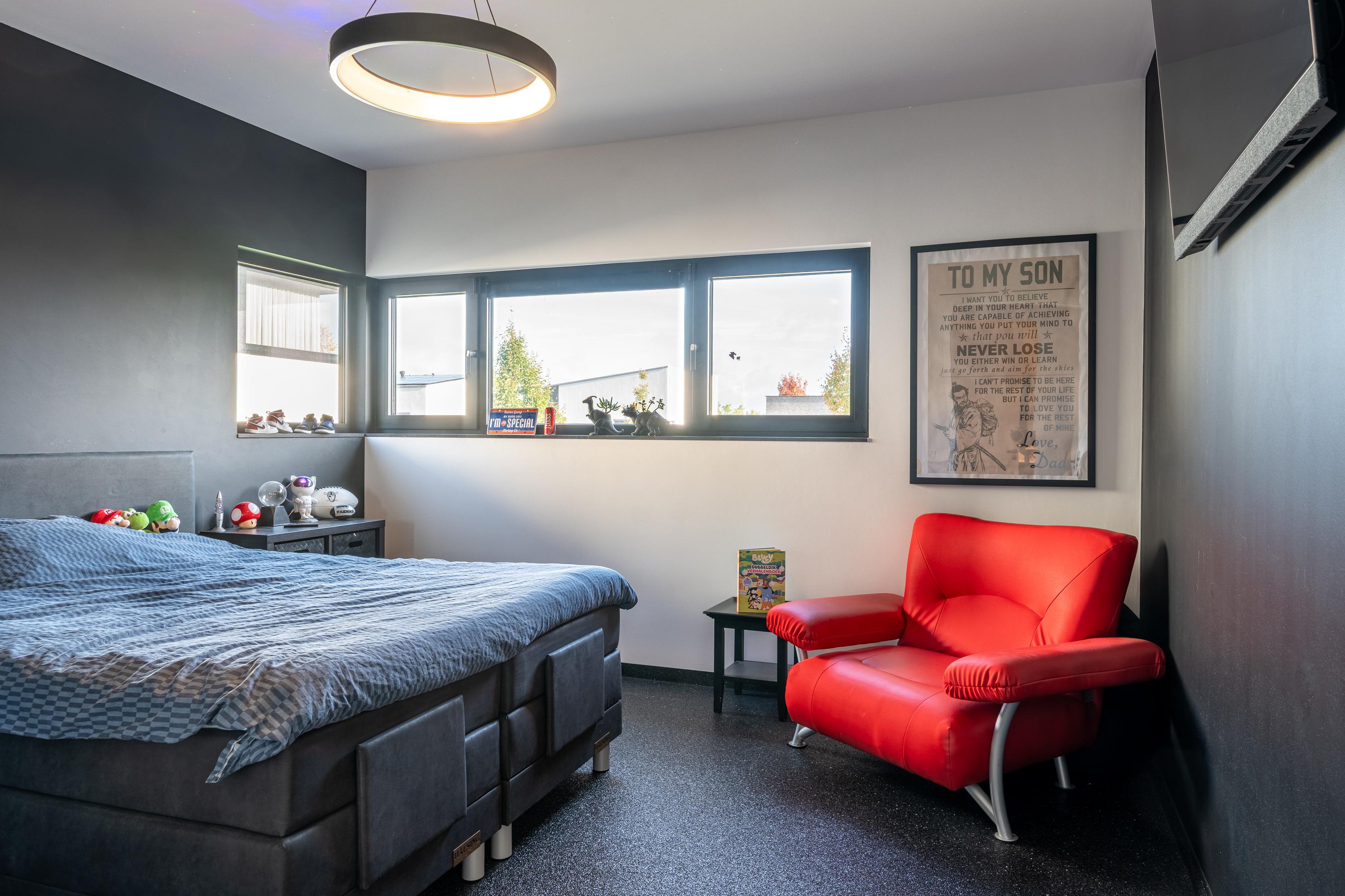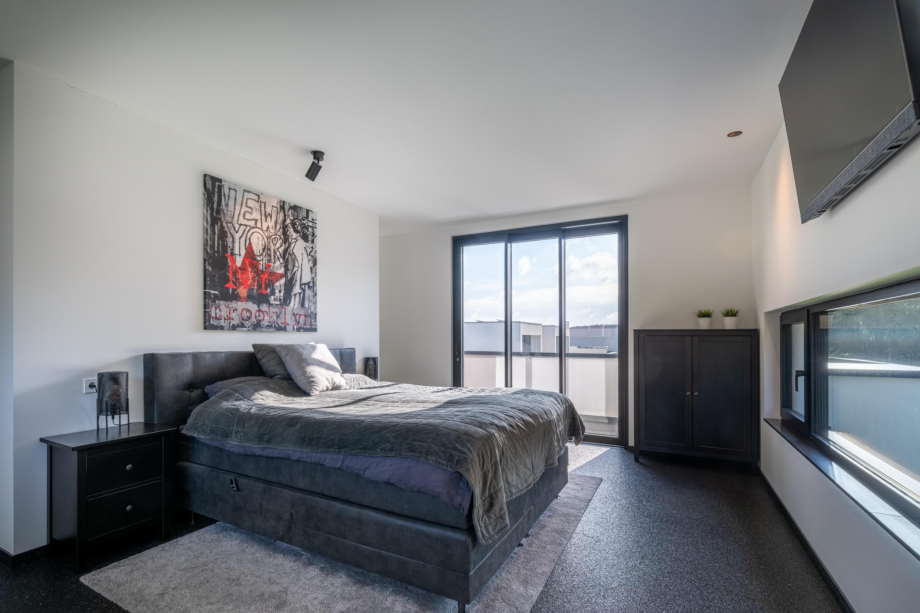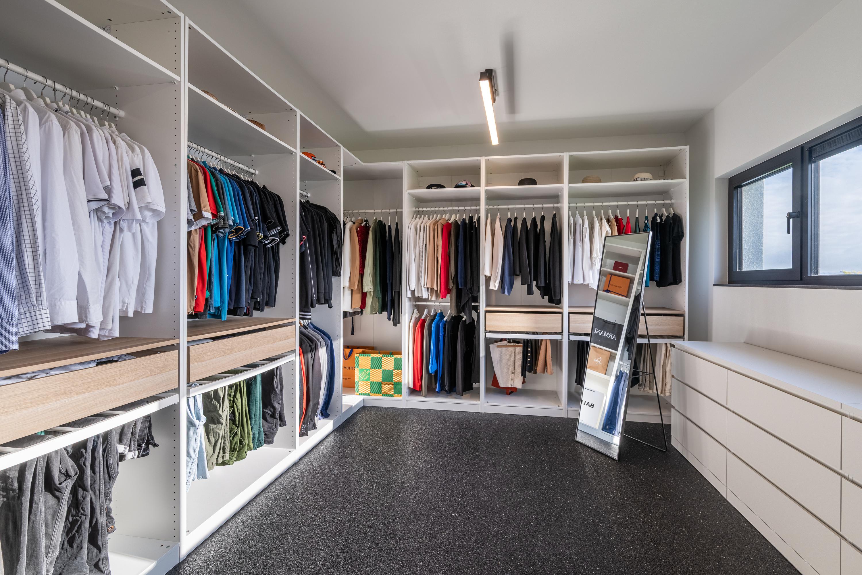 De masterbedroom is indrukwekkend in omvang en vormt een ware privésuite. De kamer biedt meer dan genoeg plek voor een royaal bed en loopt elegant over in een royale walk-in closet — een droom voor liefhebbers.