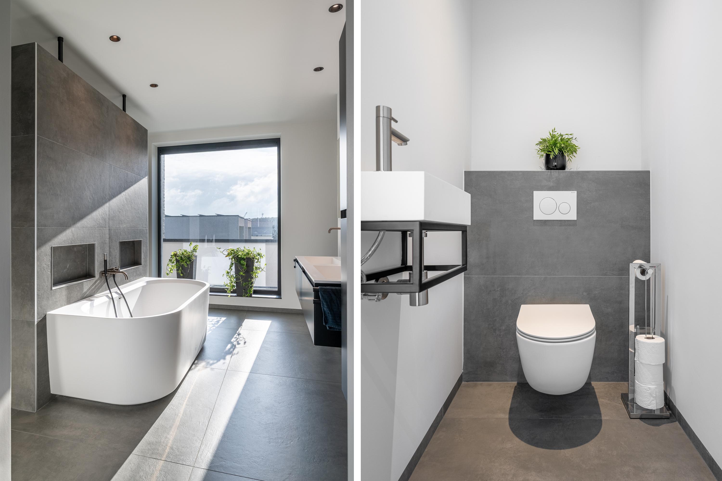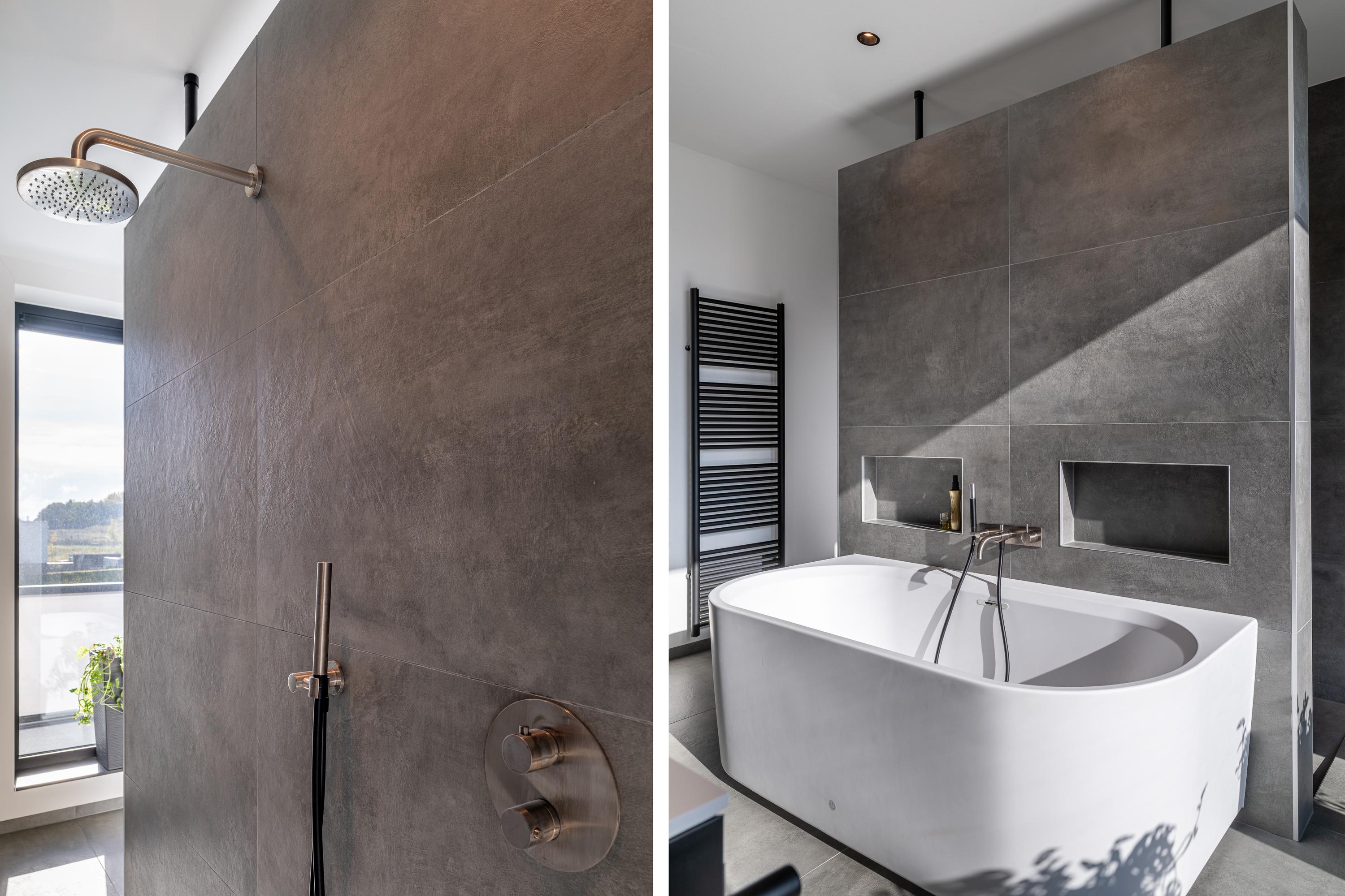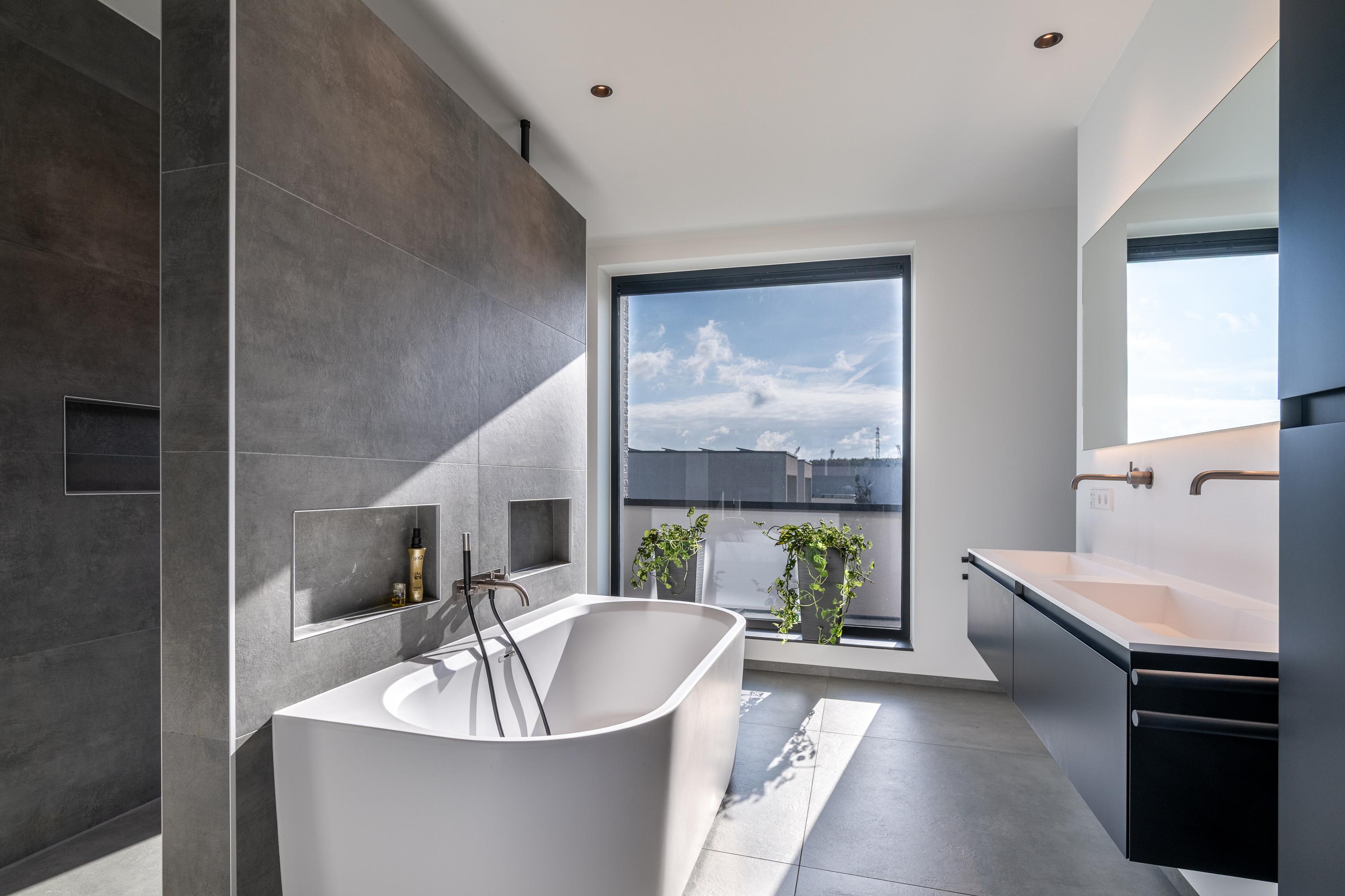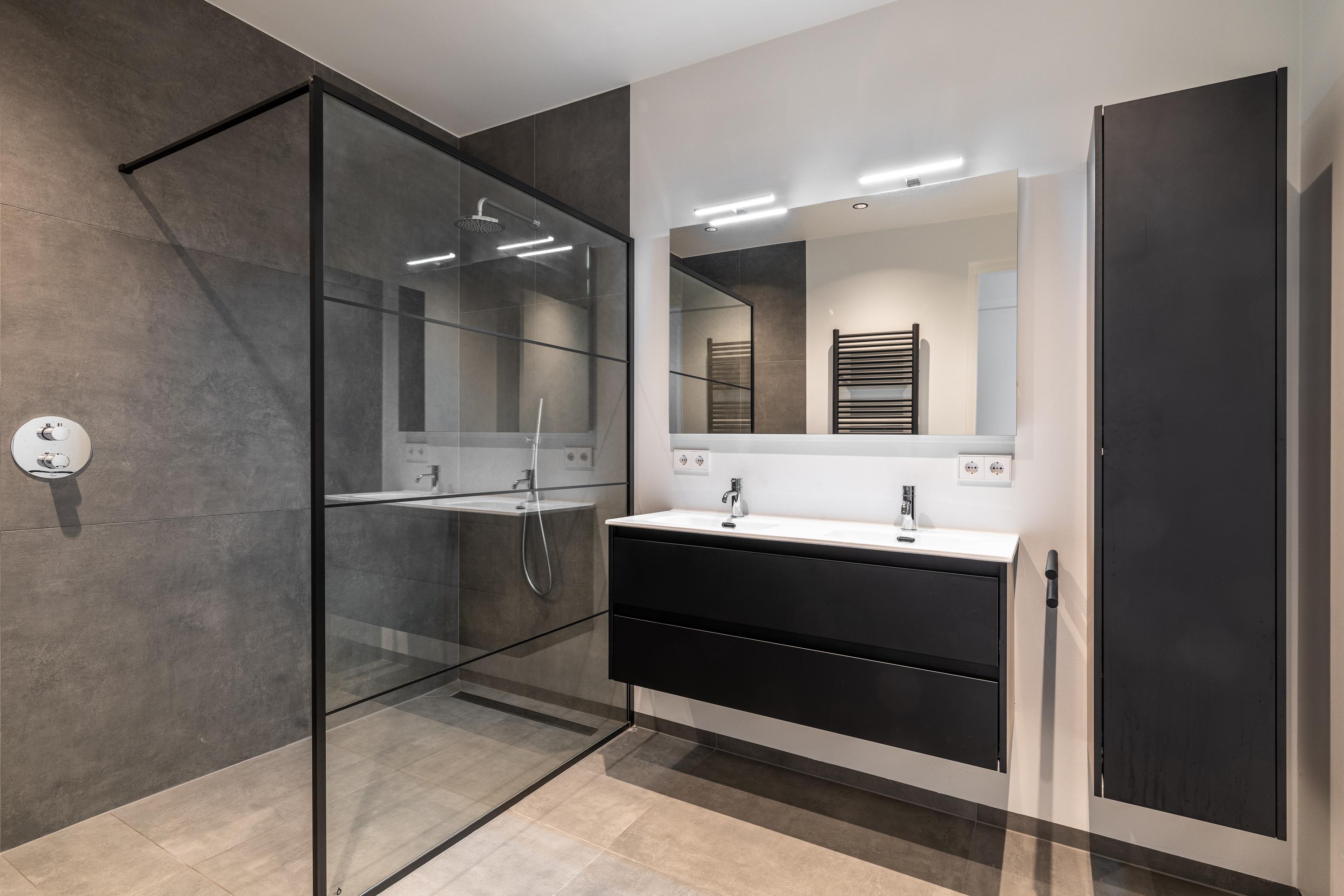 De tweede badkamer, bereikbaar vanaf de overloop, is voorzien van een grote inloopdouche met glazen wand en dubbele wastafel met meubel en spiegel. Tevens is er nog een separate toiletruimte met toilet.