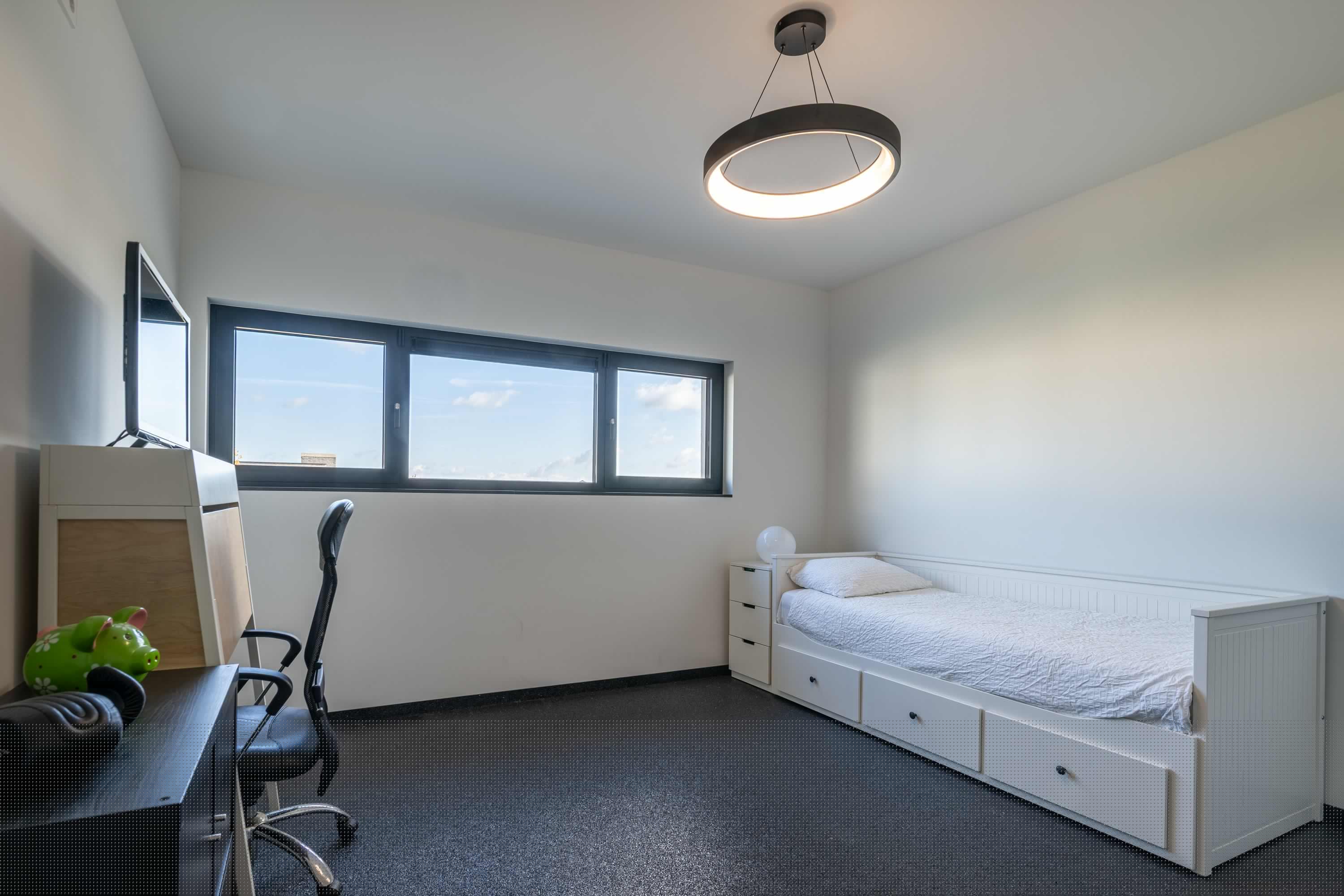 Aan de voorzijde is de slaapvleugel gelegen met maar liefst drie volwaardige slaapkamers, stuk voor stuk ruim van opzet en heerlijk licht dankzij de grote raampartijen. De strakke afwerking met een grindvloer in alle kamers zorgt voor een rustige, uniforme uitstraling en is bovendien onderhoudsvriendelijk en duurzaam.