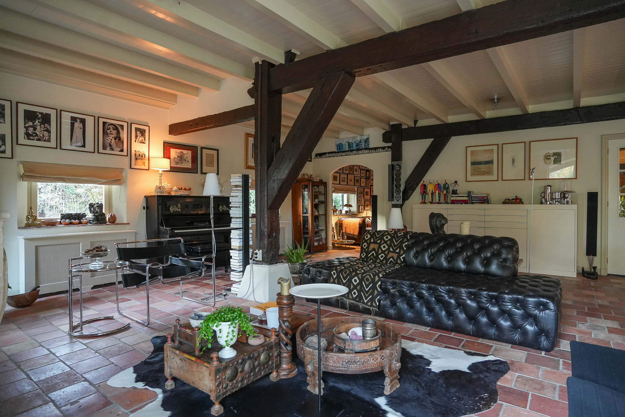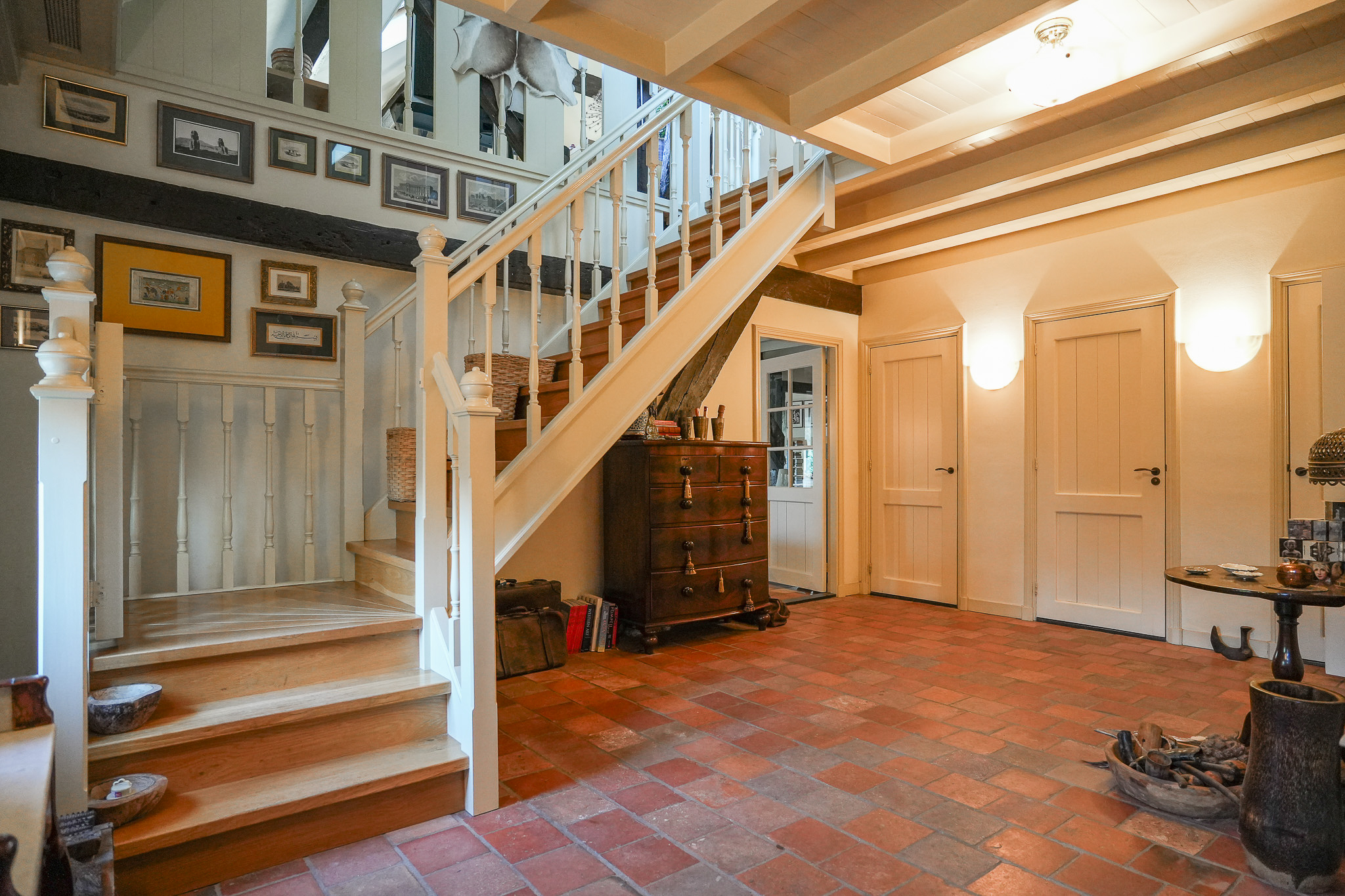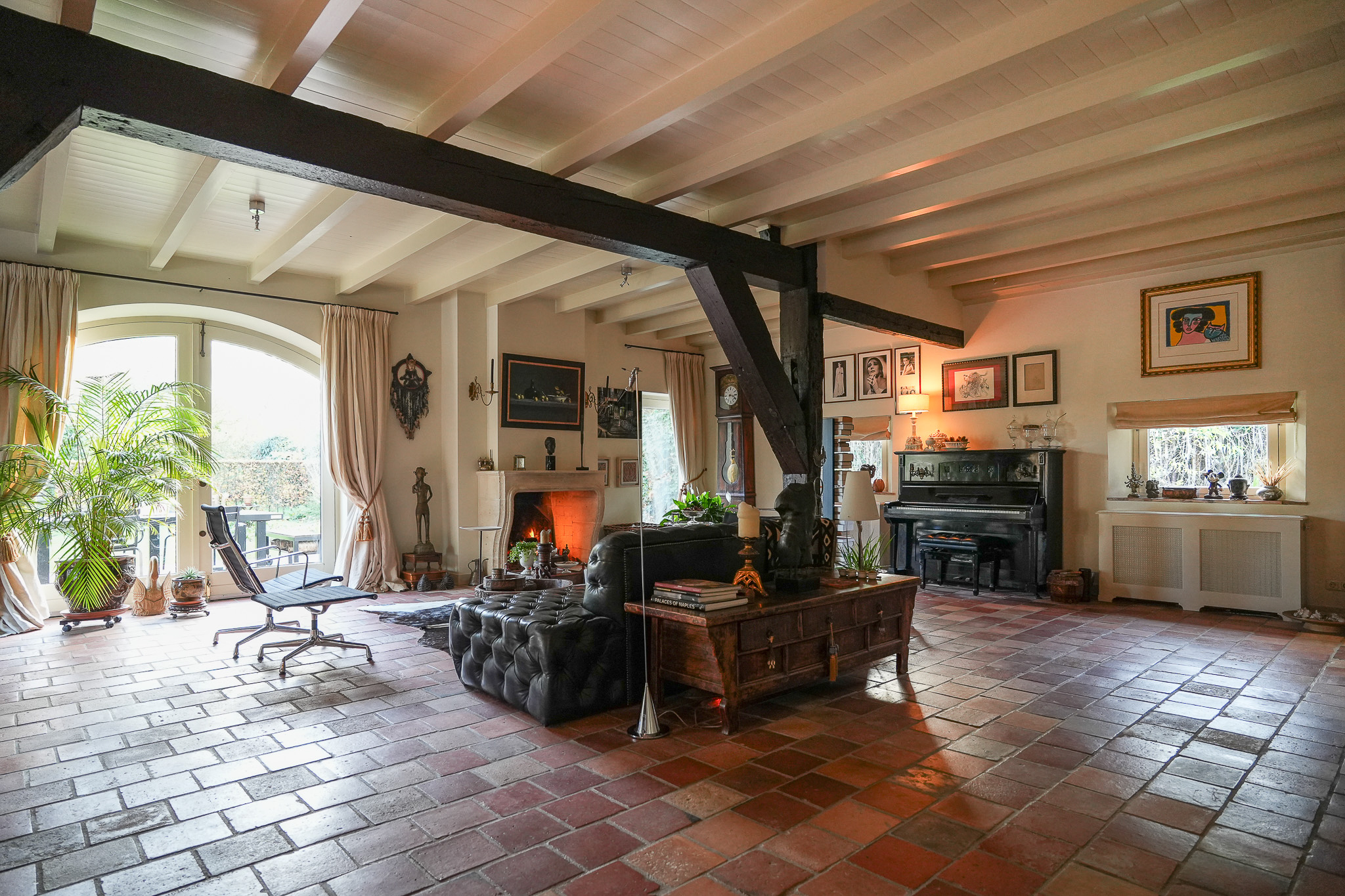 The entrance on the driveway side leads into a generous hallway with cloakroom and toilet. A glazed door opens into the former barn, now a spacious living room. The impressive sandstone fireplace with open hearth, the timber trusses and a floor laid with antique red tilestones create a warm and inviting atmosphere. The floor here — as in the hall — benefits from underfloor heating.
