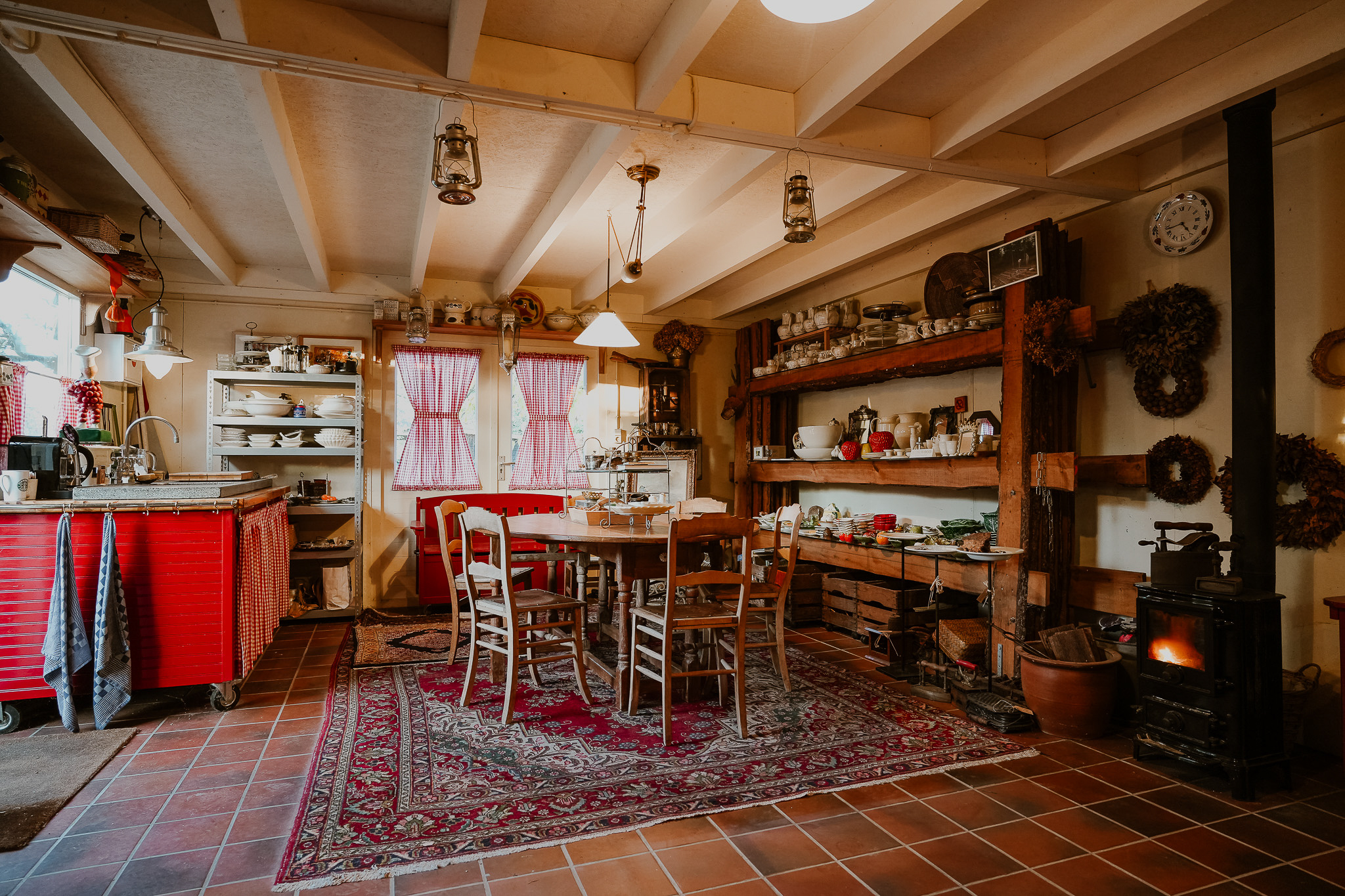 At the back of the garden stands an insulated outbuilding with wood-burning stove and kitchenette. The owners have used this space for selling brocante items. The outbuilding features French doors opening onto a 10 m² covered terrace — ideal for guests, teenagers, an atelier or a quiet workspace.